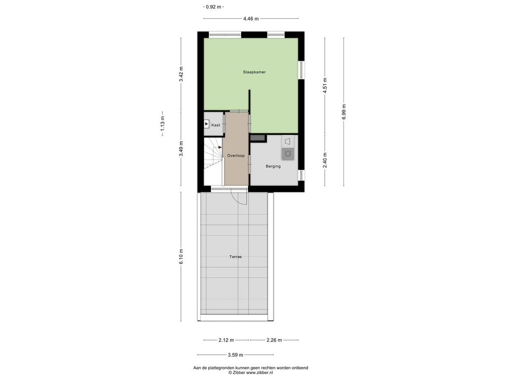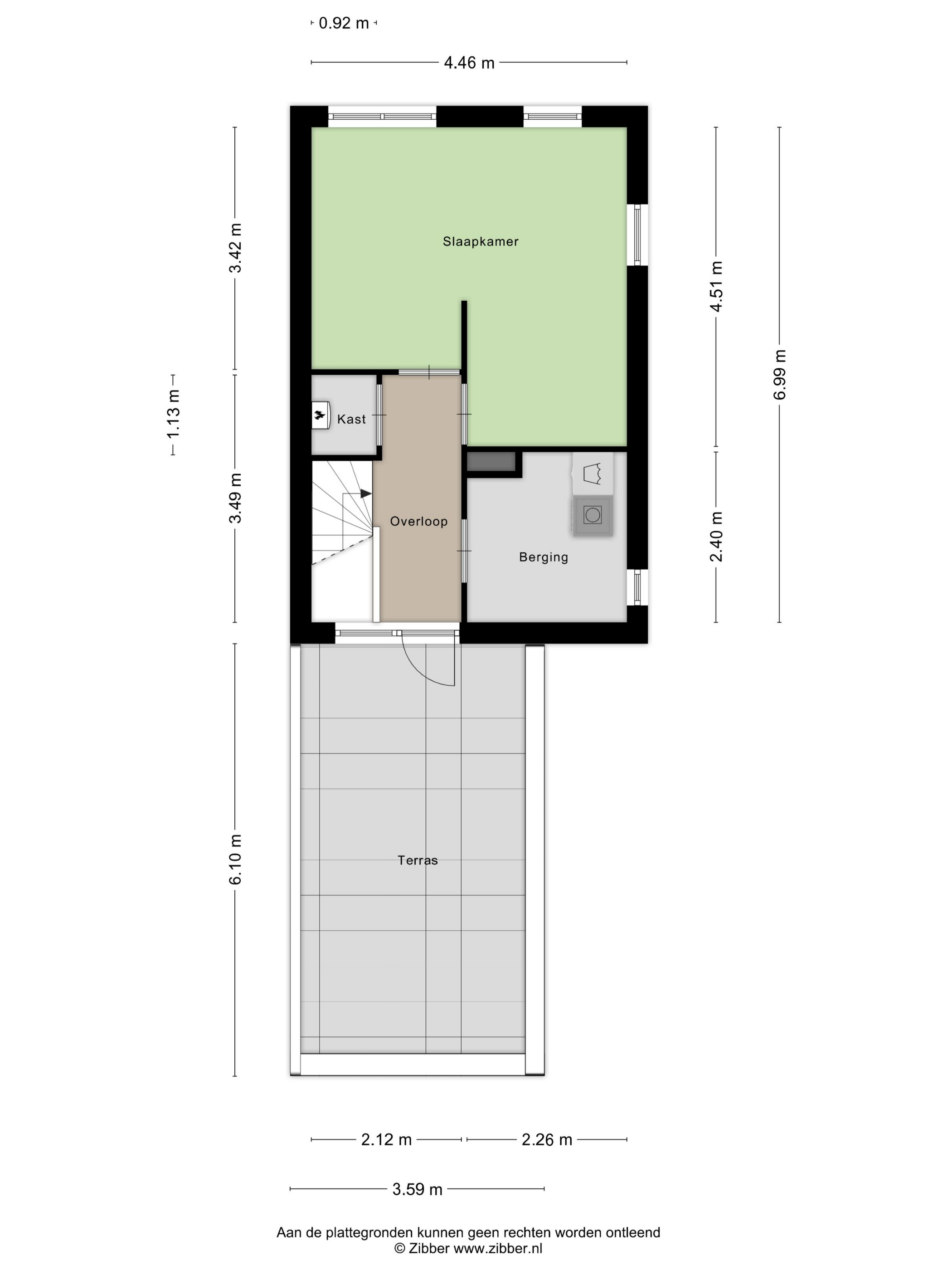 De tweede verdieping is oorspronkelijk ingedeeld met twee slaapkamers, maar de huidige bewoners hebben de tussenwand verwijderd waardoor er nu één ruime slaapkamer van circa vijftien vierkante meter is ontstaan. Uiteraard is de oorspronkelijke indeling eenvoudig terug te brengen. Op deze verdieping zijn bovendien de aansluitingen voor de wasmachine en droger aanwezig, evenals de opstelplaats van de cv-ketel. Ook heeft u hier toegang tot een zonnig dakterras dat op het zuiden en zuidwesten is gelegen.