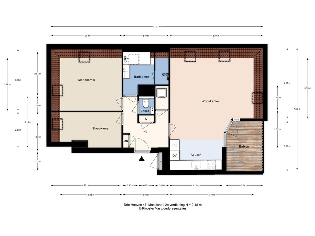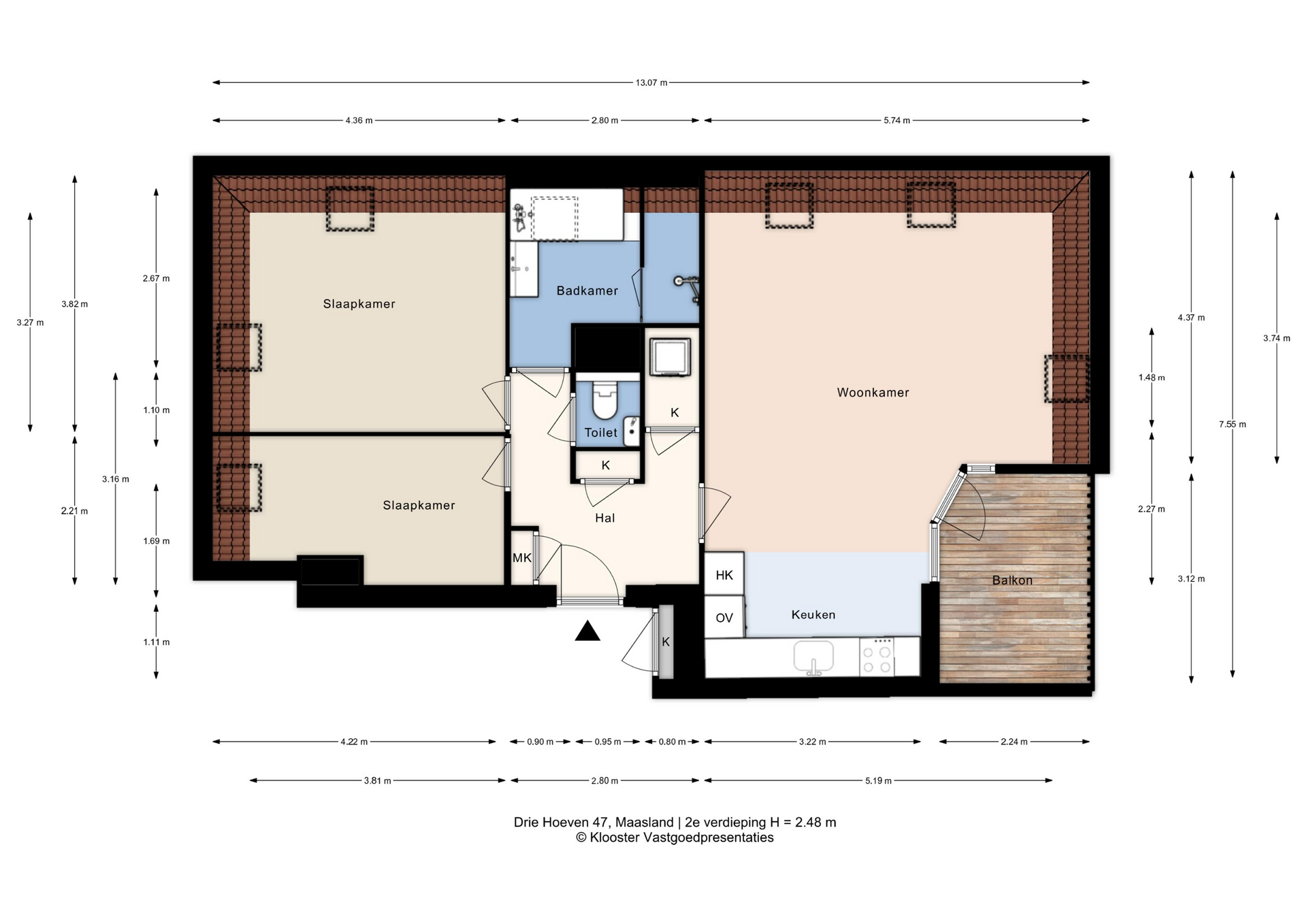 De woning beschikt over 67 m² woonoppervlakte, aangevuld met circa 13 m² extra vloeroppervlakte onder de schuine kap. Deze ruimte wordt volgens de meetinstructie niet meegerekend vanwege de lagere stahoogte, maar is in de praktijk uitstekend te gebruiken. Denk hierbij aan het plaatsen van kasten, een bed, werkplek of extra bergruimte. Hierdoor voelt de woning merkbaar ruimer aan en kun je de beschikbare ruimte optimaal benutten.