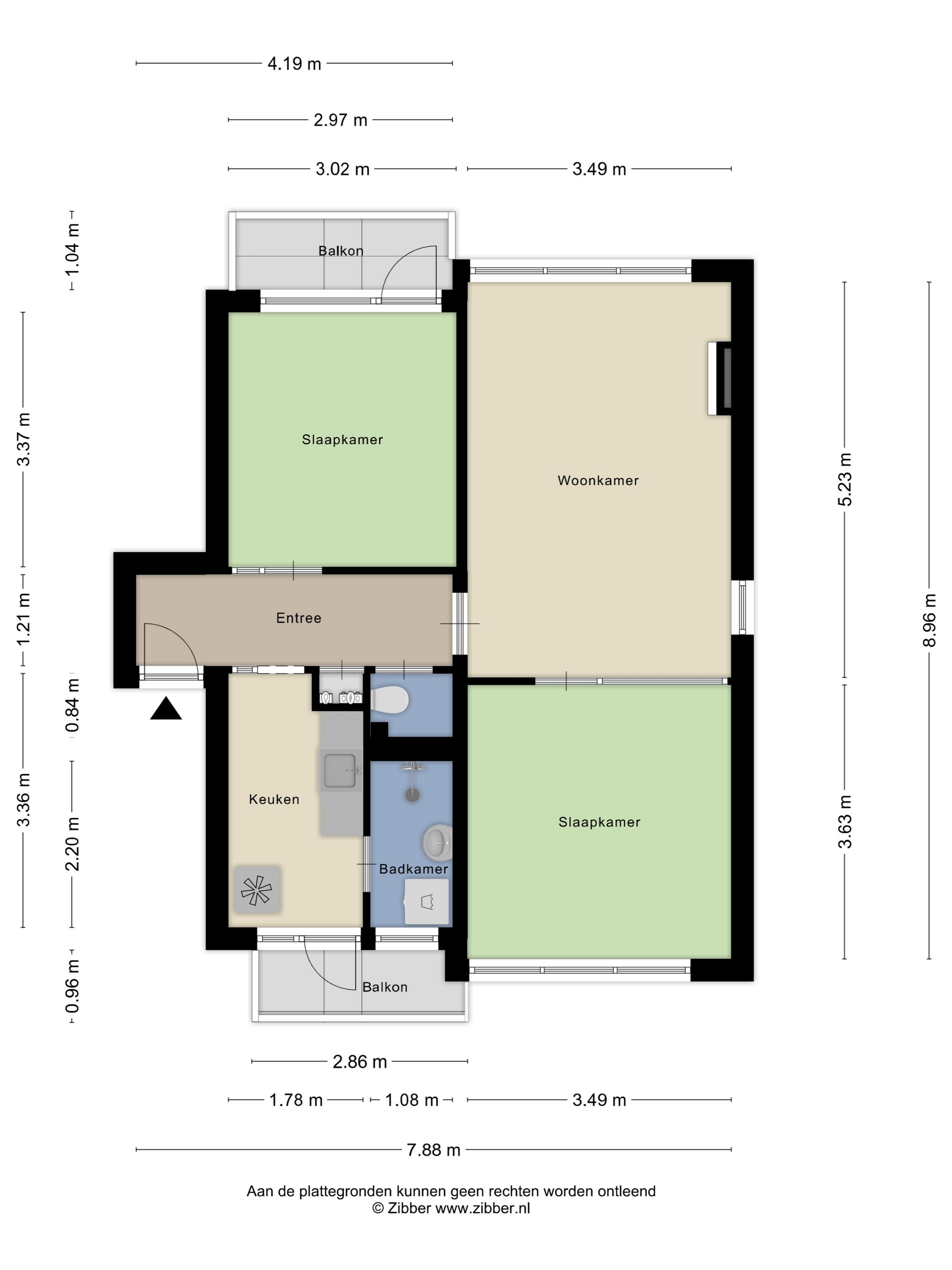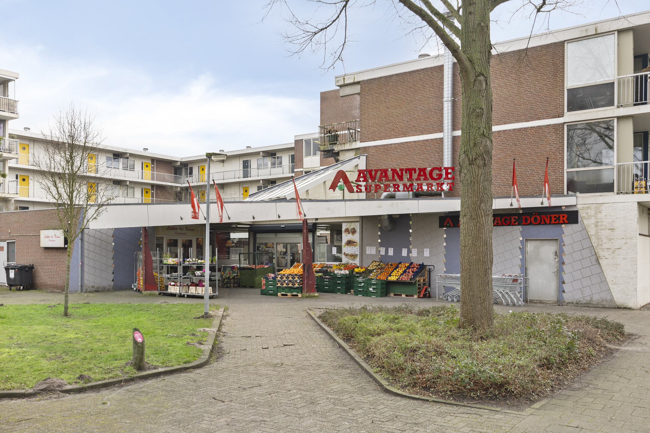 Aan de voorzijde van het appartement bevinden zich de keuken, de badkamer, het balkon en de eerste slaapkamer van circa 12 m², die is voorzien van grote raampartijen. De keuken is uitgerust met een koelkast,,vrieskast. De badkamer is driekwart betegeld en beschikt over een douche, wastafel en wasmachineaansluiting.
