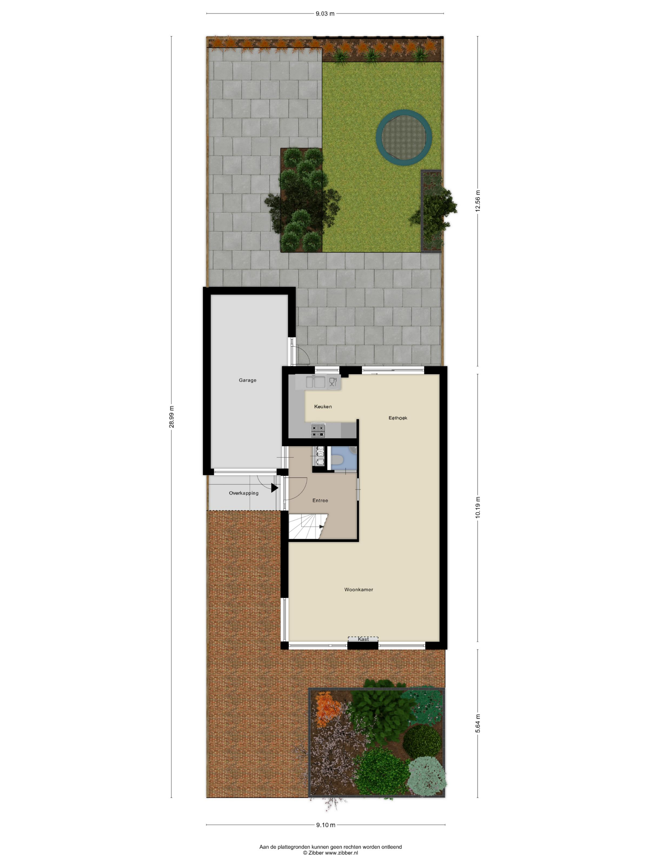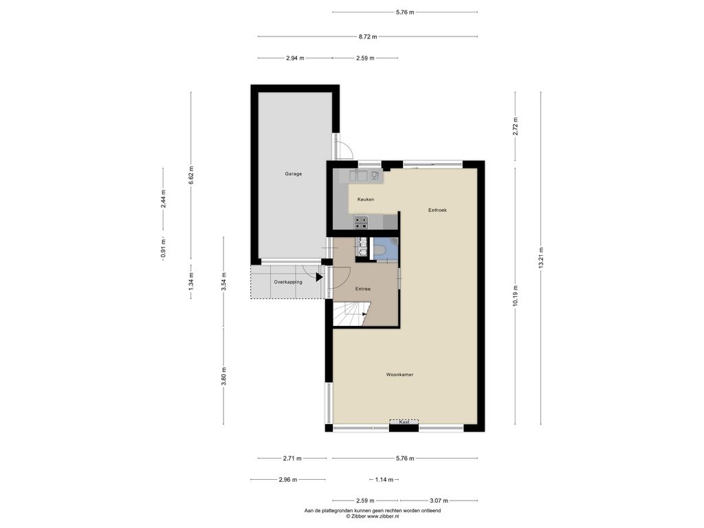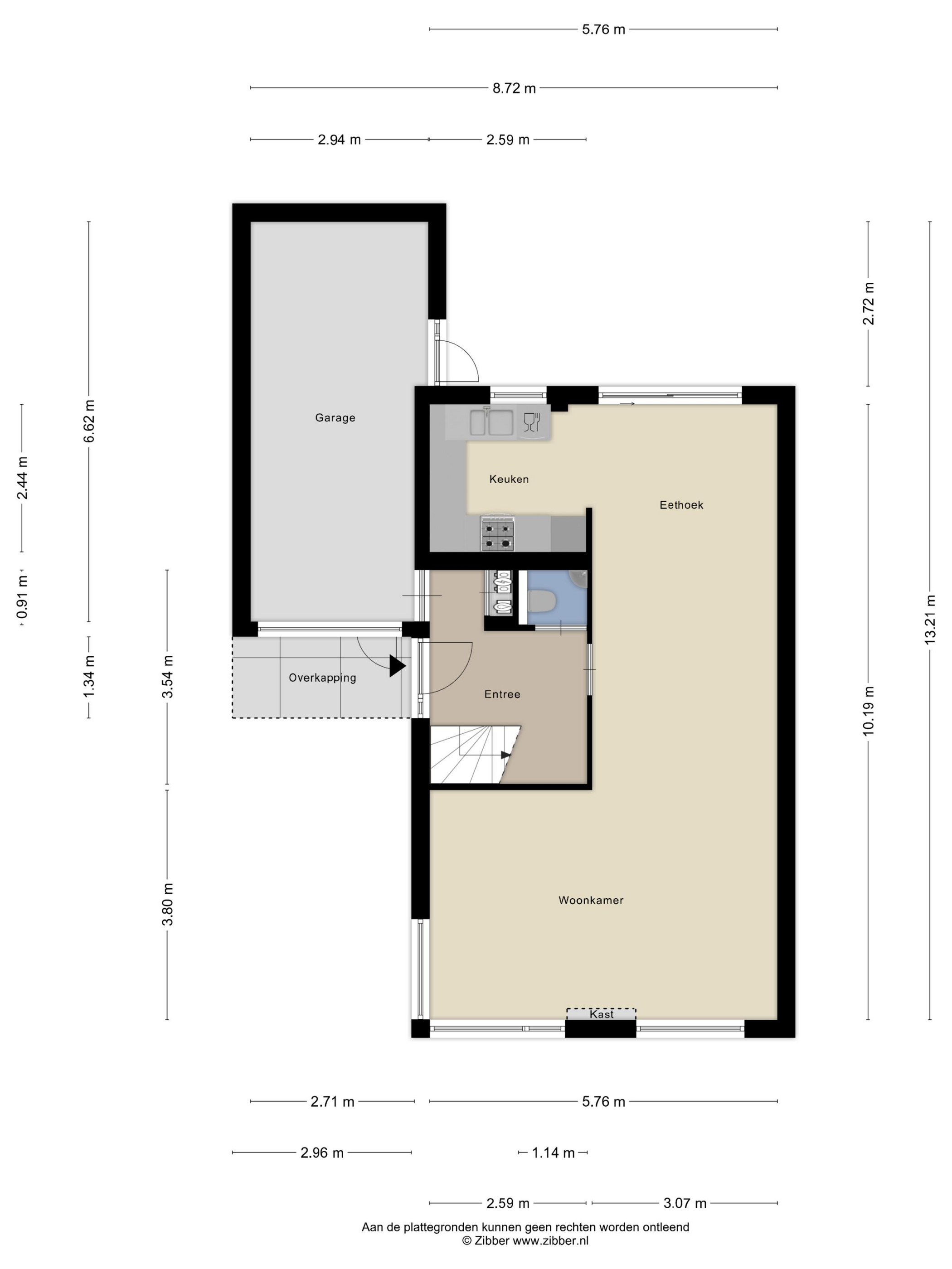 Aan de achterzijde van de woning ligt de keuken, die is uitgerust met een koel-vriescombinatie, Close-in Boiler, magnetron, oven, vaatwasser, afzuigkap en een vierpits gaskookplaat. Vanuit de eethoek geeft een schuifpui toegang tot de ruime achtertuin. Deze tuin ligt op het oosten, maar door de beperkte hoogte van de omliggende bebouwing kunt u hier vrijwel de hele dag van de zon genieten. Naast de woning bevindt zich tevens de royale garage van 19 m², die veel extra bergruimte biedt.