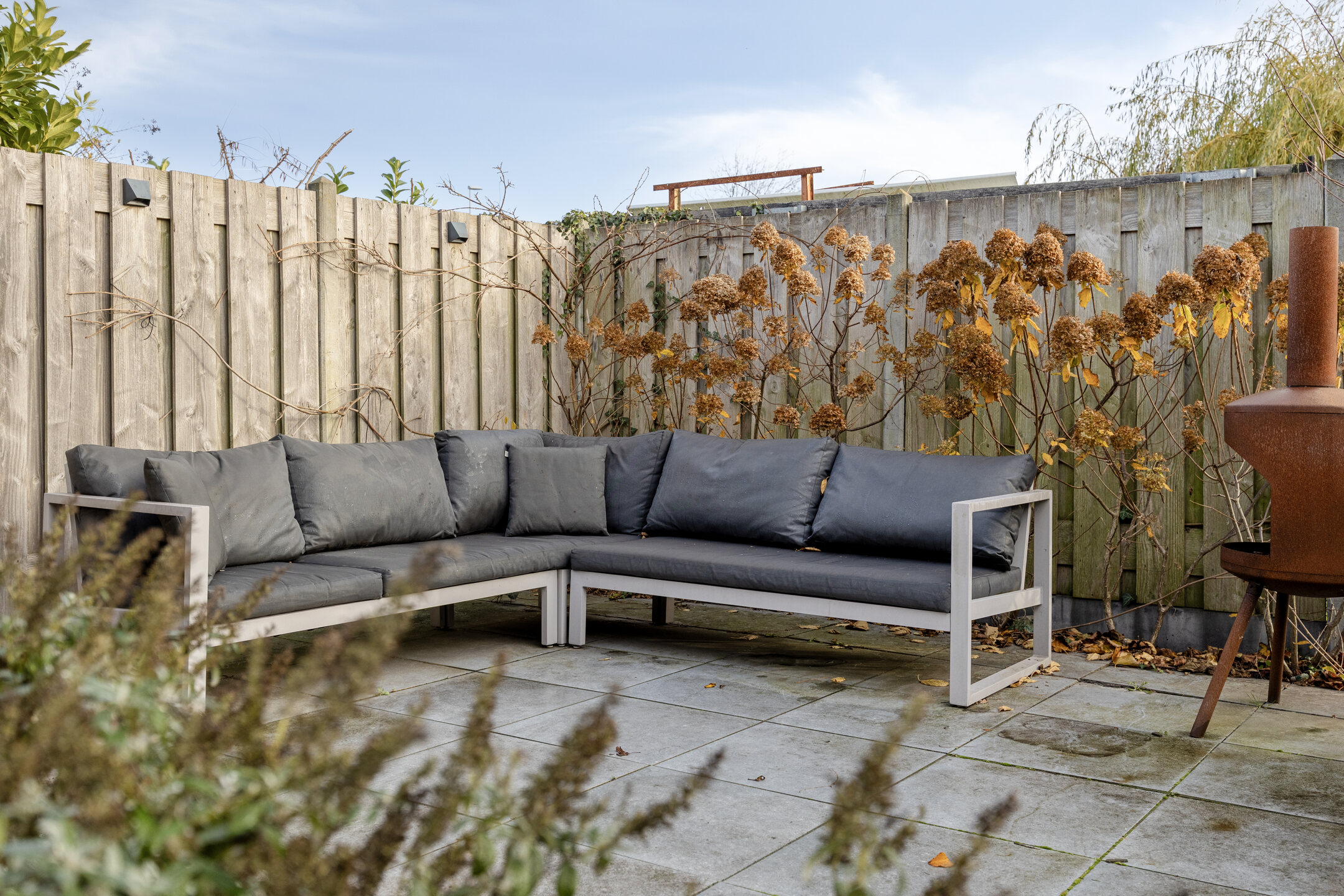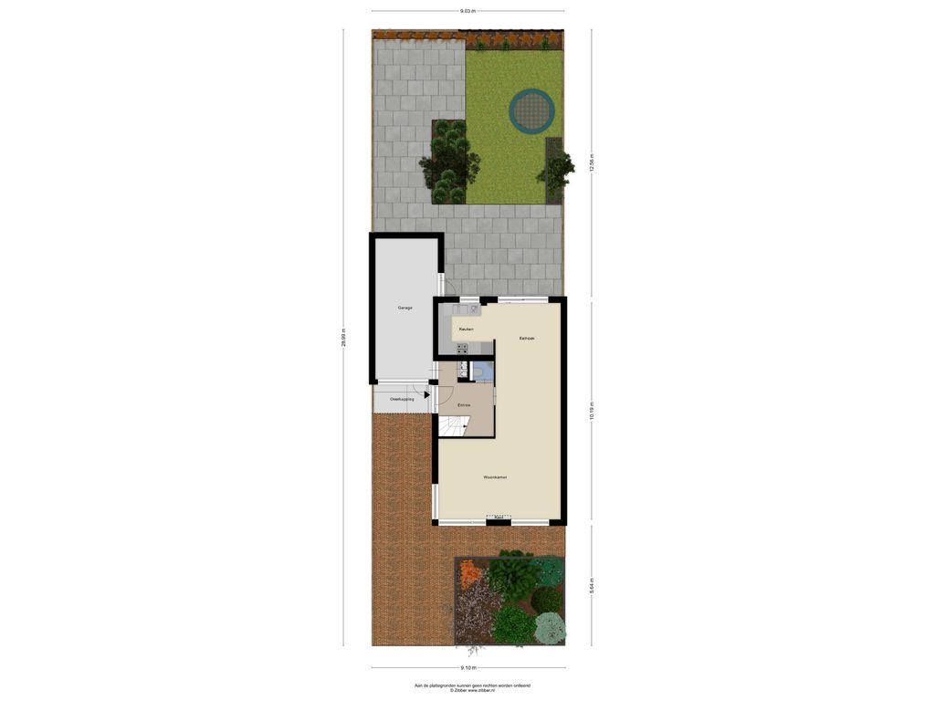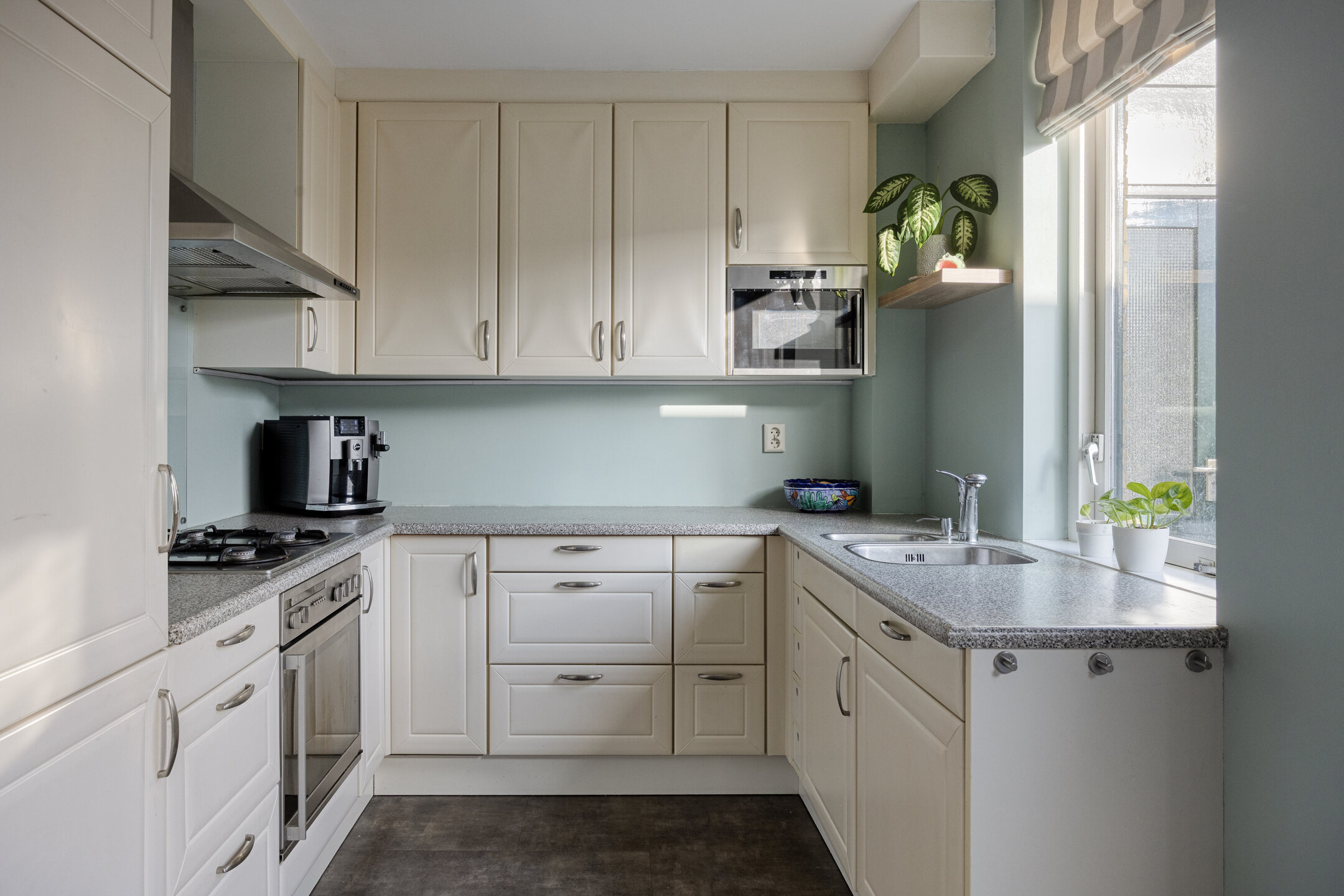 Aan de achterzijde van de woning ligt de keuken, die is uitgerust met een koel-vriescombinatie, Close-in Boiler, magnetron, oven, vaatwasser, afzuigkap en een vierpits gaskookplaat. Vanuit de eethoek geeft een schuifpui toegang tot de ruime achtertuin. Deze tuin ligt op het oosten, maar door de beperkte hoogte van de omliggende bebouwing kunt u hier vrijwel de hele dag van de zon genieten. Naast de woning bevindt zich tevens de royale garage van 19 m², die veel extra bergruimte biedt.