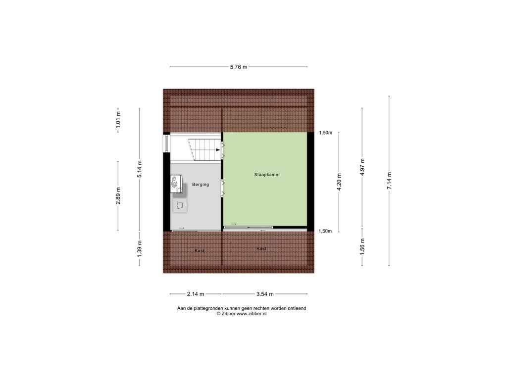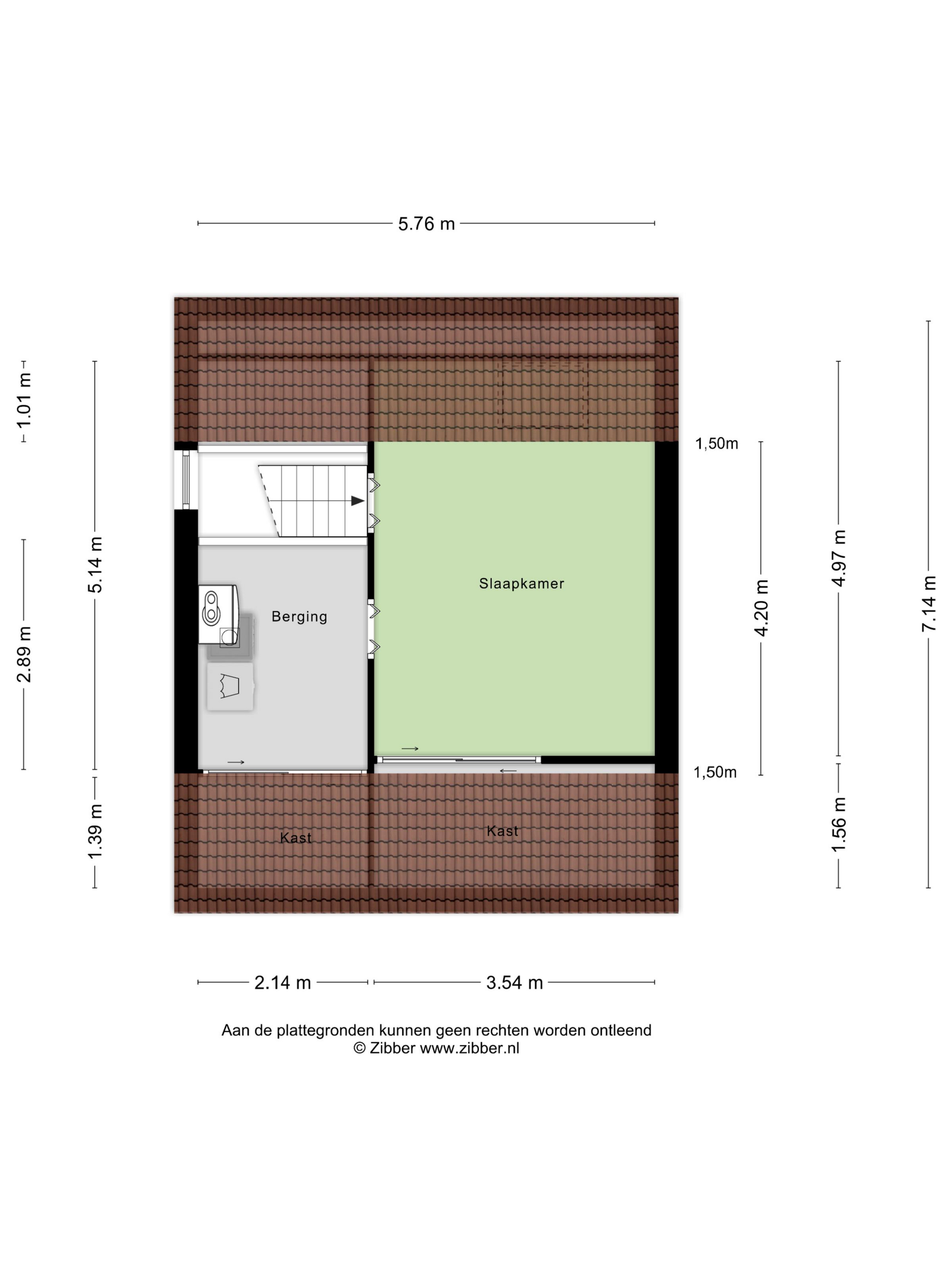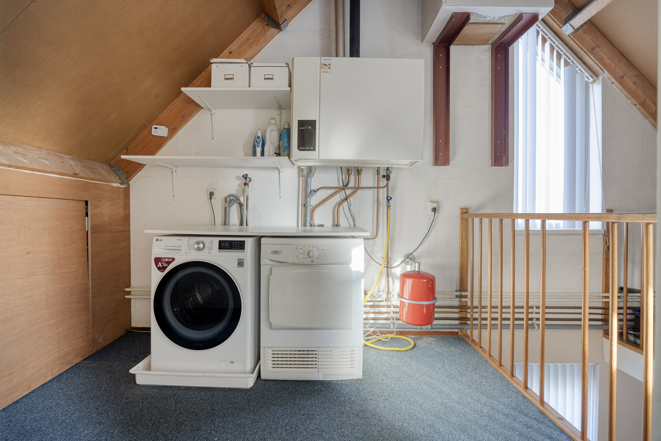 De trap vervolgt zijn weg naar de tweede verdieping, waar zich nog een zeer ruime slaapkamer van 14 m² bevindt. Aan de voorzijde van deze verdieping ligt een royale berging en wasruimte, met opstelplaatsen voor de wasmachine, droger en de cv-ketel uit 2002.