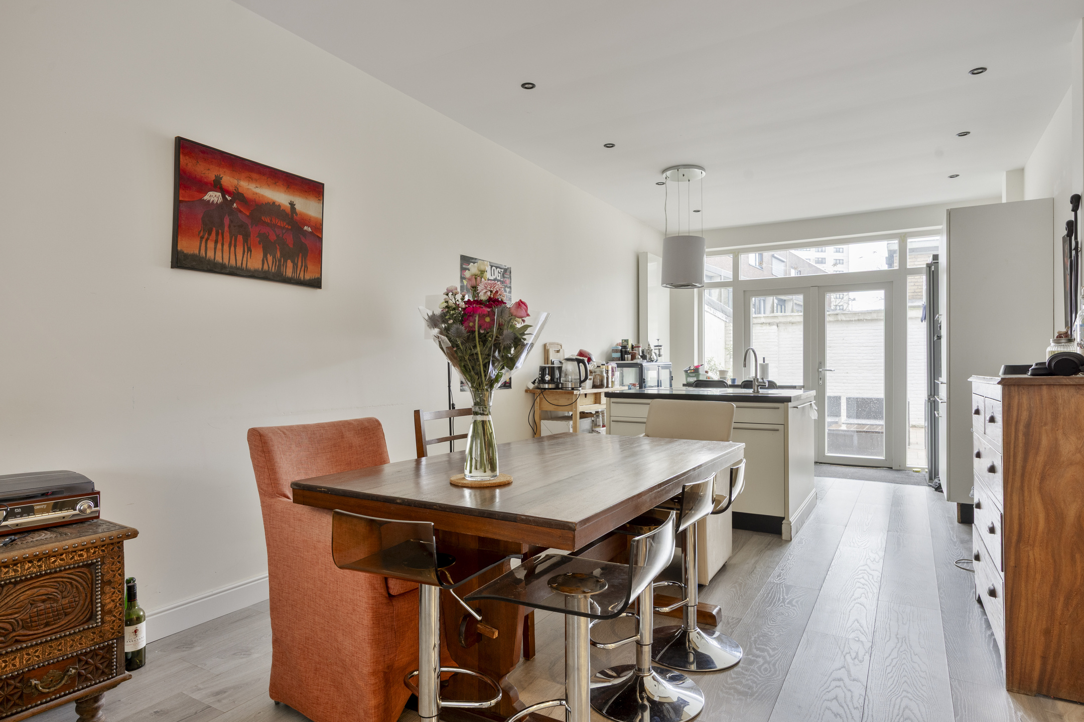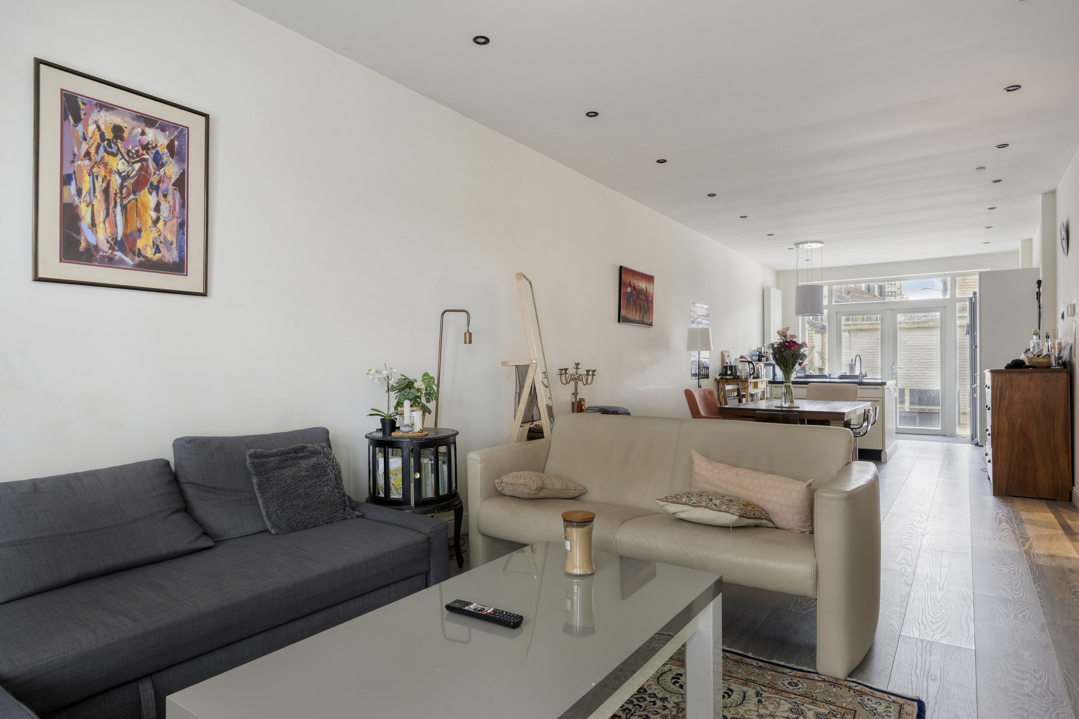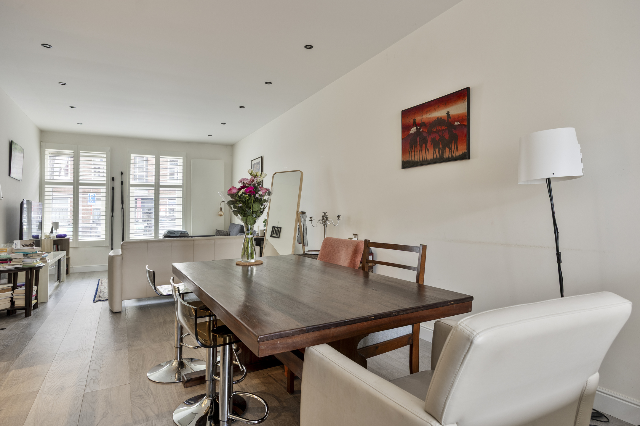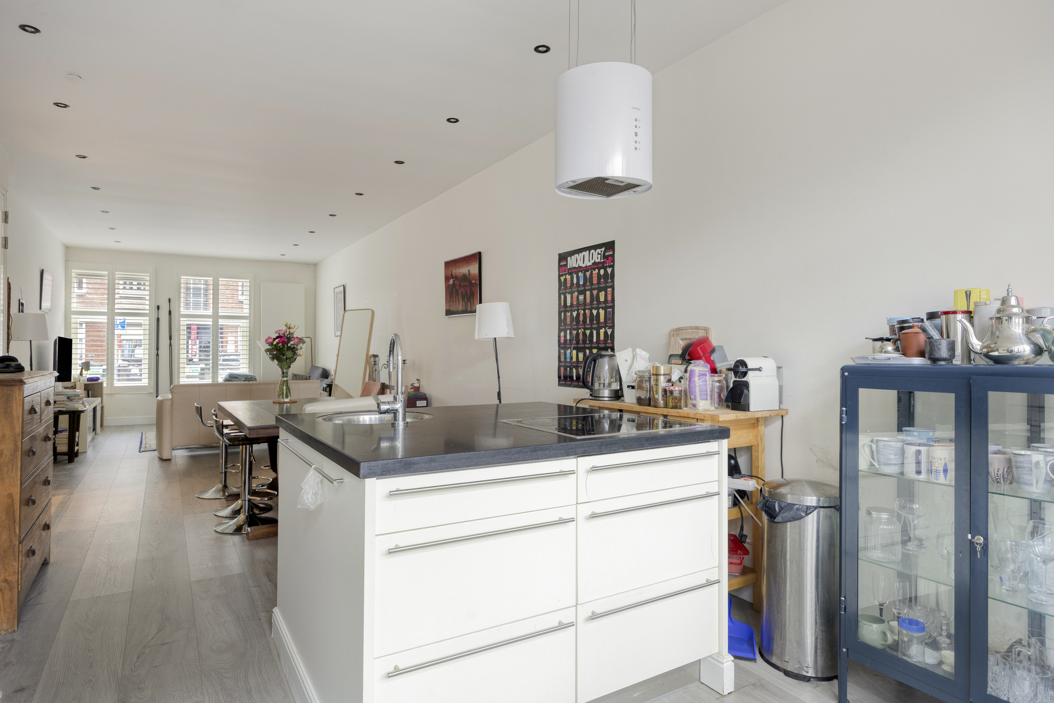 De lichte woonkamer met dubbele openslaande deuren naar de hal vormt het hart van de woning en staat in open verbinding met de keuken. De open keuken is voorzien van een stijlvol kookeiland met inductiekookplaat en biedt een fijne plek om te koken, maar wel in contact te blijven met de gasten. In de woonkamer zorgen fraaie shutters voor een luxe en warme uitstraling.