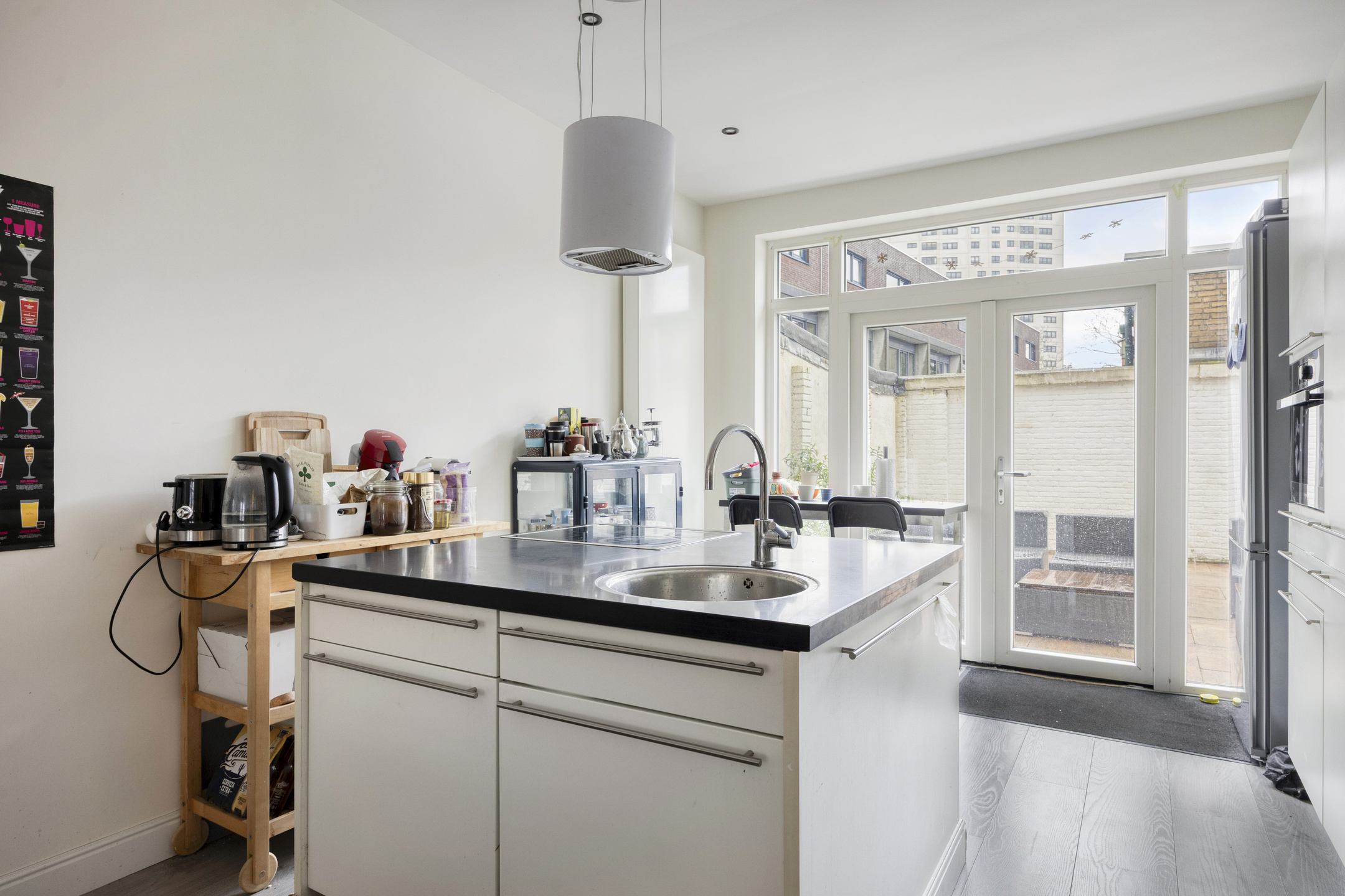 Through the French doors, you access the well-maintained garden, facing northeast. Here you can enjoy peace and outdoor living, with morning sun through to late afternoon. The garden was newly landscaped in 2020 and serves as a wonderful extension of the living space.