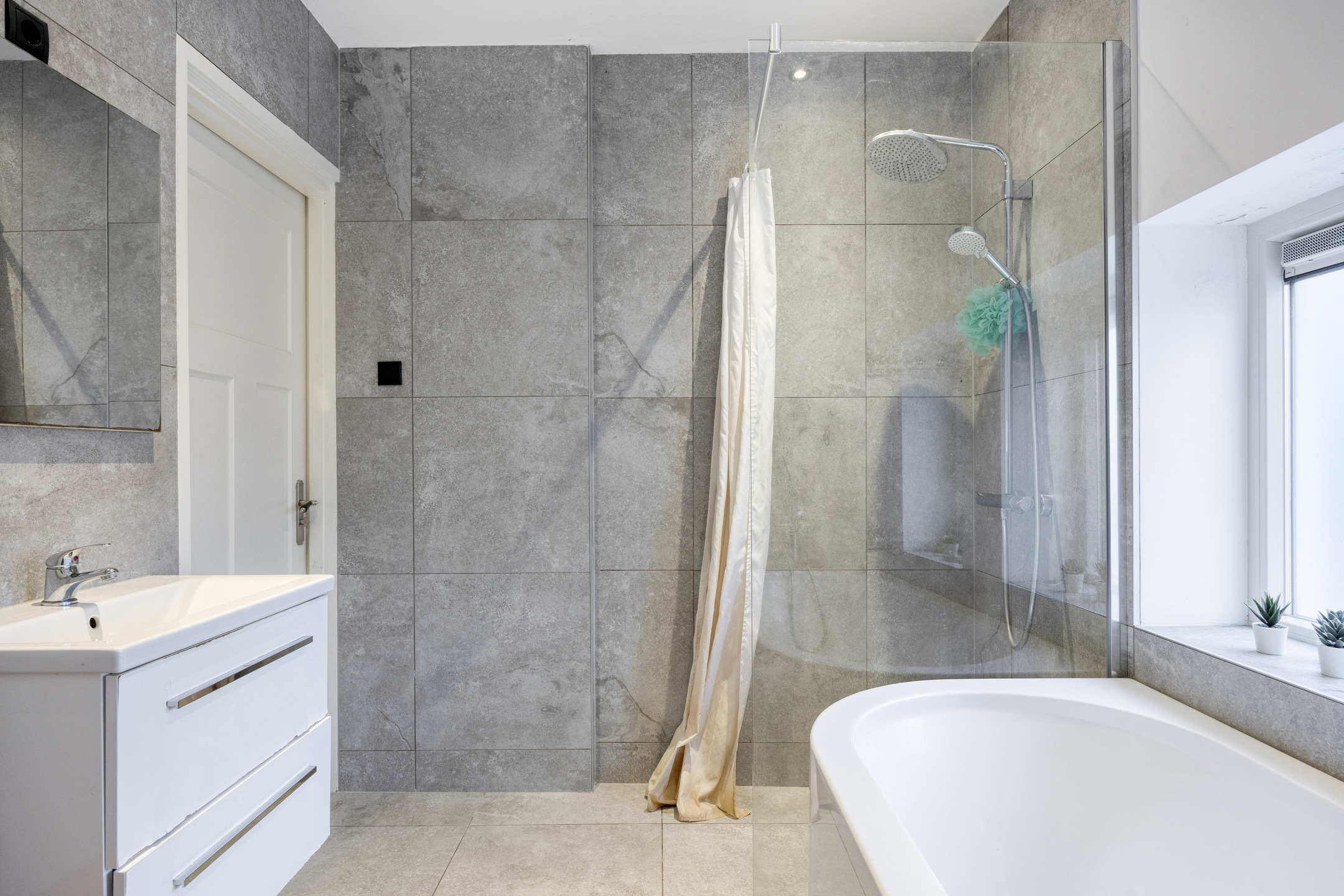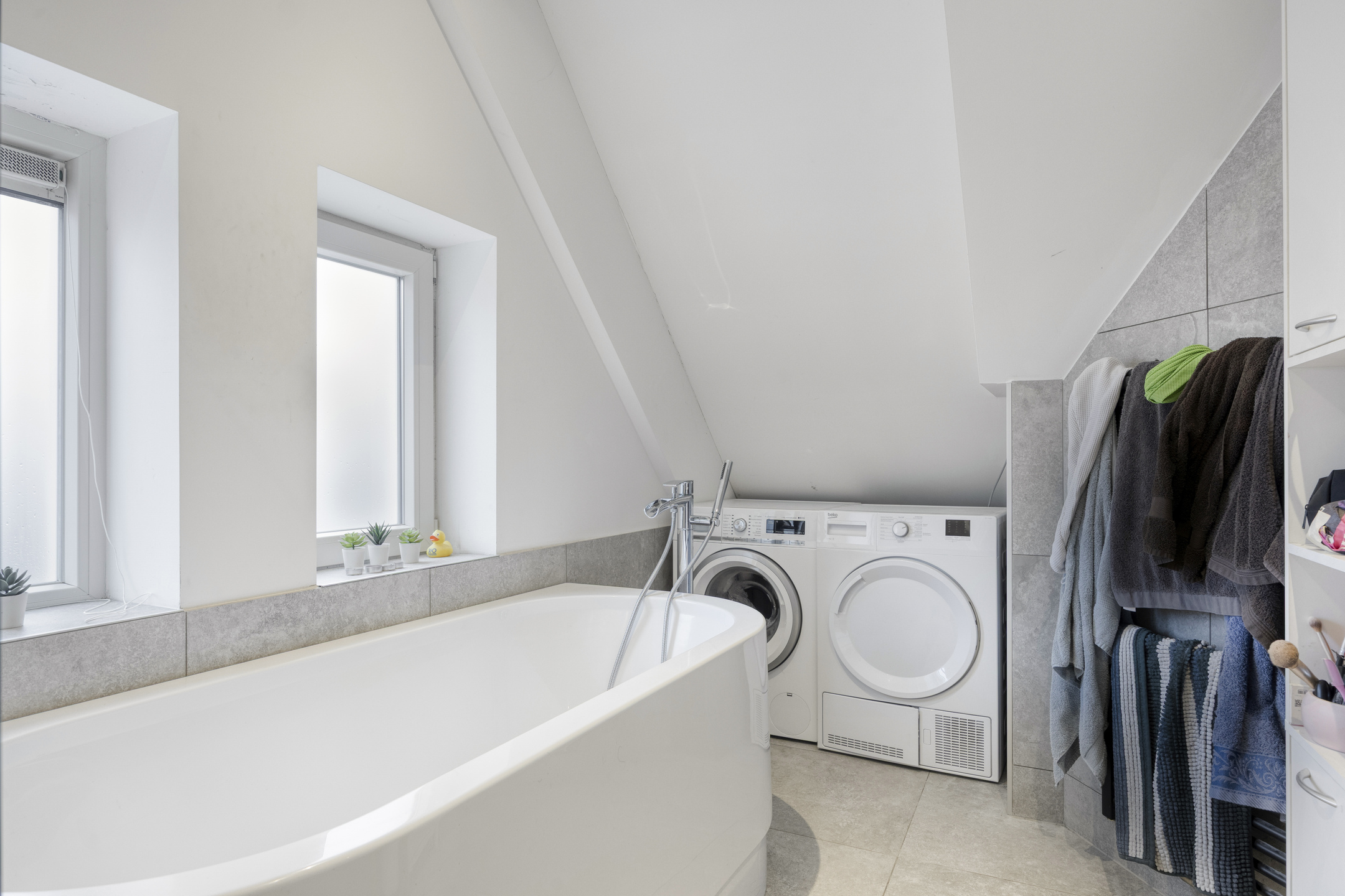 The property features three well-proportioned bedrooms, perfectly suited for use as sleeping, working, or hobby rooms. In addition, there is a separate fully tiled toilet and a modern bathroom. The bathroom is fully equipped with a bathtub, walk-in shower, vanity unit, and connections for both a washing machine and dryer.