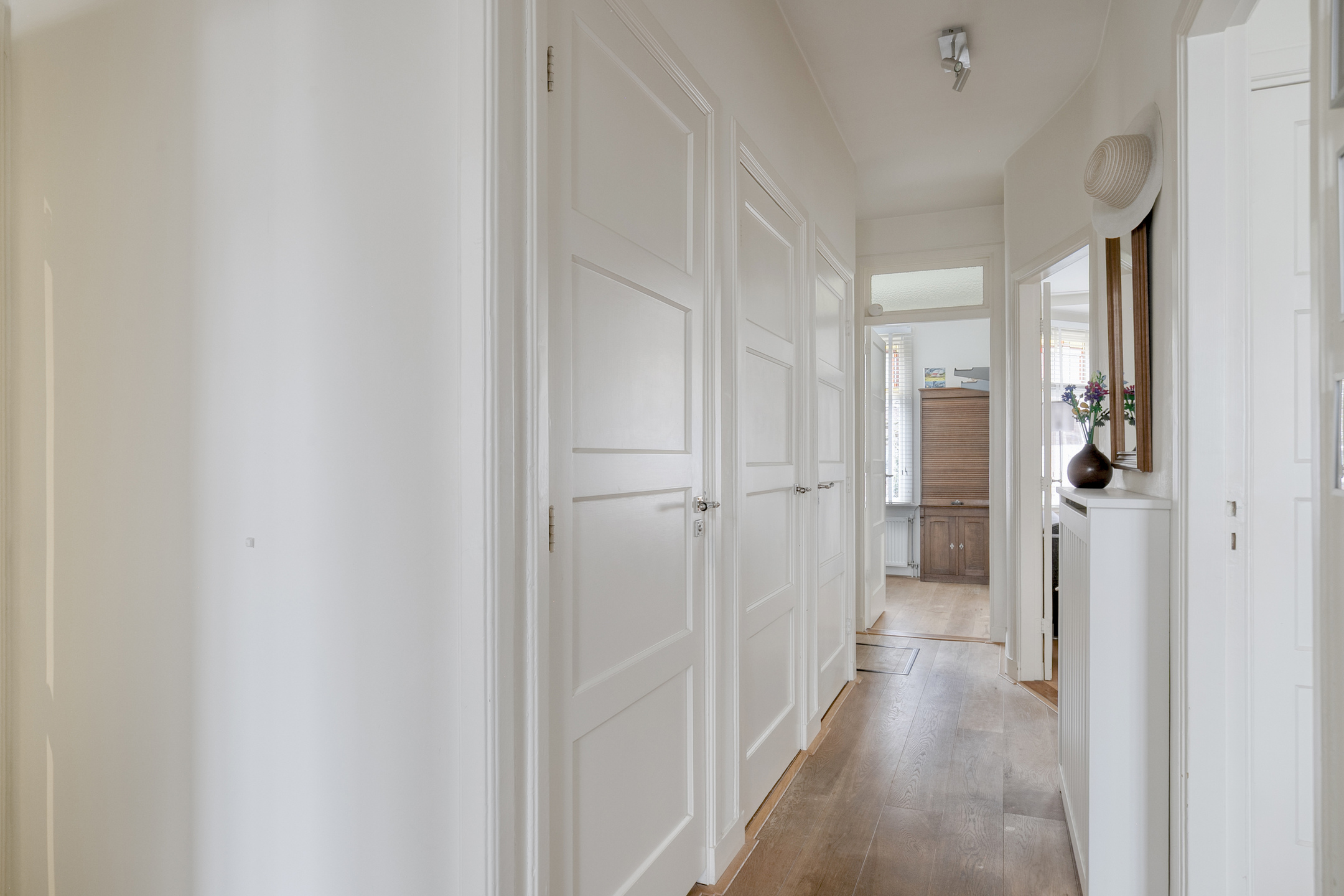 Via de ruime hal betreedt u de gang die de verschillende vertrekken met elkaar verbindt. Vanuit hier heeft u toegang tot het half betegelde toilet met fontein en een zwevend toilet. Aan de voorzijde van de woning bevindt zich de royale woonkamer, die dankzij de erker een prettige lichtinval heeft en ruimtelijk aanvoelt.
