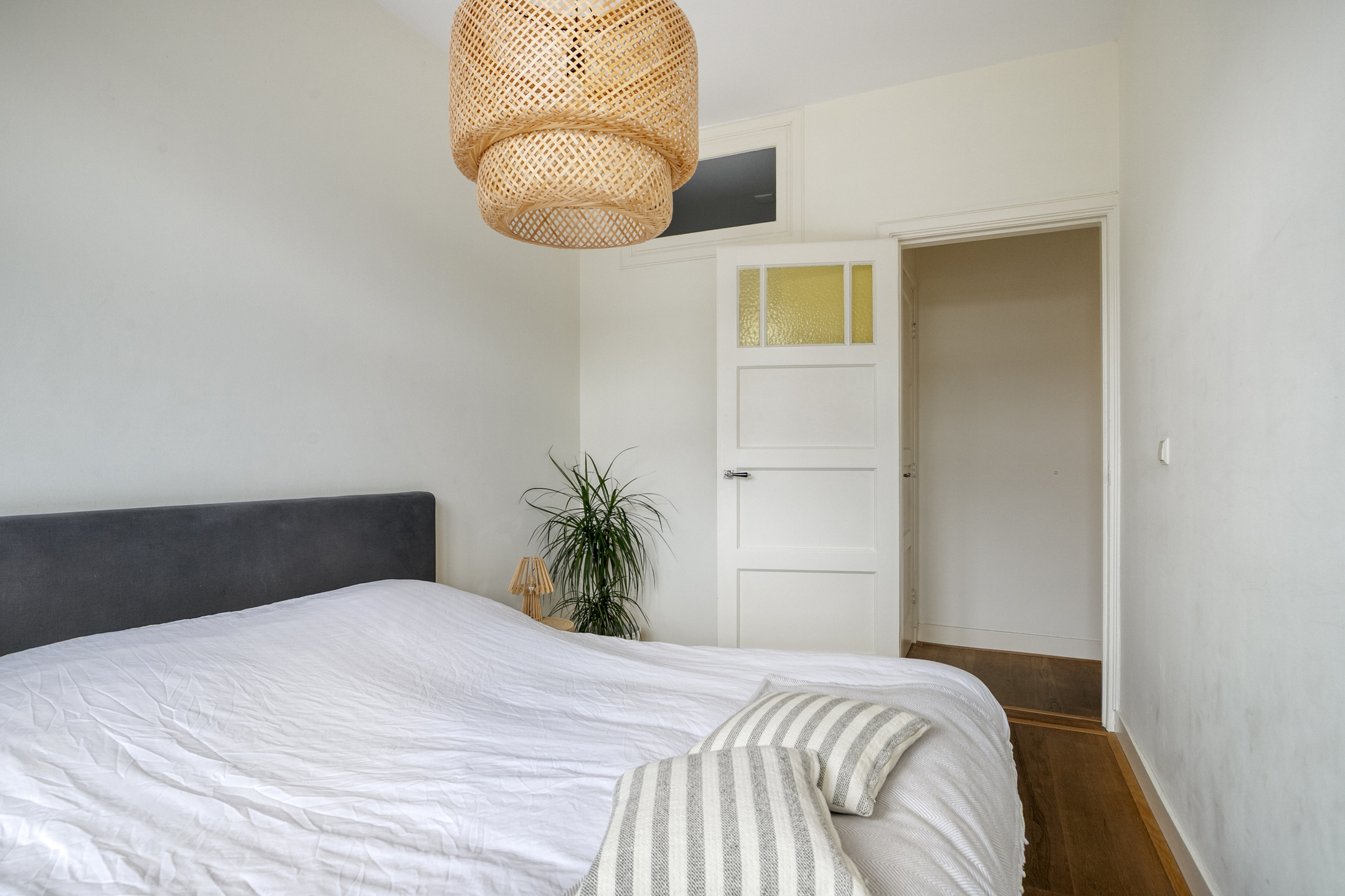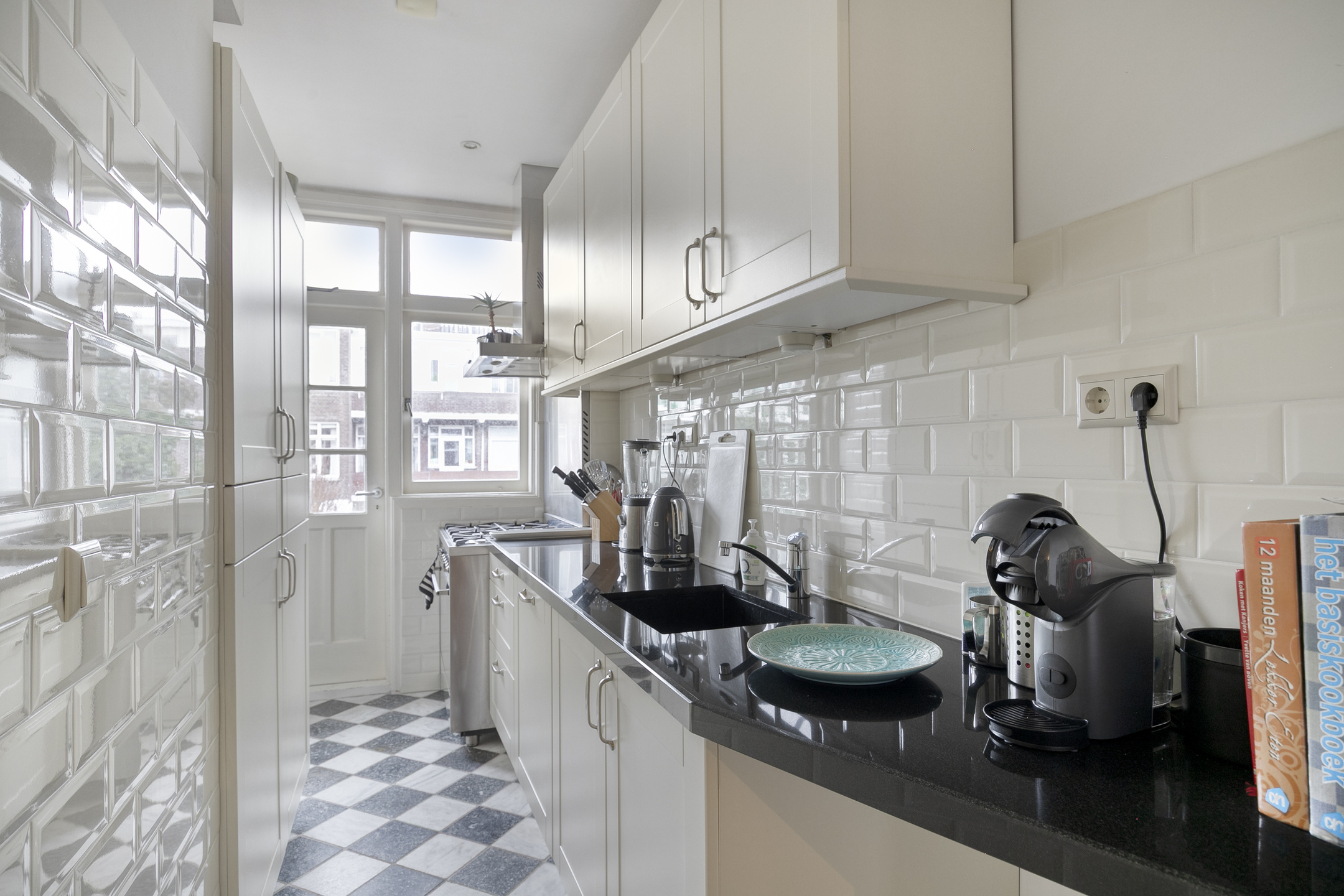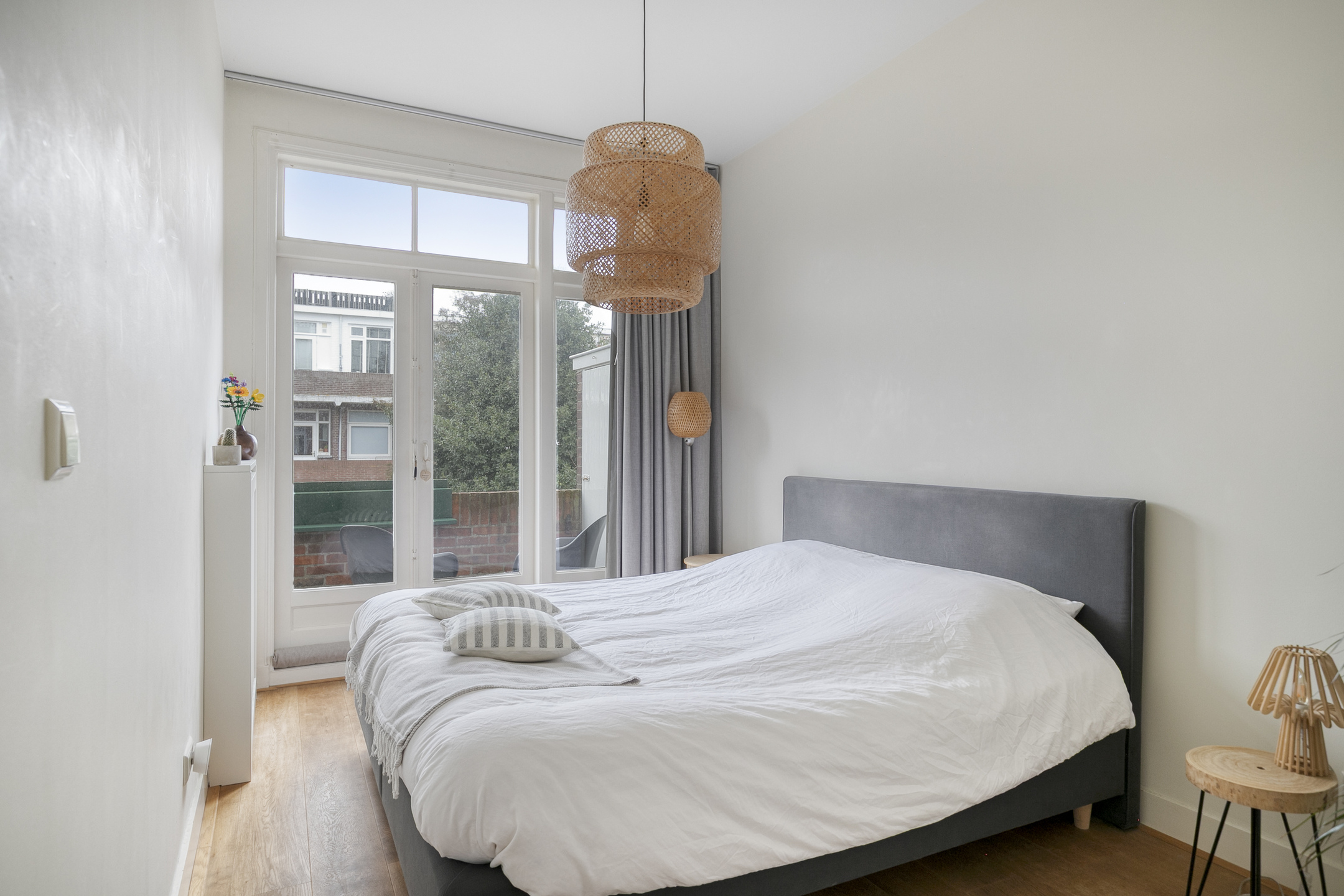 Aan de achterzijde van de woning liggen de keuken, de eetkamer en een slaapkamer. De keuken is uitgevoerd met een stenen werkblad en voorzien van een koelkast, vaatwasser, afzuigkap en een zes-pits gasfornuis. De tegelvloer geeft de keuken een praktische en verzorgde uitstraling. De woning beschikt over twee slaapkamers van respectievelijk circa 9 en 8 m², beide afgewerkt met een laminaatvloer. Zowel vanuit de keuken als vanuit de slaapkamer aan de achterzijde heeft u toegang tot het ruime balkon, een fijne plek om buiten te zitten.
