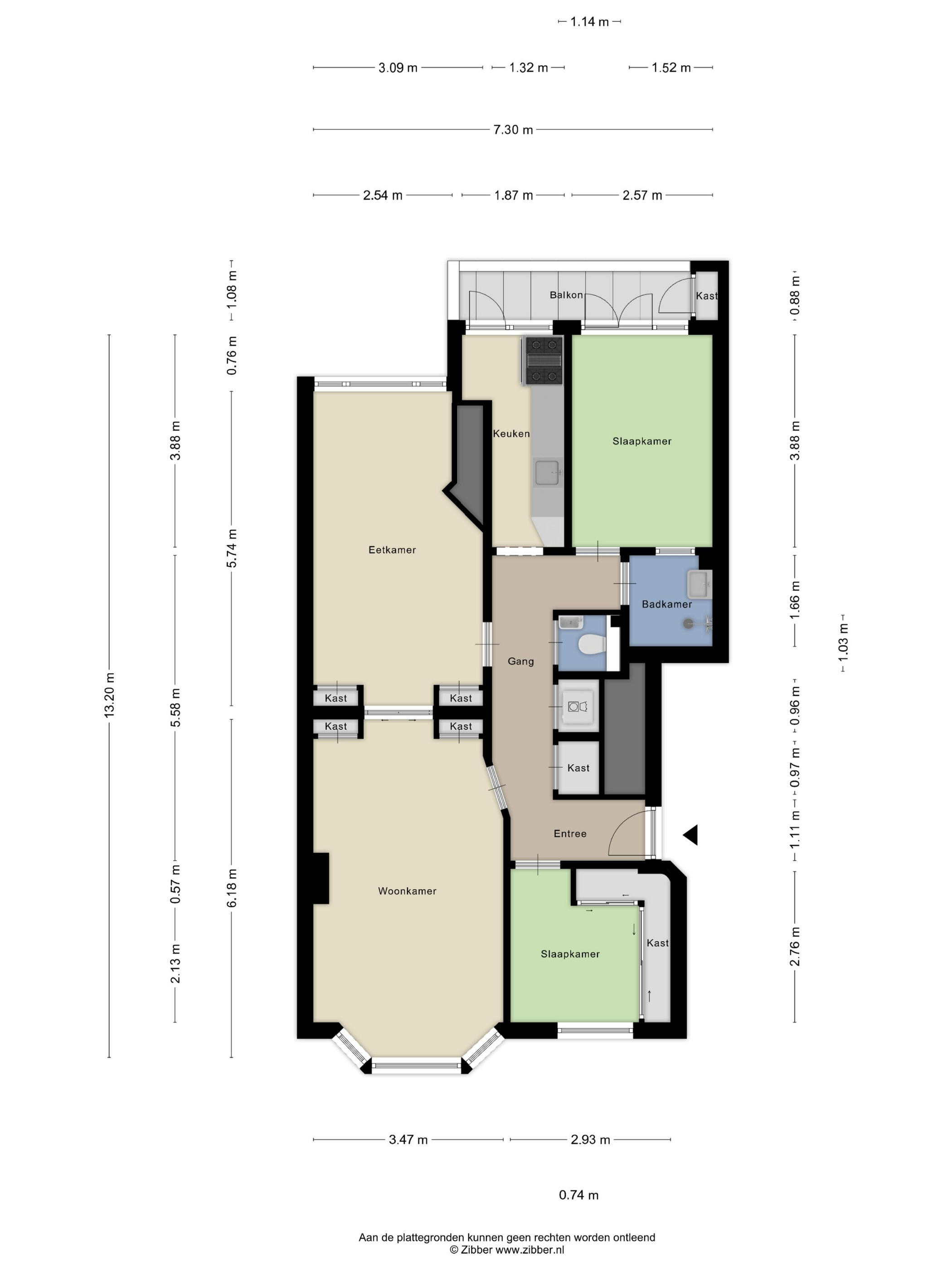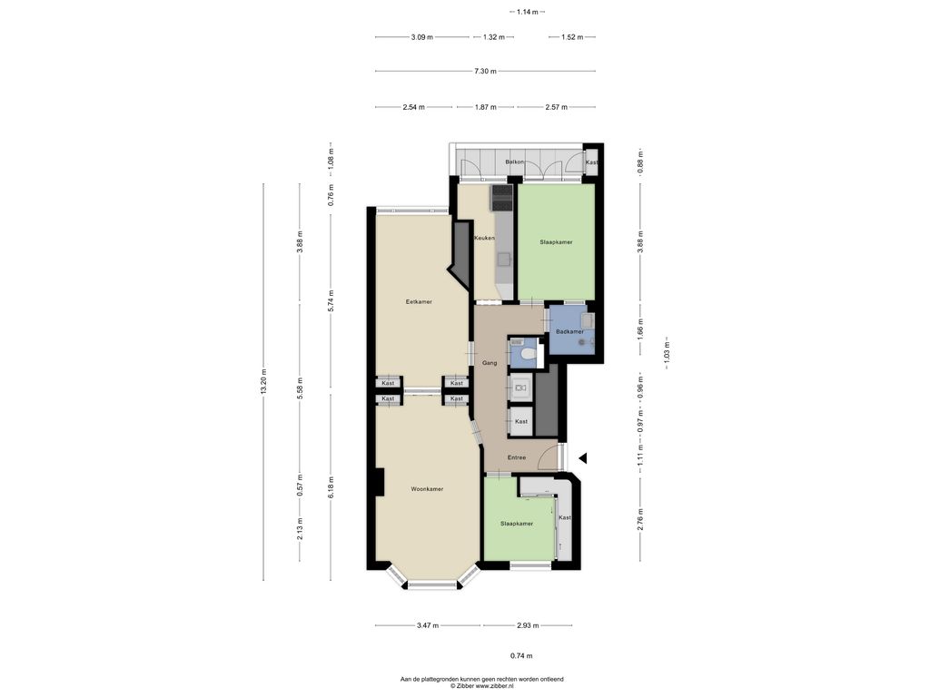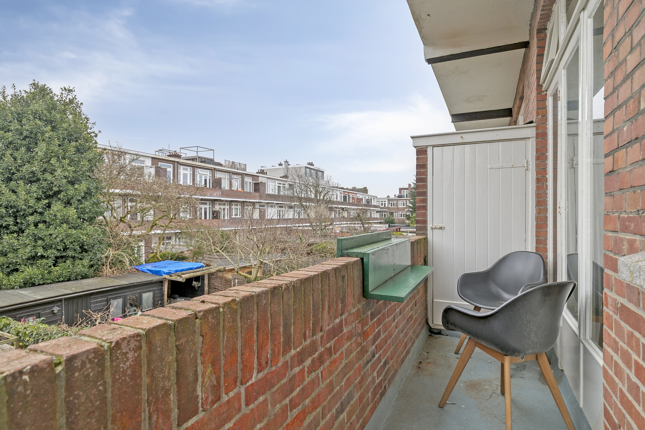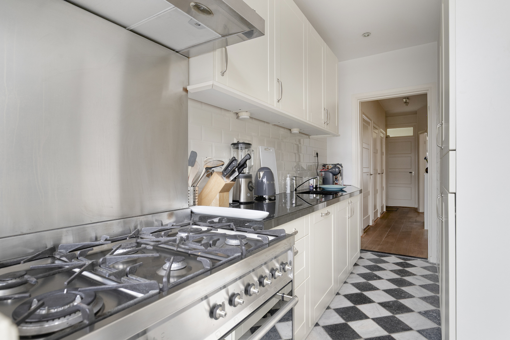 Aan de achterzijde van de woning liggen de keuken, de eetkamer en een slaapkamer. De keuken is uitgevoerd met een stenen werkblad en voorzien van een koelkast, vaatwasser, afzuigkap en een zes-pits gasfornuis. De tegelvloer geeft de keuken een praktische en verzorgde uitstraling. De woning beschikt over twee slaapkamers van respectievelijk circa 9 en 8 m², beide afgewerkt met een laminaatvloer. Zowel vanuit de keuken als vanuit de slaapkamer aan de achterzijde heeft u toegang tot het ruime balkon, een fijne plek om buiten te zitten.