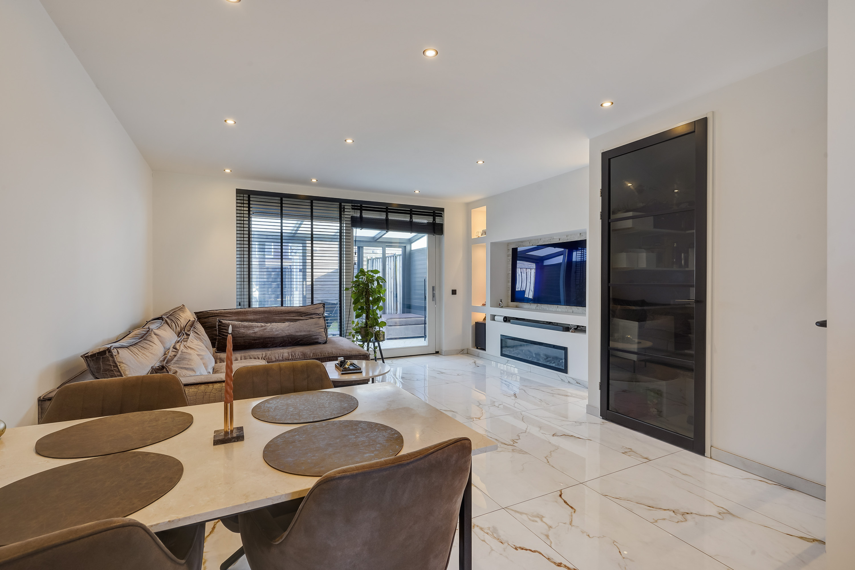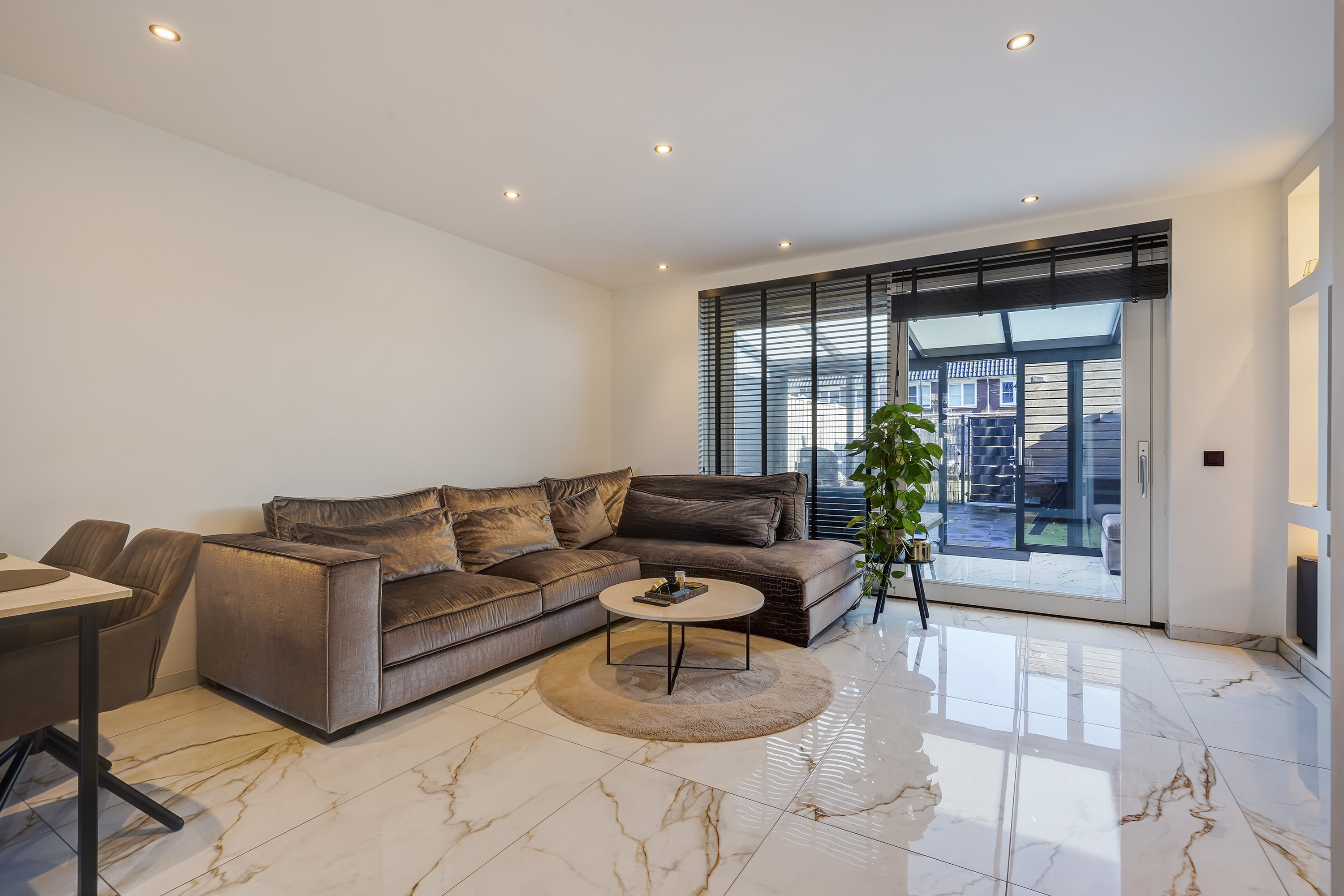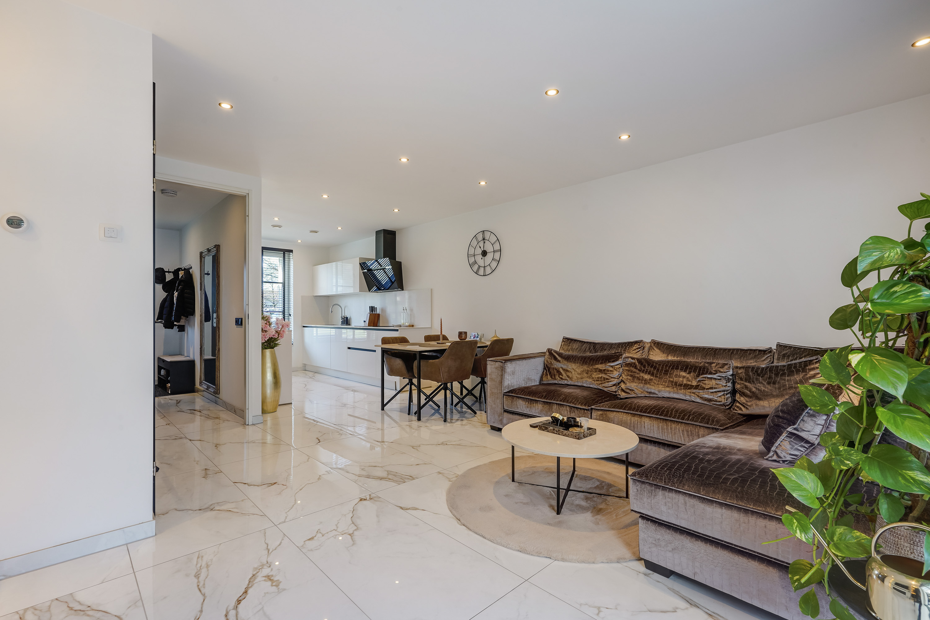 Door een stijlvolle glazen deur stap je de lichte doorzonwoonkamer binnen. Dankzij de grote raampartijen geniet je hier van een prachtige lichtinval gedurende de hele dag.