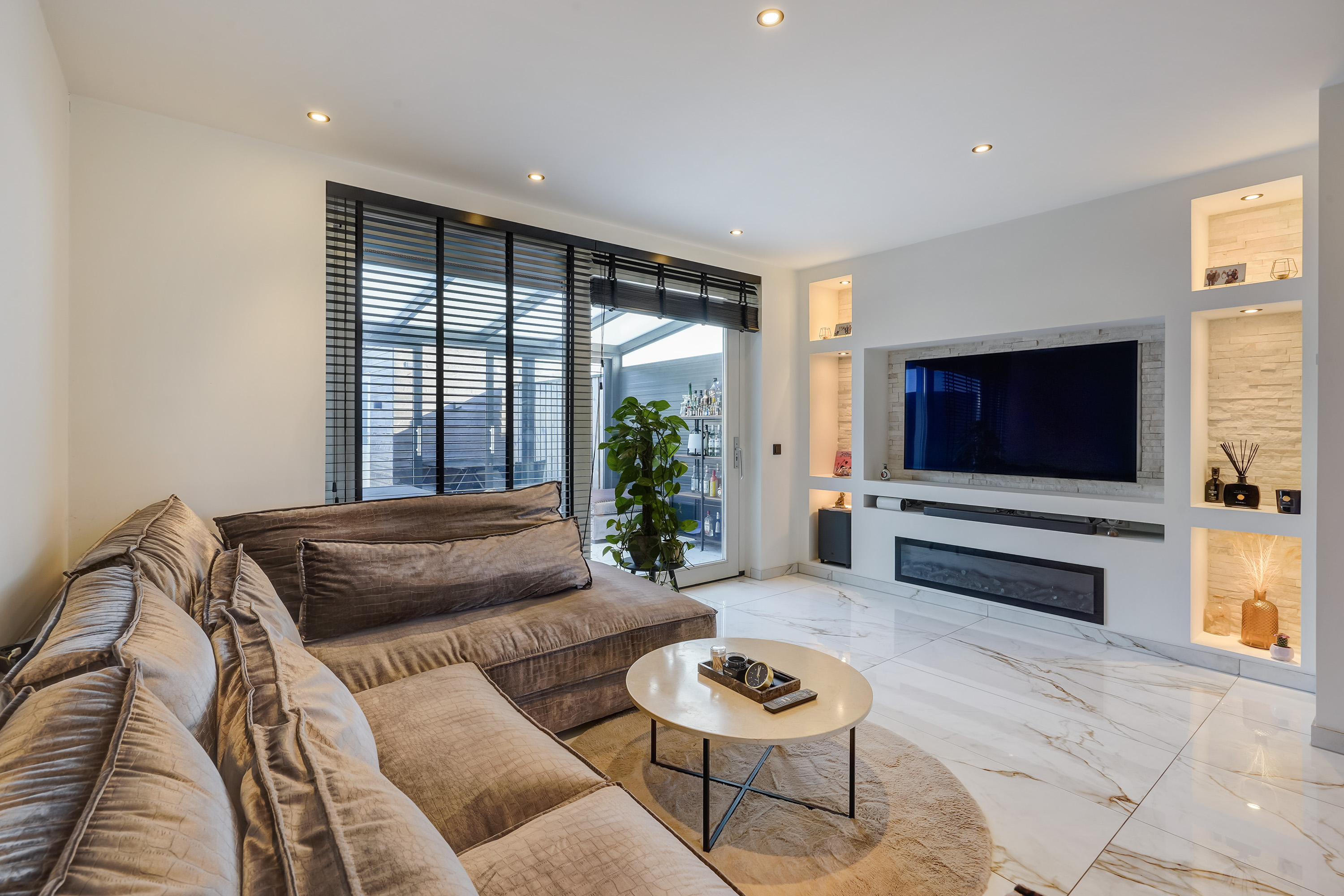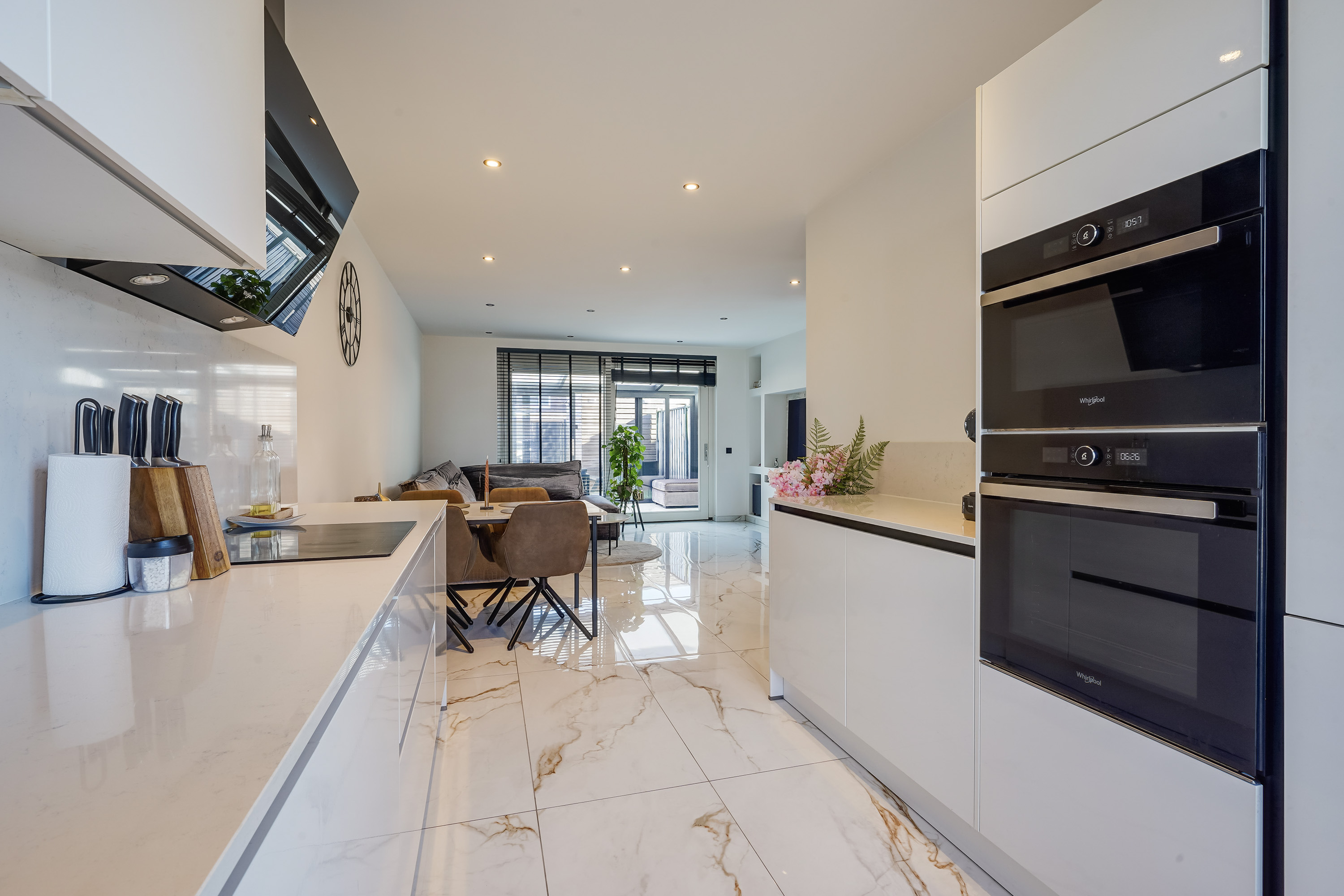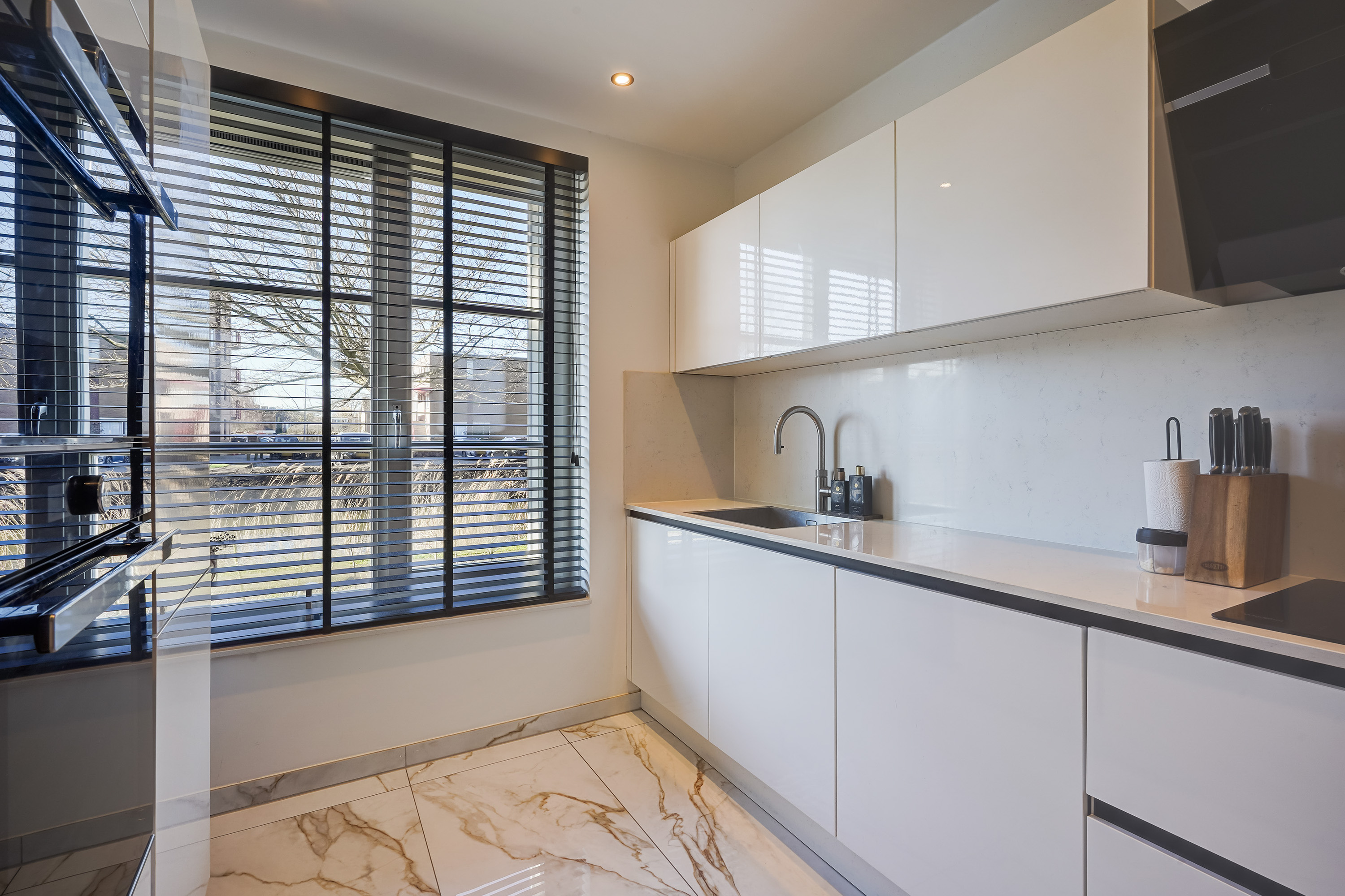 De woonkamer beschikt over een royale zithoek met een gezellige cinewall, dé perfecte plek voor ontspannen avonden. Aan de voorzijde vind je de moderne keuken, uitgevoerd met diverse inbouwapparatuur en volop werk- en bergruimte.