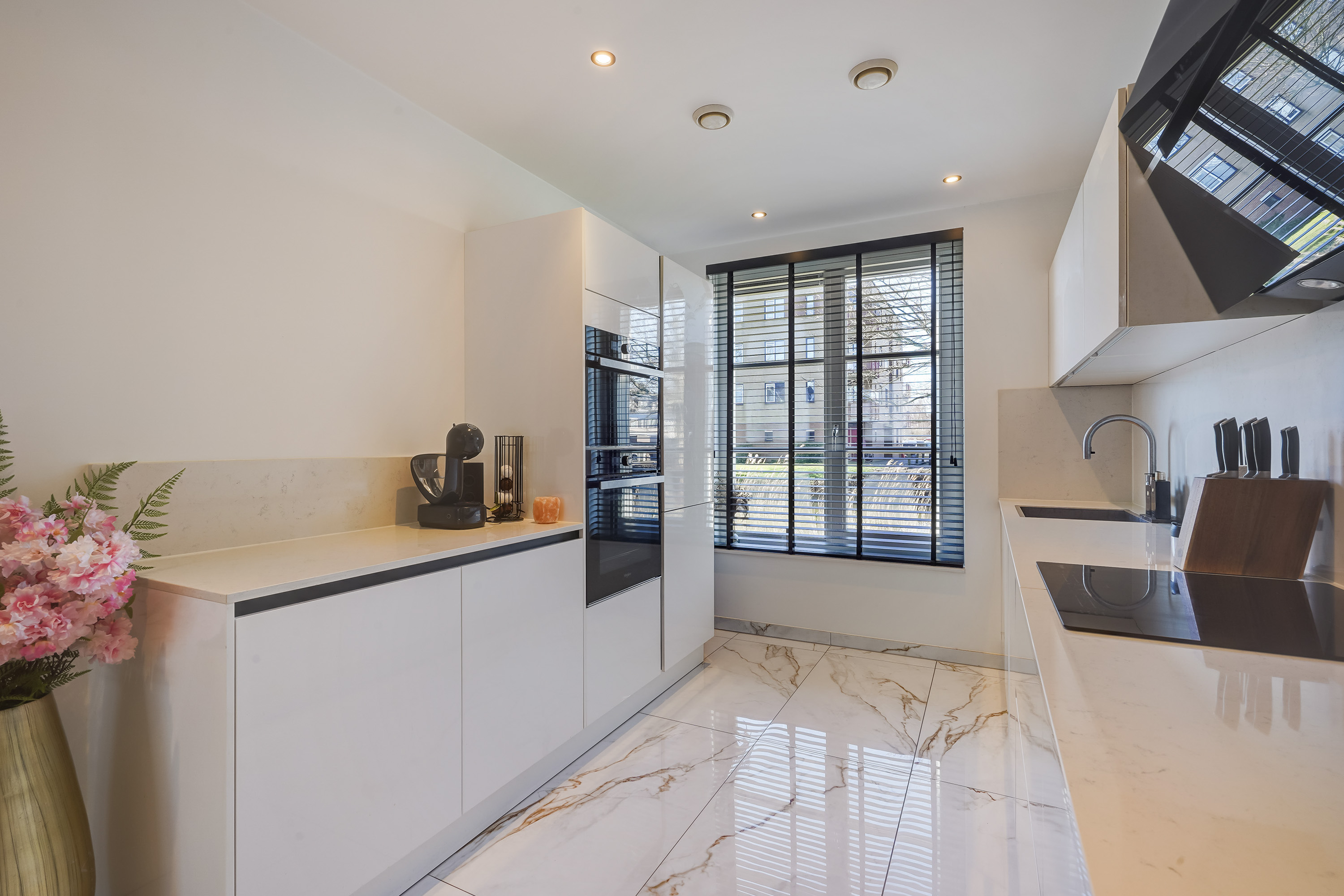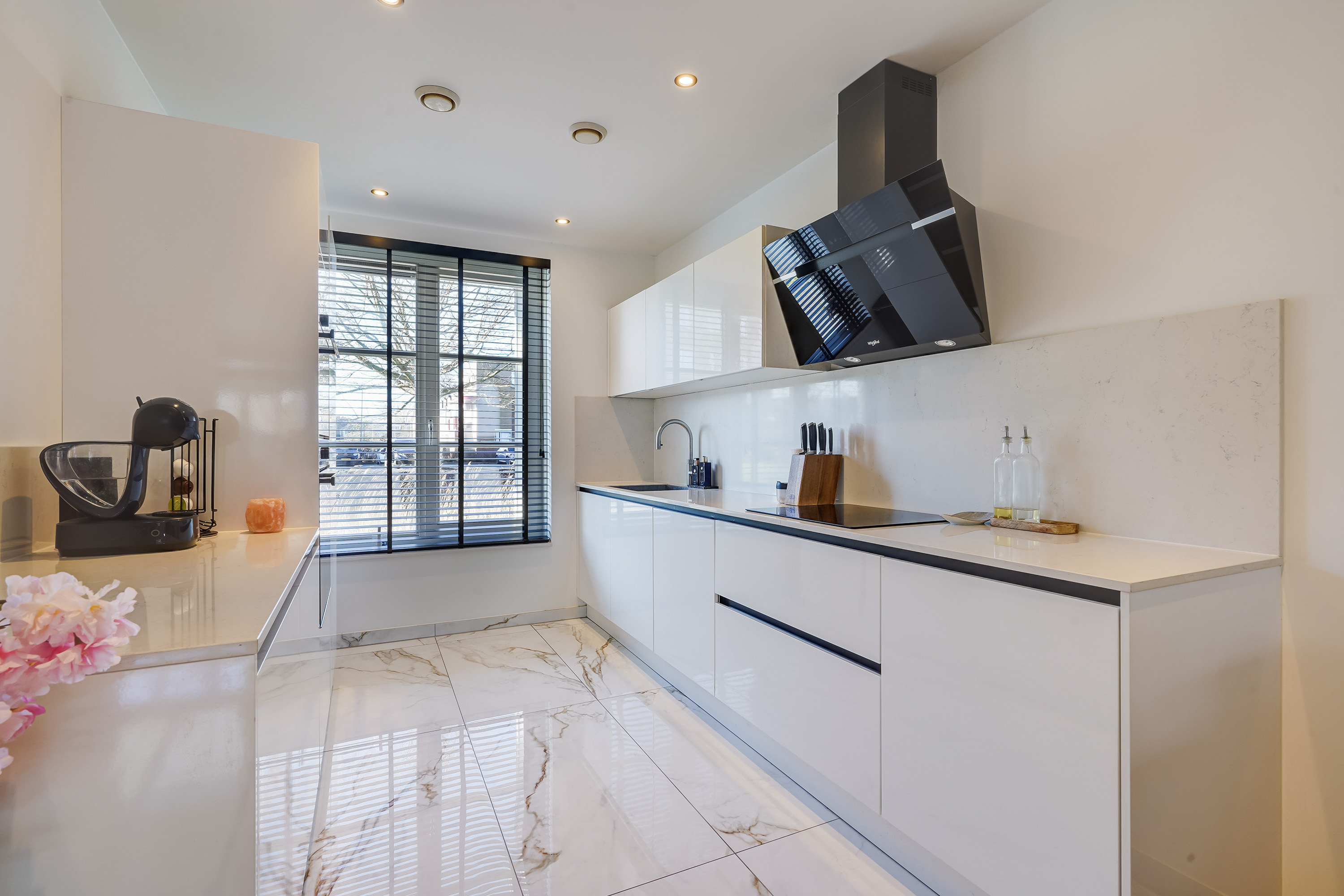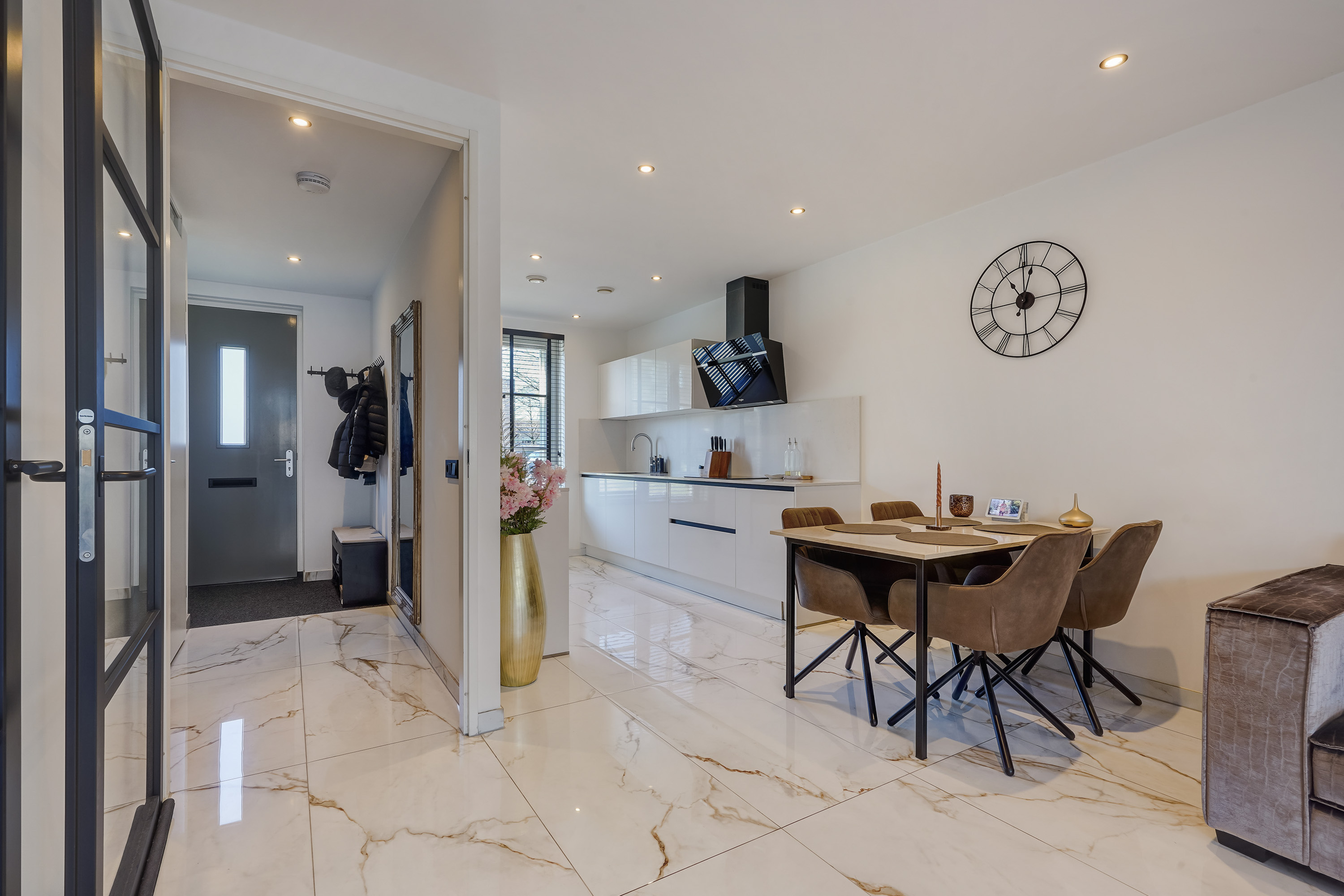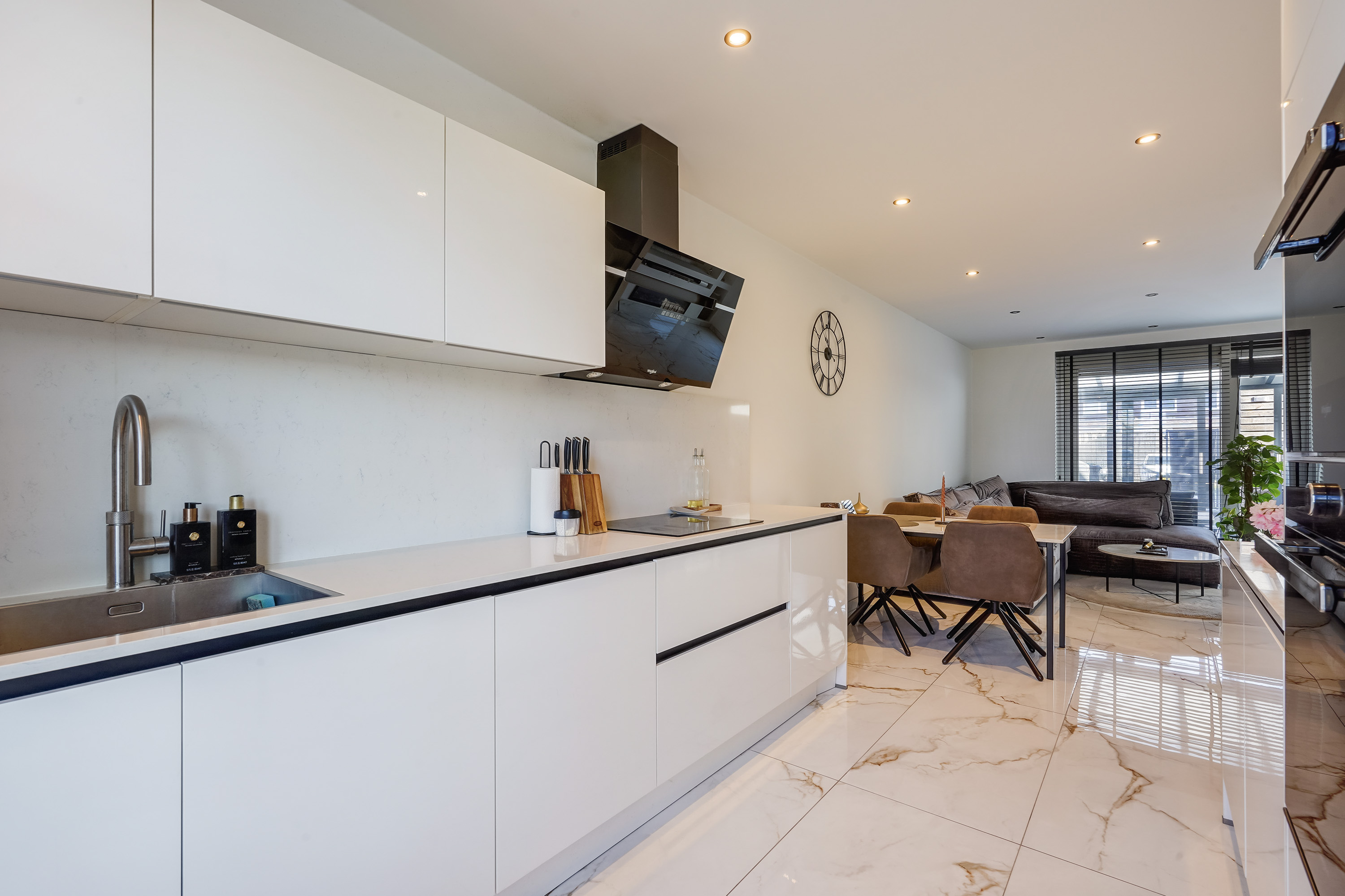 De woonkamer beschikt over een royale zithoek met een gezellige cinewall, dé perfecte plek voor ontspannen avonden. Aan de voorzijde vind je de moderne keuken, uitgevoerd met diverse inbouwapparatuur en volop werk- en bergruimte.