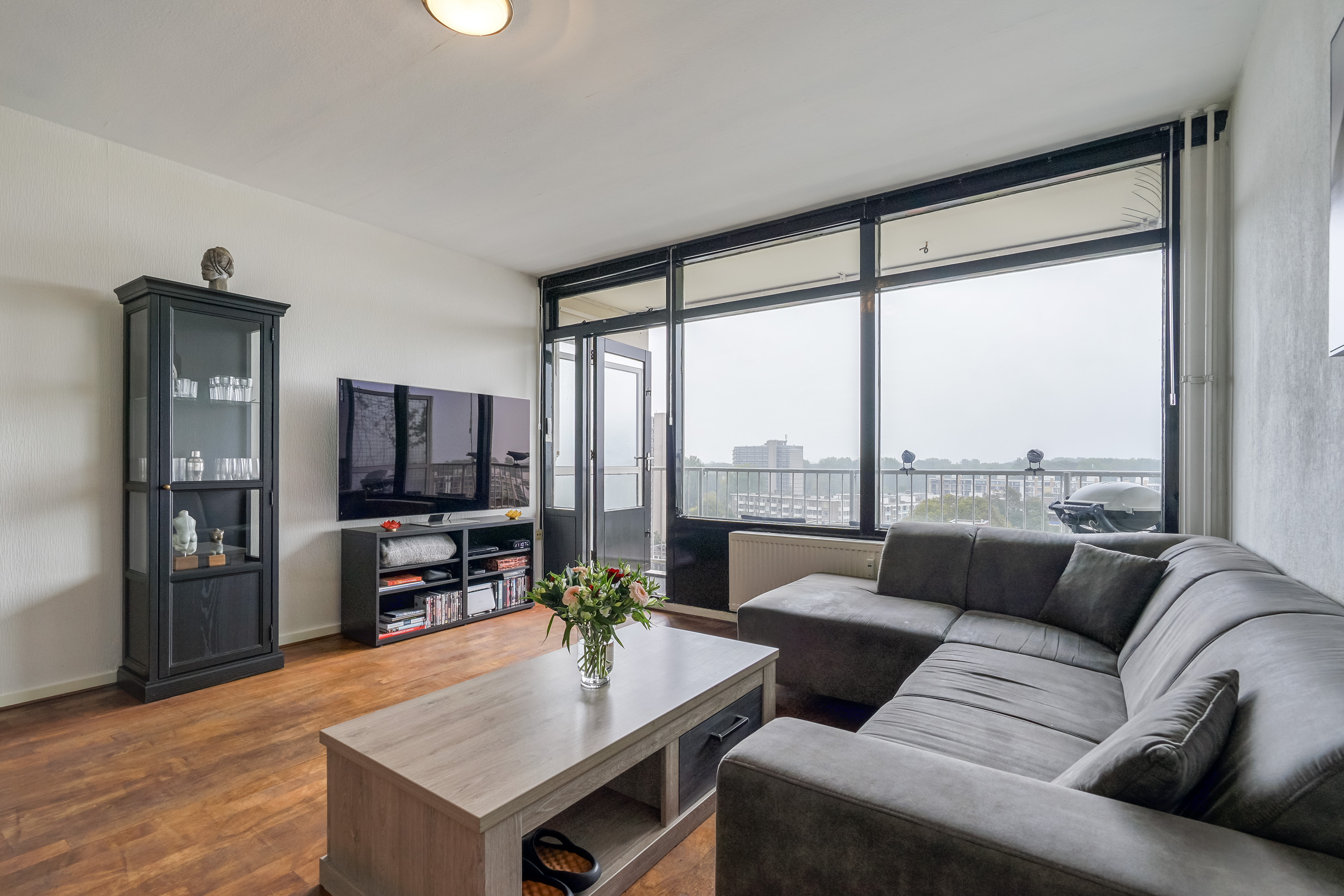 Woonkamer: ruim en licht dankzij grote raampartijen, met toegang tot het woningbrede balkon op het zuidwesten – perfect om te genieten van de middag- en avondzon én het fenomenale uitzicht richting zee.
