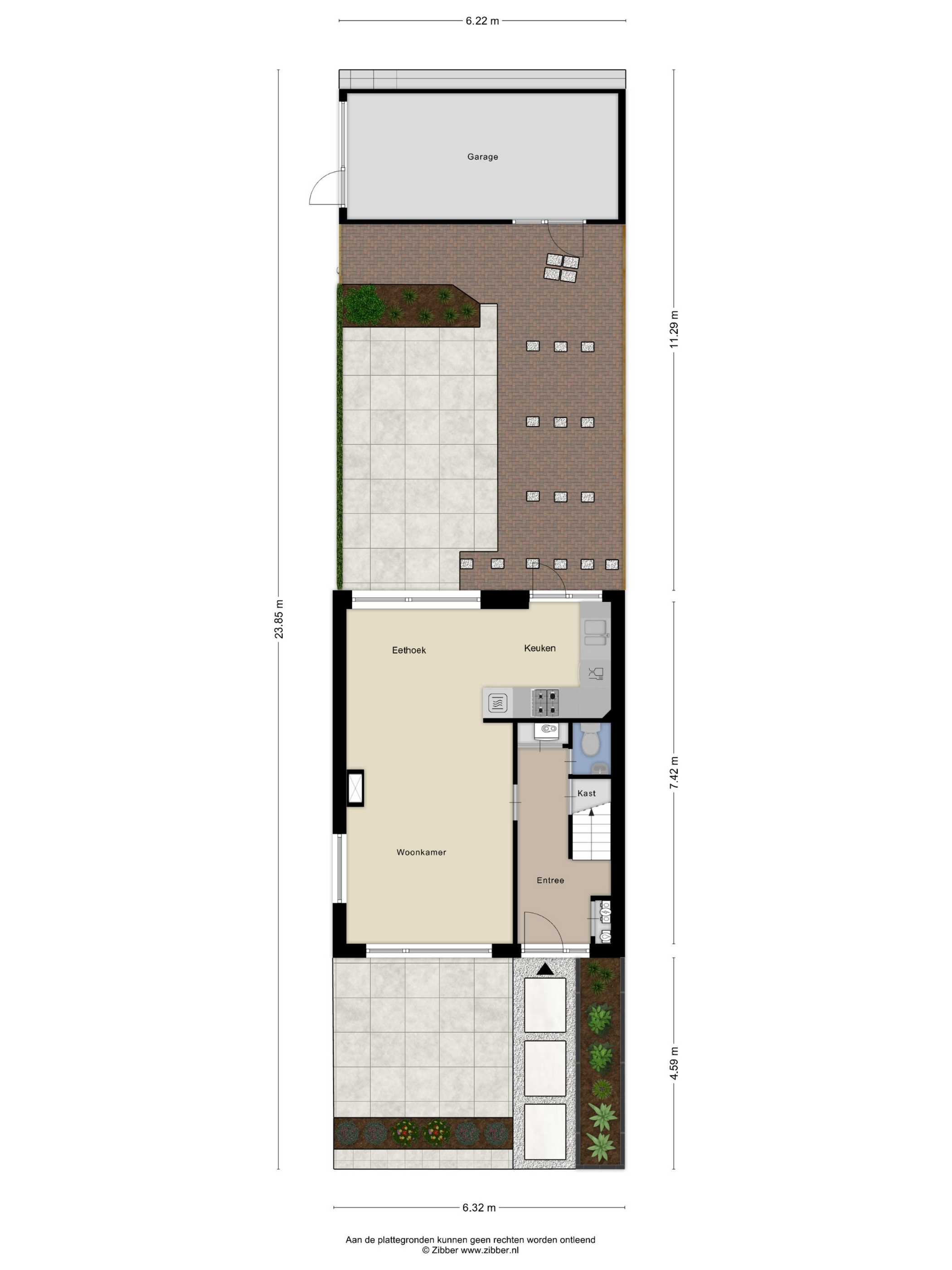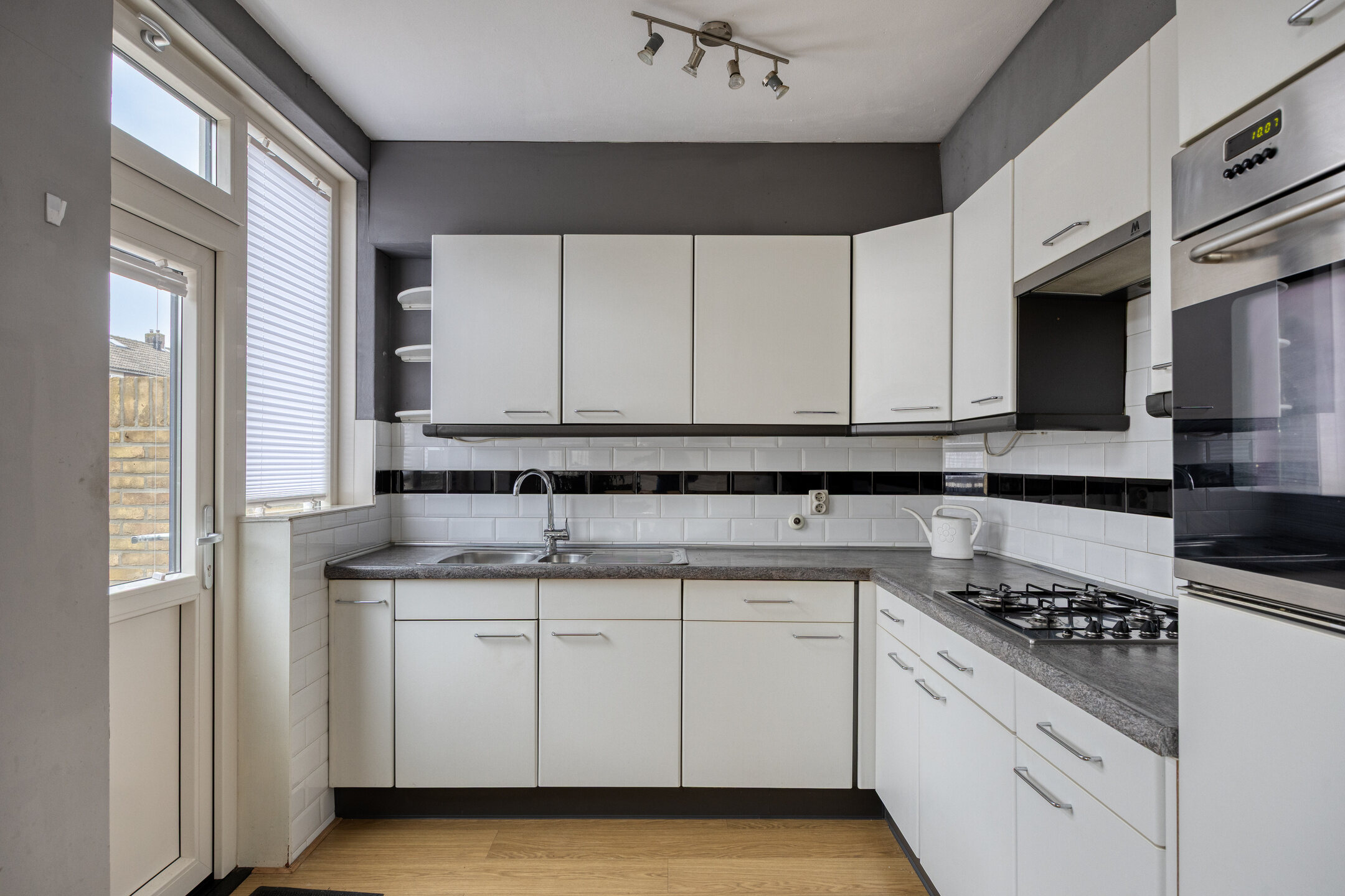 Aan de achterzijde van de woning bevindt zich de open keuken, die is uitgerust met een combimagnetron, vaatwasser, afzuigkap en een vierpits gasfornuis. Vanuit de keuken heeft u direct toegang tot de achtertuin. Achter in de tuin staat een ruime garage, ideaal voor het parkeren van een auto of het opbergen van fietsen en overige spullen.