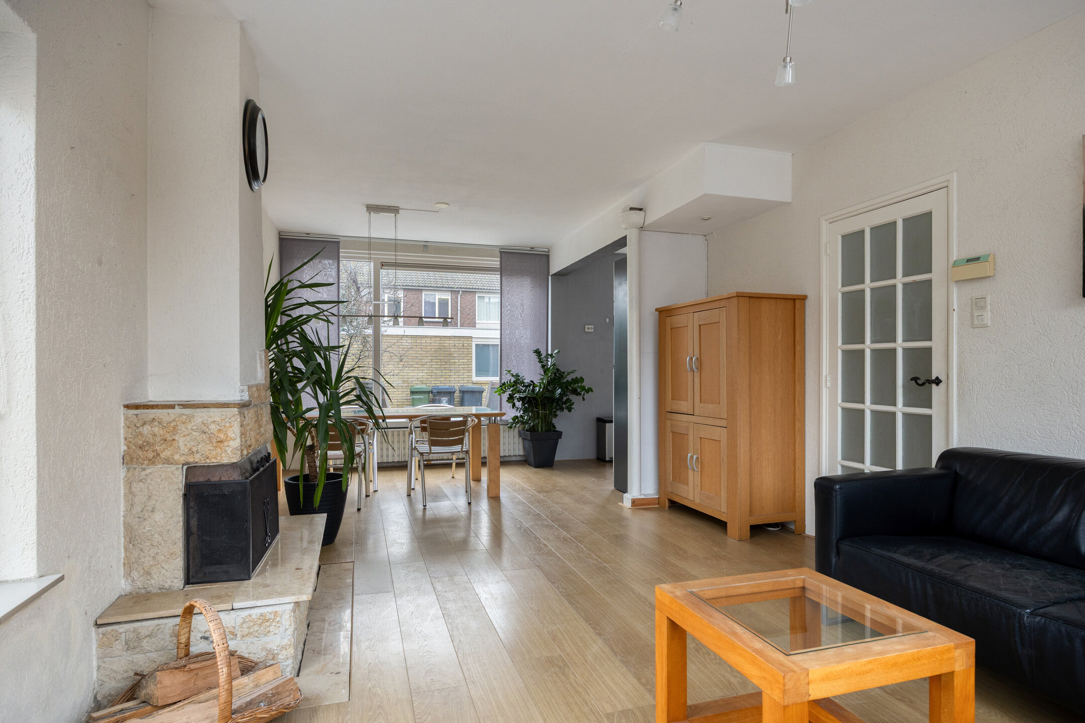 Via de voordeur betreedt u de hal, waar zich de trapopgang naar de eerste verdieping bevindt. In de hal treft u tevens het half betegelde toilet en een praktische trapkast. Vanuit de hal loopt u door naar de ruime woon- en eetkamer. Aan de voorzijde van de woning bevindt zich het woongedeelte, dat is voorzien van een sfeervolle open haard. De woonkamer is afgewerkt met een fraai laminaatvloer en dankzij de grote raampartijen aan zowel de voor- als achterzijde valt er veel daglicht binnen, wat de ruimte licht en ruimtelijk laat aanvoelen.