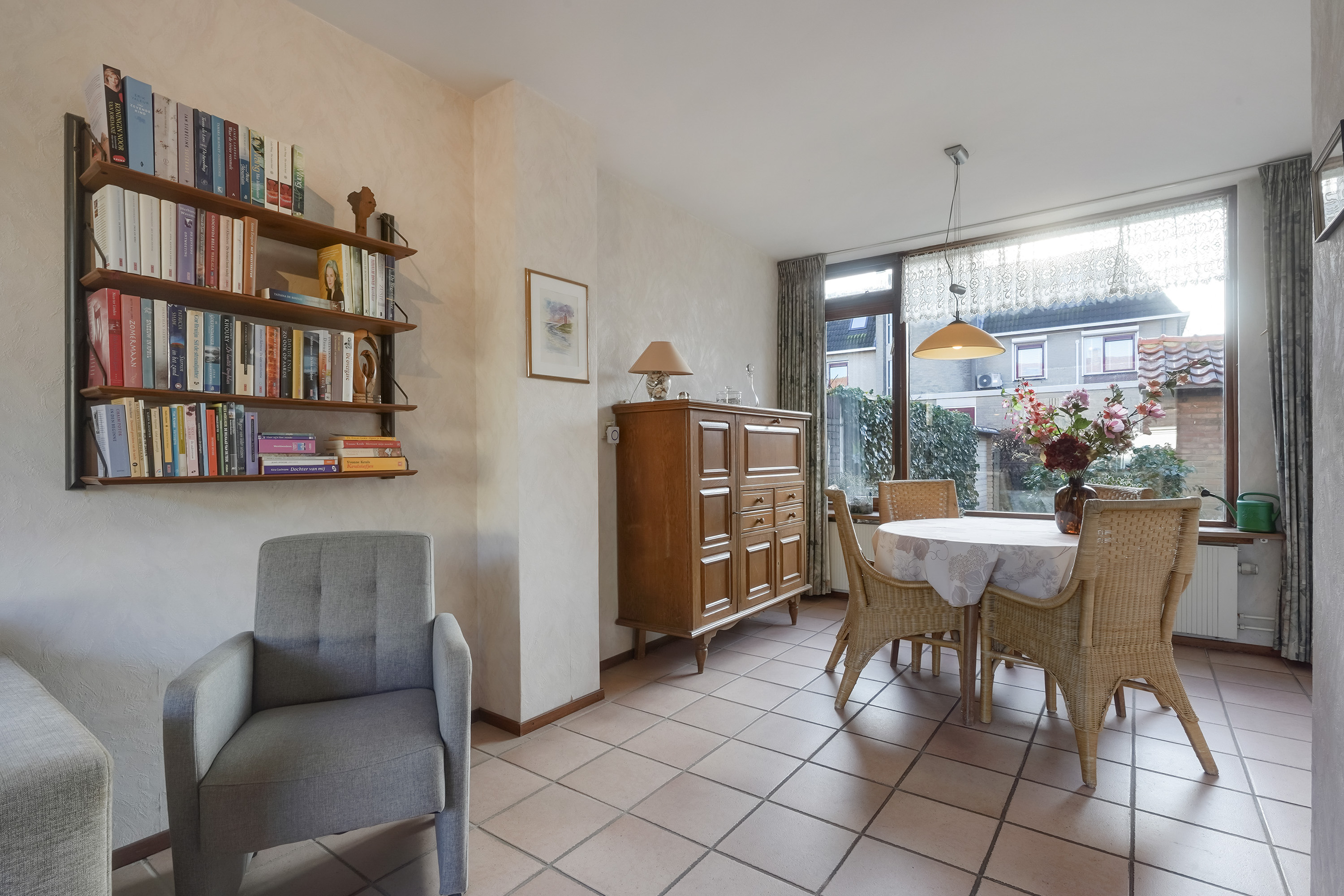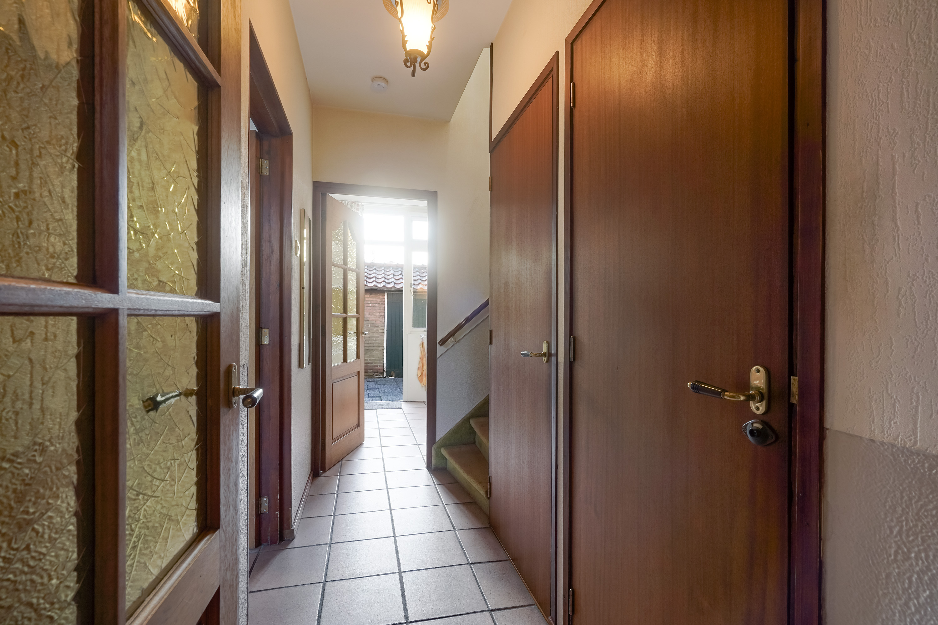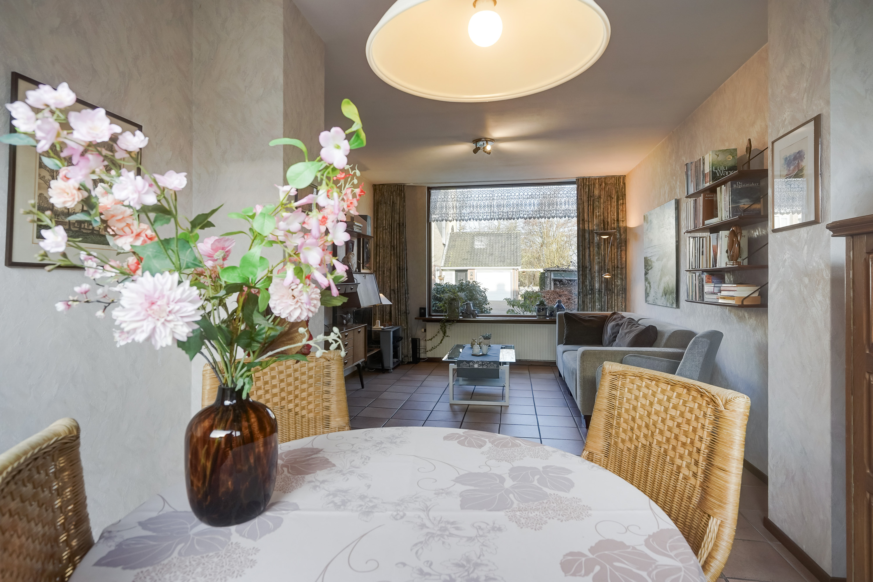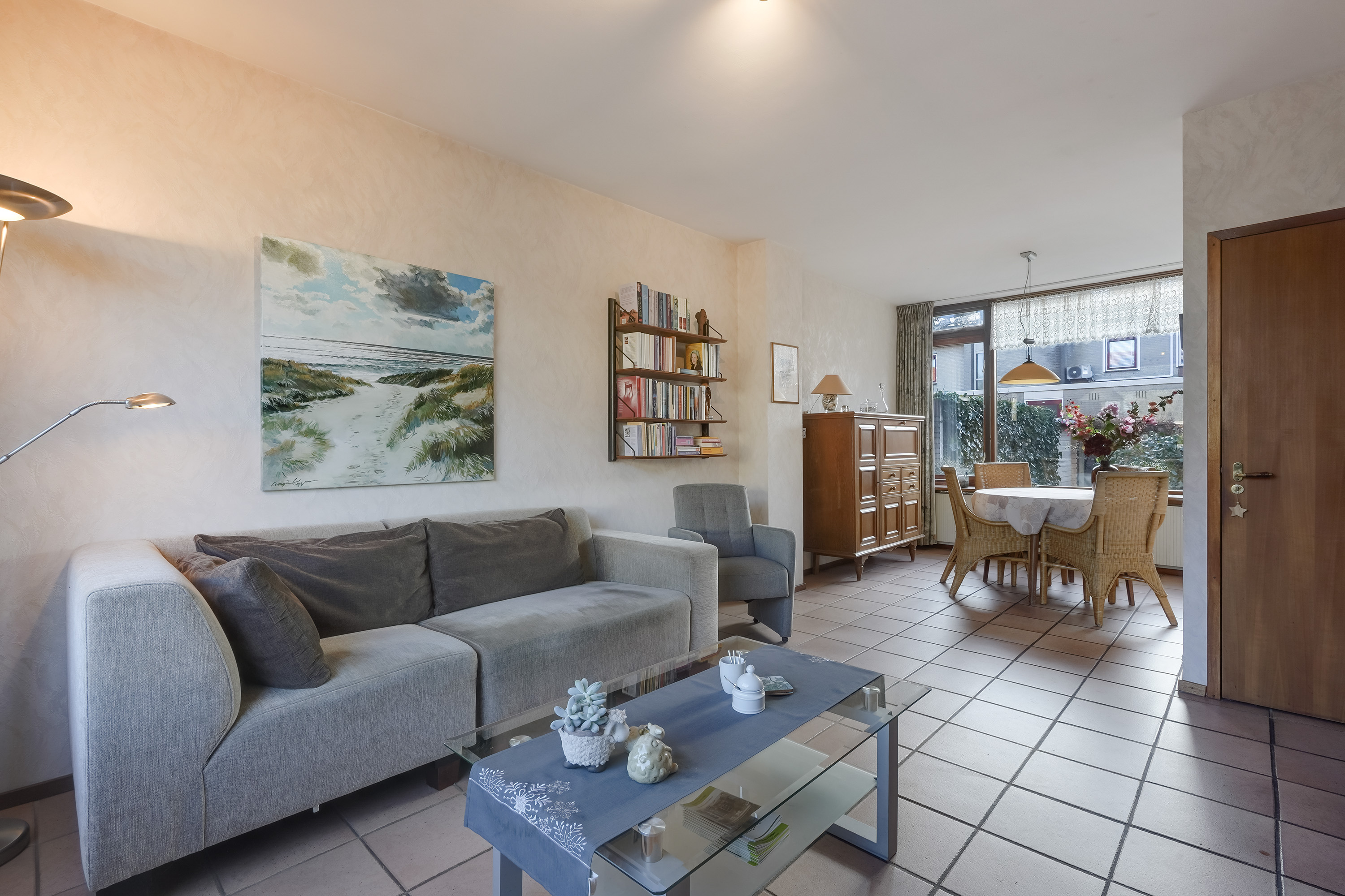Via de entree kom je binnen in de hal met meterkast, toiletruimte. Vanuit de hal is er toegang tot de lichte woonkamer, gelegen over de volle breedte van de woning. Dankzij de grote raampartijen aan zowel de voor- als achterzijde is dit een prettige, open leefruimte met een fijne lichtinval.