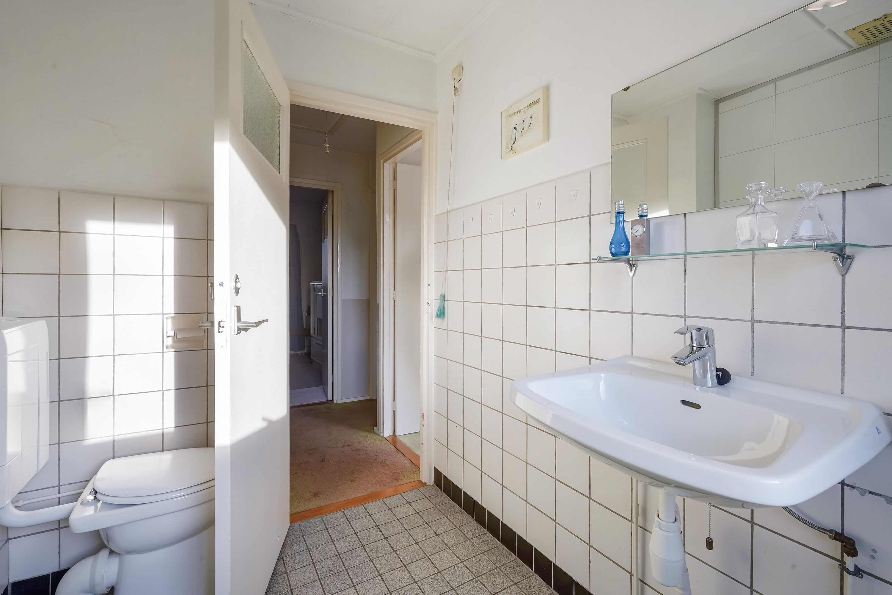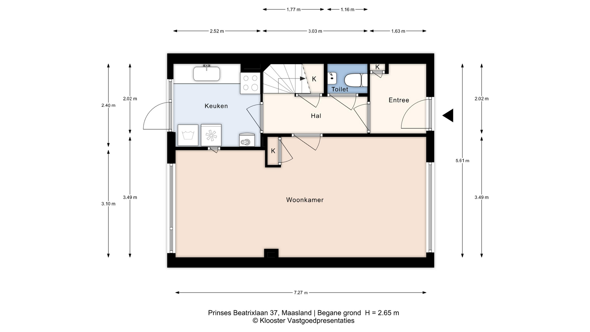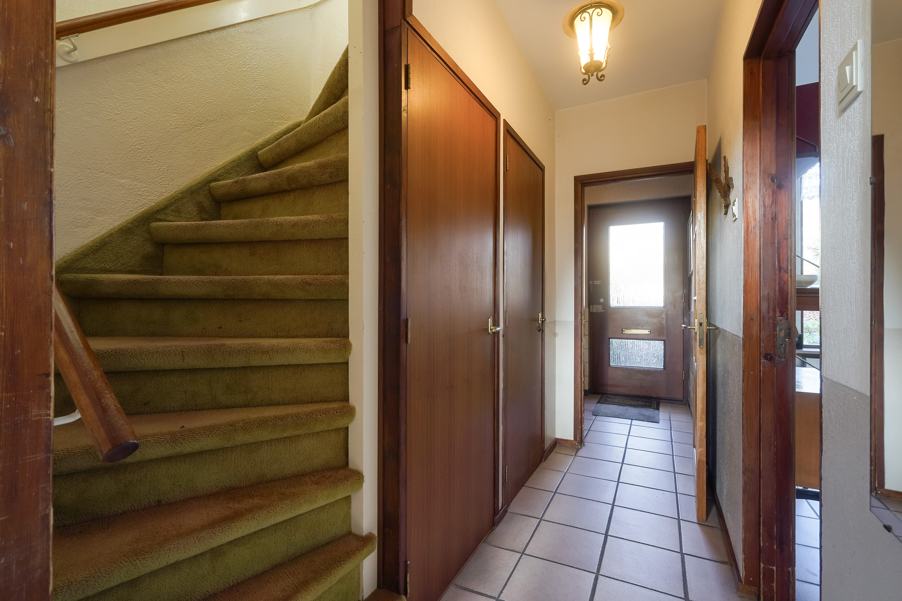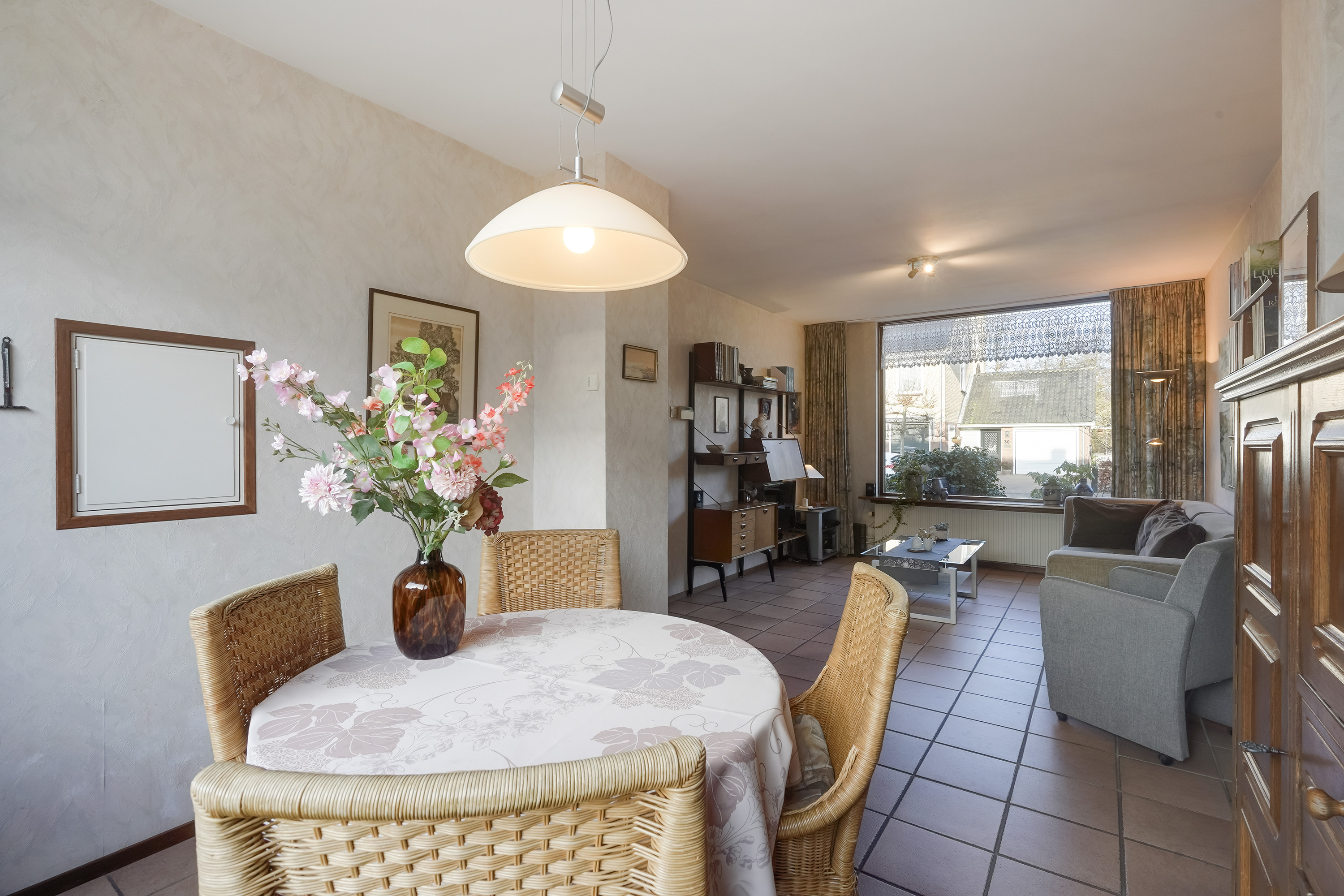 Via de entree kom je binnen in de hal met meterkast, toiletruimte. Vanuit de hal is er toegang tot de lichte woonkamer, gelegen over de volle breedte van de woning. Dankzij de grote raampartijen aan zowel de voor- als achterzijde is dit een prettige, open leefruimte met een fijne lichtinval.