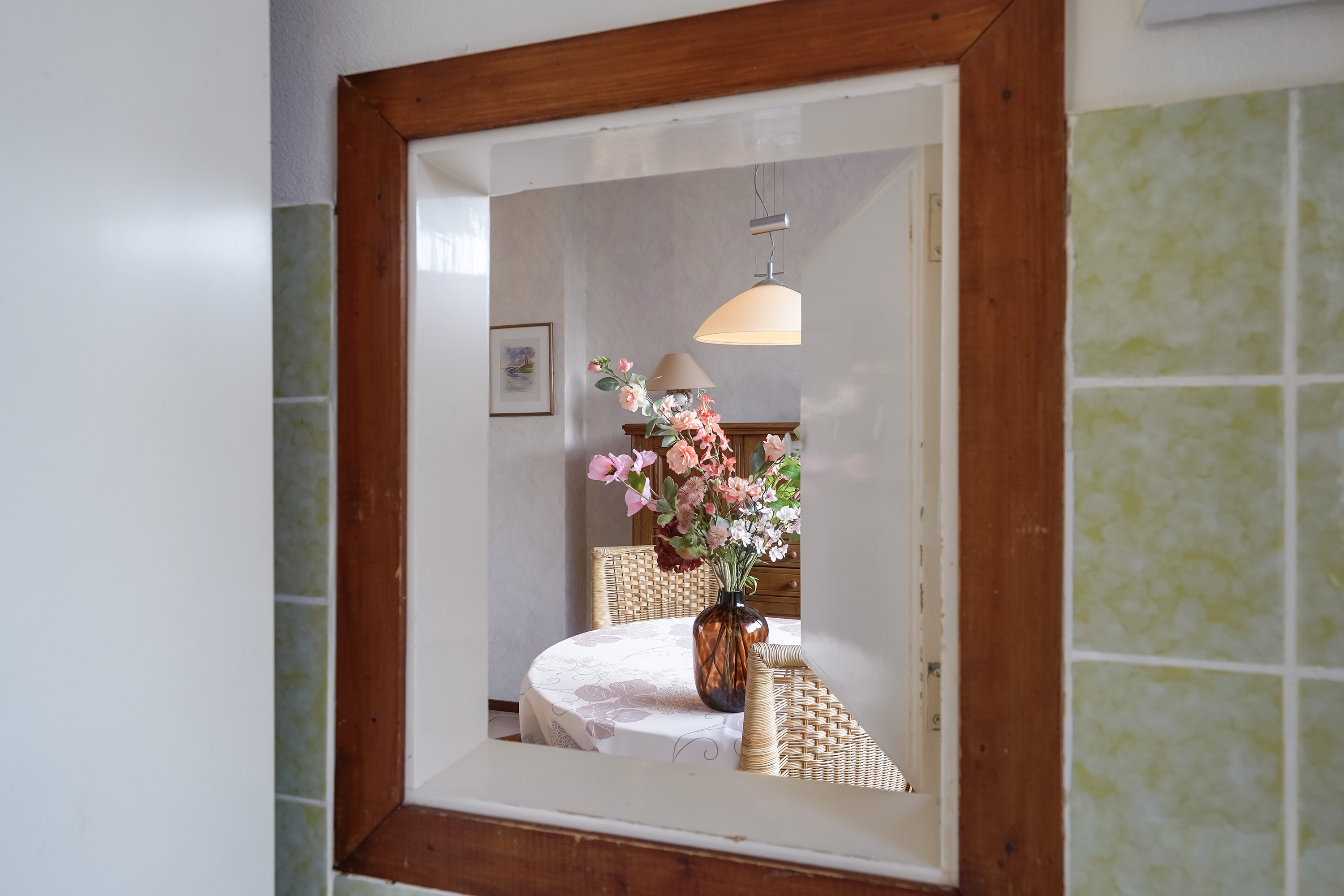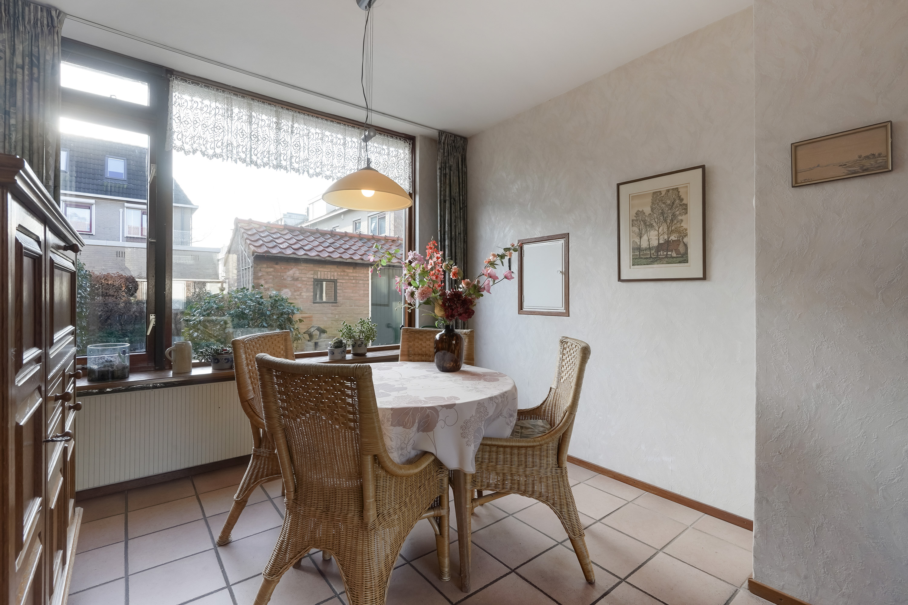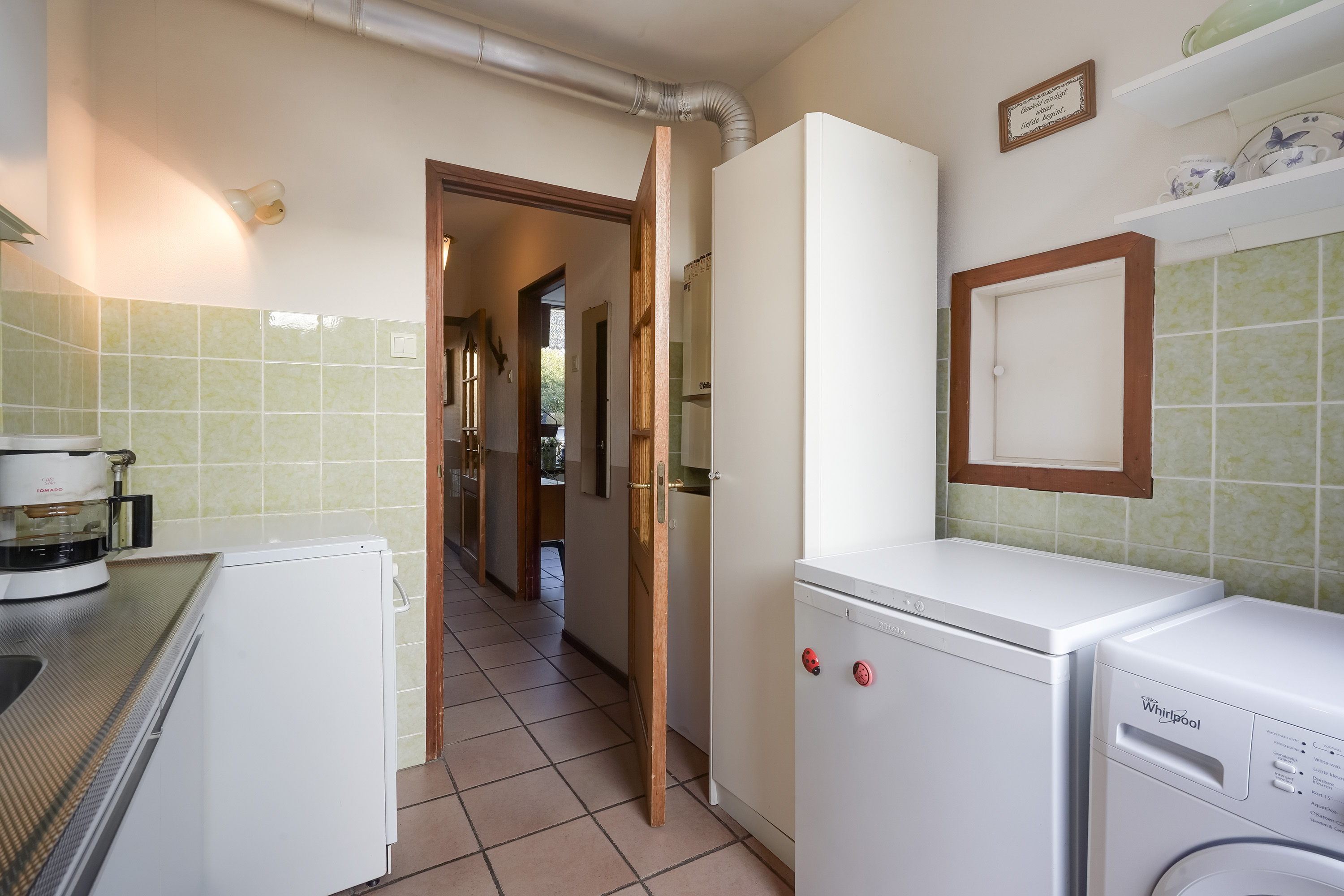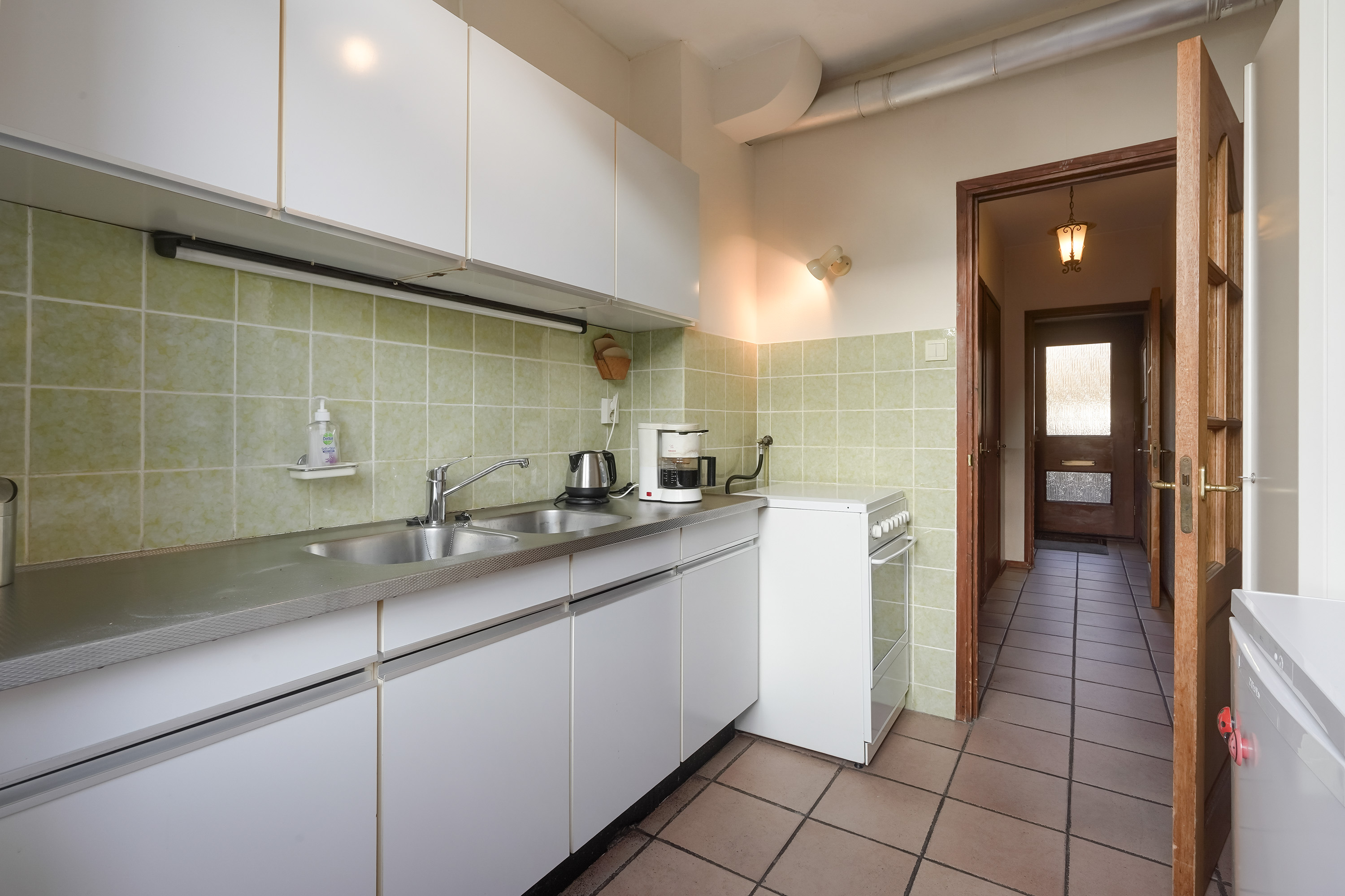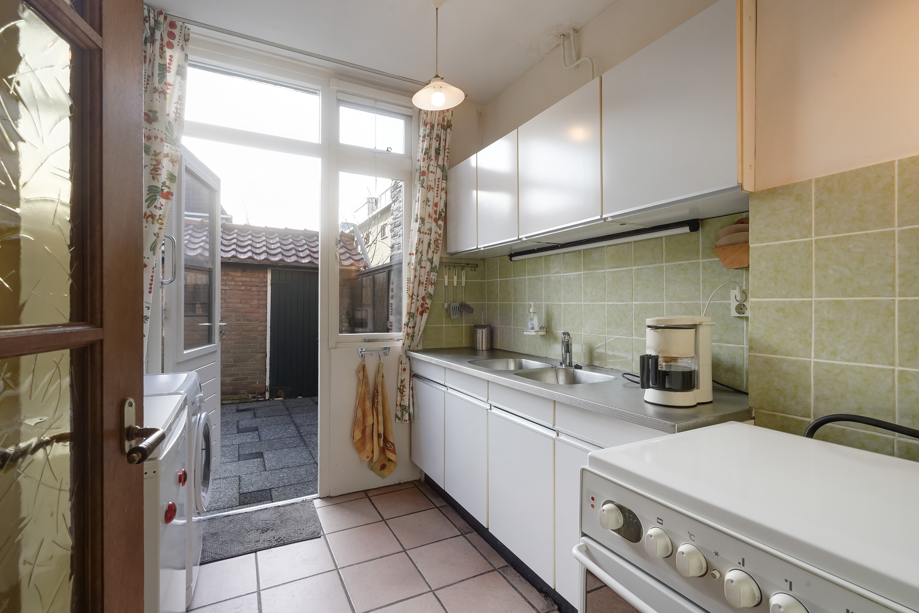 Aan de achterzijde bevindt zich de keuken, die praktisch is ingedeeld en direct in verbinding staat met de tuin. Vanuit de keuken is er toegang tot de achtertuin, wat het geheel extra prettig maakt in de zomermaanden.