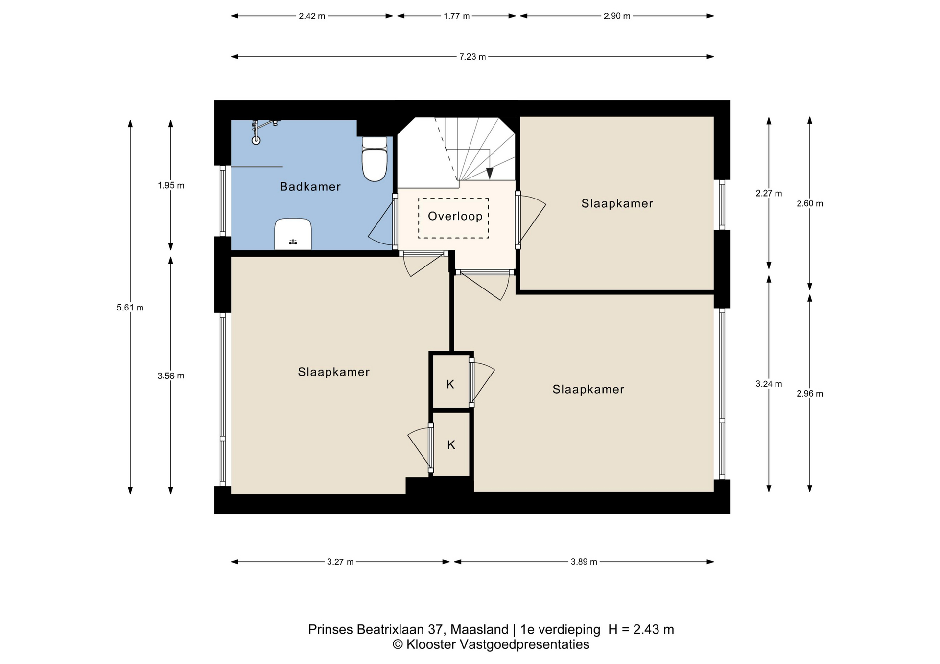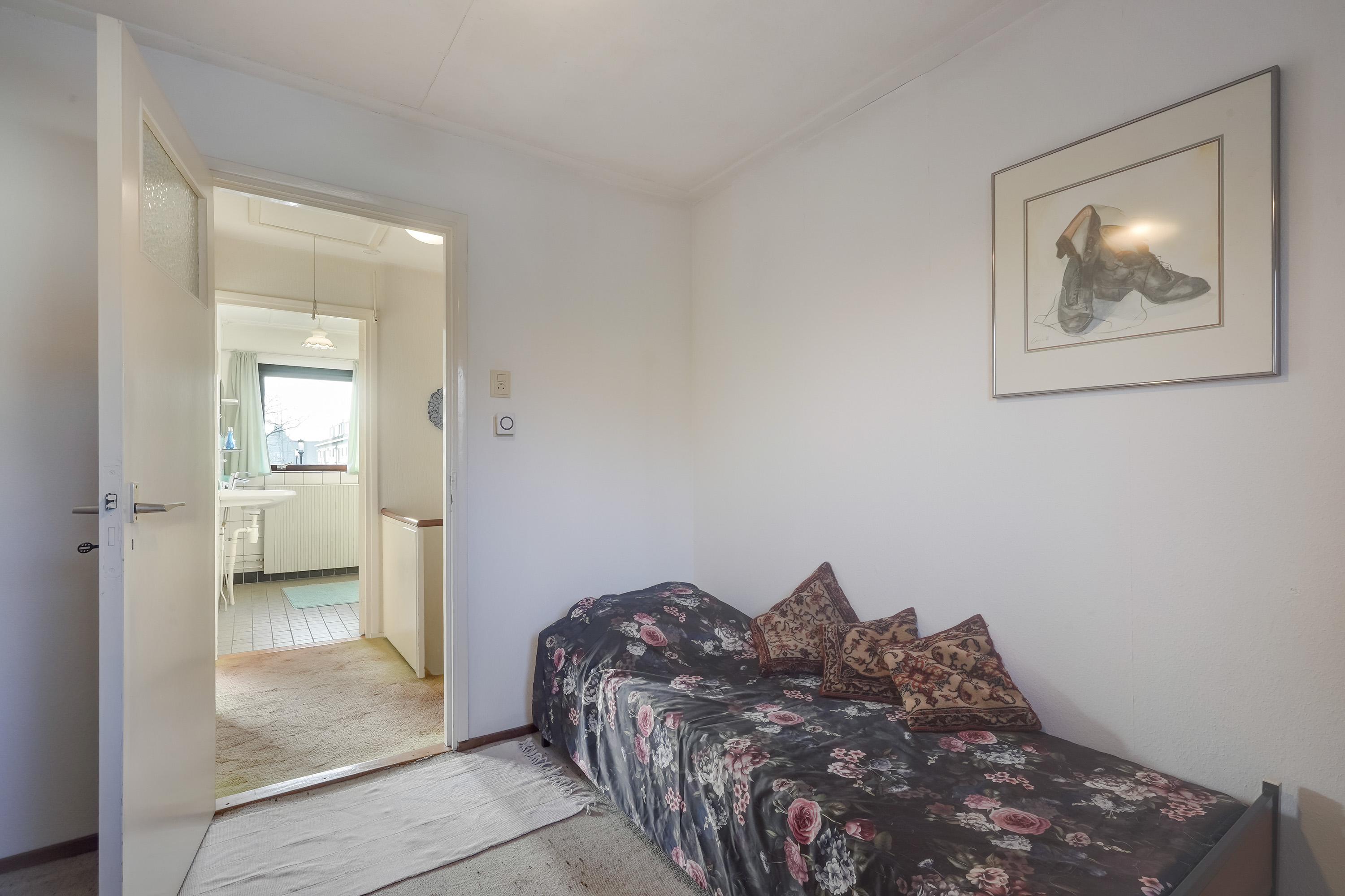 Op de eerste verdieping bevinden zich drie slaapkamers, allen van een goed formaat en praktisch in te delen. De badkamer is centraal gelegen en voorzien van een douche, wastafel en toilet. Vanaf de overloop is tevens de vliering bereikbaar.