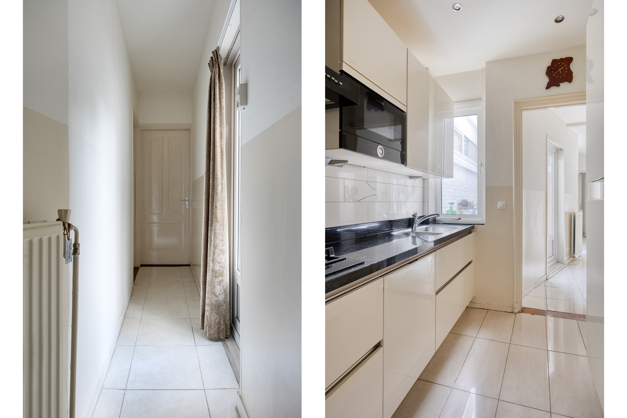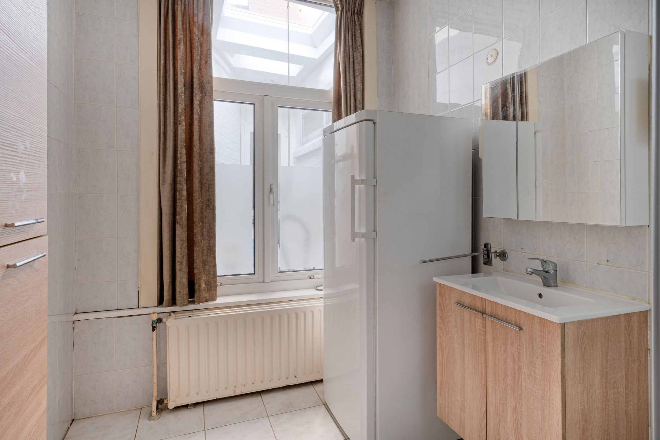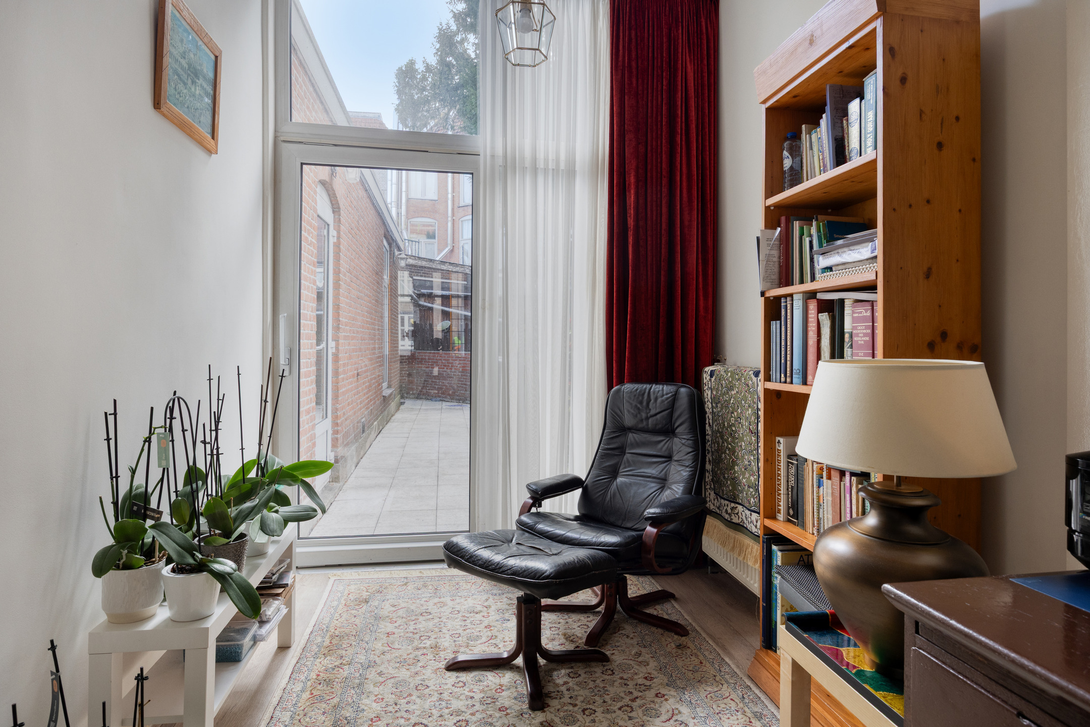 From the hallway, you enter the spacious living and dining room en suite, where high ceilings and ornate ornamentation immediately create a sense of space. From the dining room, you walk through to the back hallway, where the kitchen is located. It is equipped with various built-in appliances, including a 5-burner gas stove, a Bosch oven and microwave, an extractor hood, and a dishwasher. Continuing down the back hallway, you first pass a charming covered courtyard. Continuing down this hallway, you arrive at the spacious bathroom, equipped with a comfortable shower, a sink, and a stylish vanity unit. Immediately adjacent is the generous bedroom, quietly situated at the rear of the house. From the back hallway, you also have access to the sunny garden of approximately 25 m², a wonderful place to relax. At the back of the garden is a practical shed, ideal for additional storage.