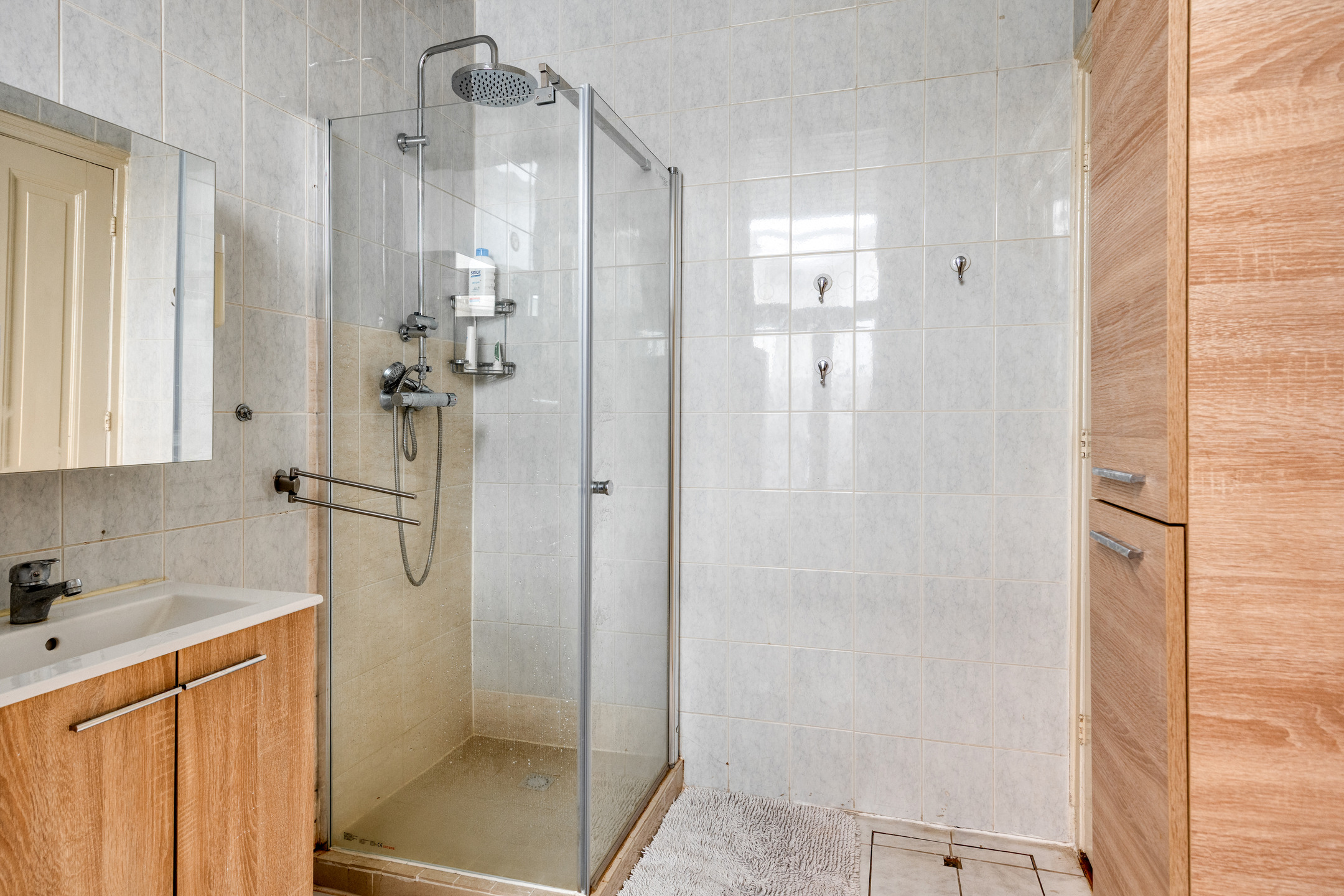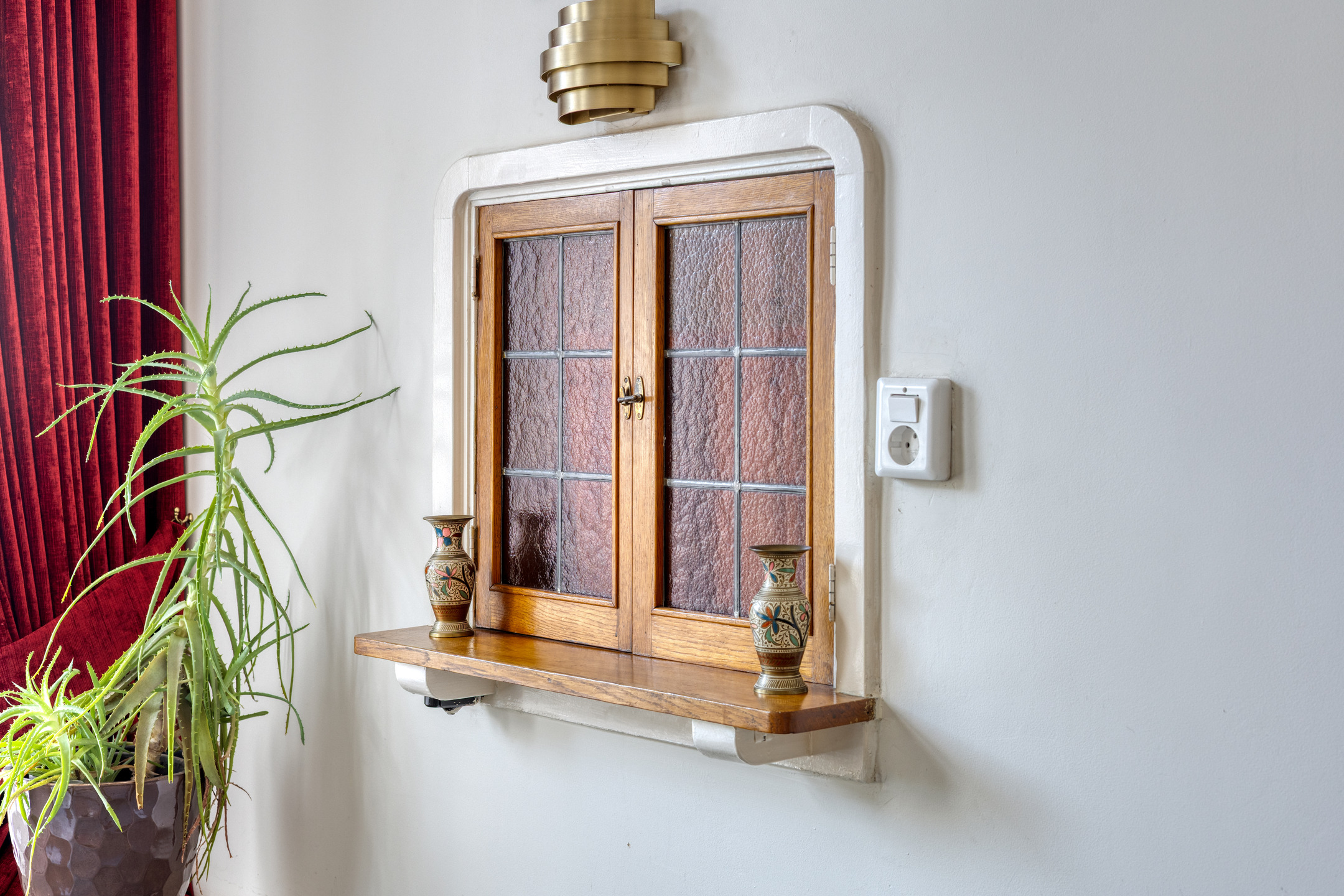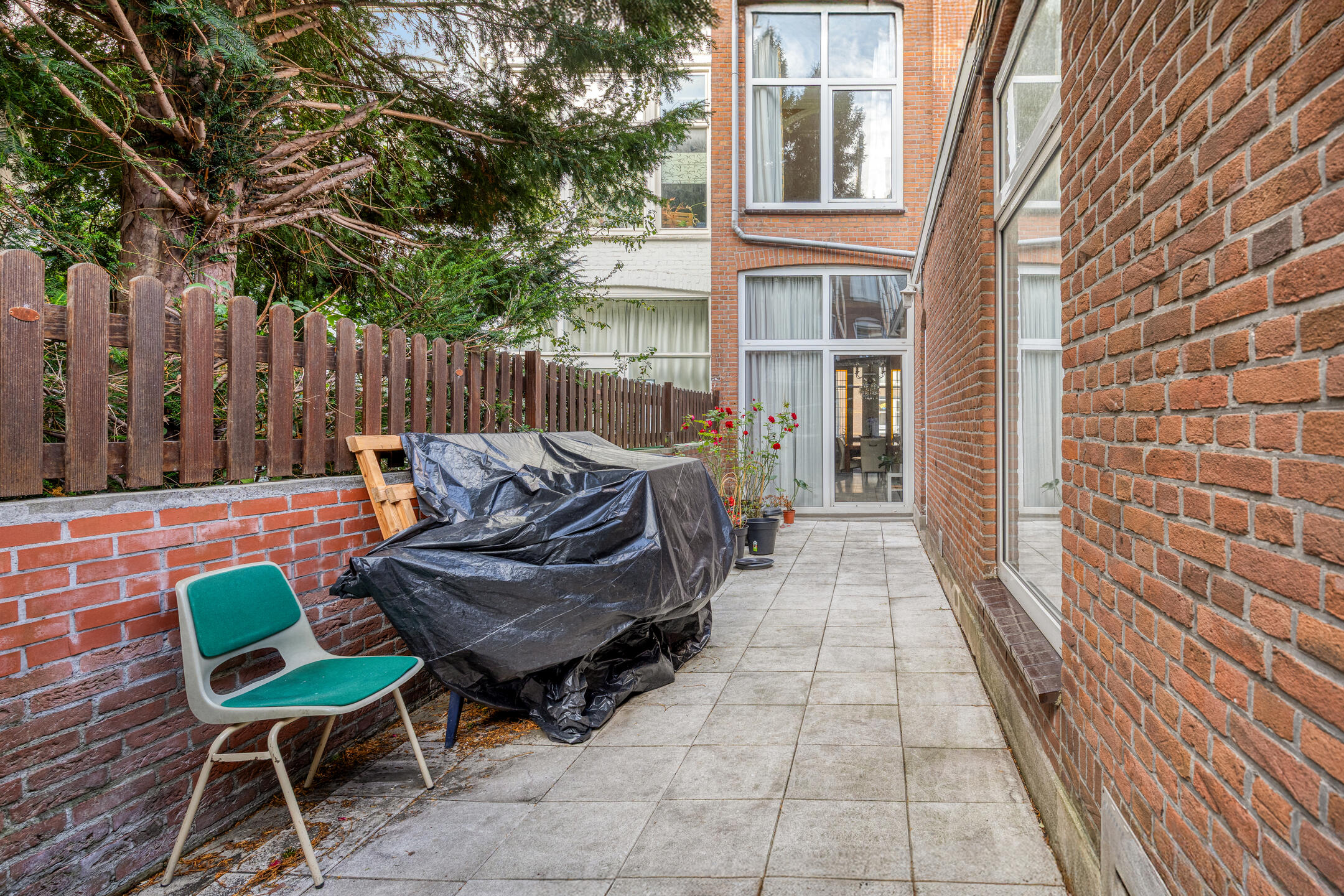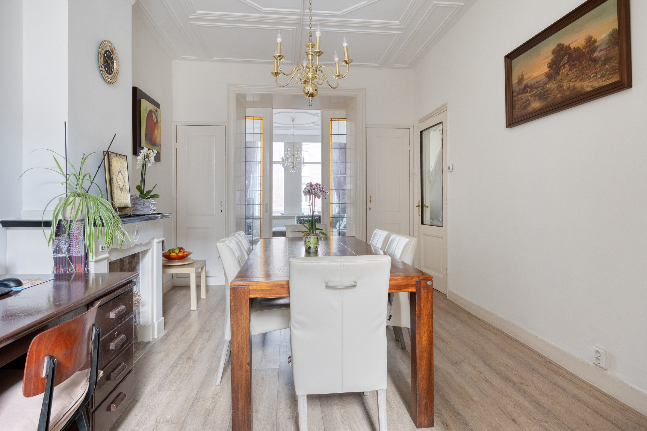 From the hallway, you enter the spacious living and dining room en suite, where high ceilings and ornate ornamentation immediately create a sense of space. From the dining room, you walk through to the back hallway, where the kitchen is located. It is equipped with various built-in appliances, including a 5-burner gas stove, a Bosch oven and microwave, an extractor hood, and a dishwasher. Continuing down the back hallway, you first pass a charming covered courtyard. Continuing down this hallway, you arrive at the spacious bathroom, equipped with a comfortable shower, a sink, and a stylish vanity unit. Immediately adjacent is the generous bedroom, quietly situated at the rear of the house. From the back hallway, you also have access to the sunny garden of approximately 25 m², a wonderful place to relax. At the back of the garden is a practical shed, ideal for additional storage.