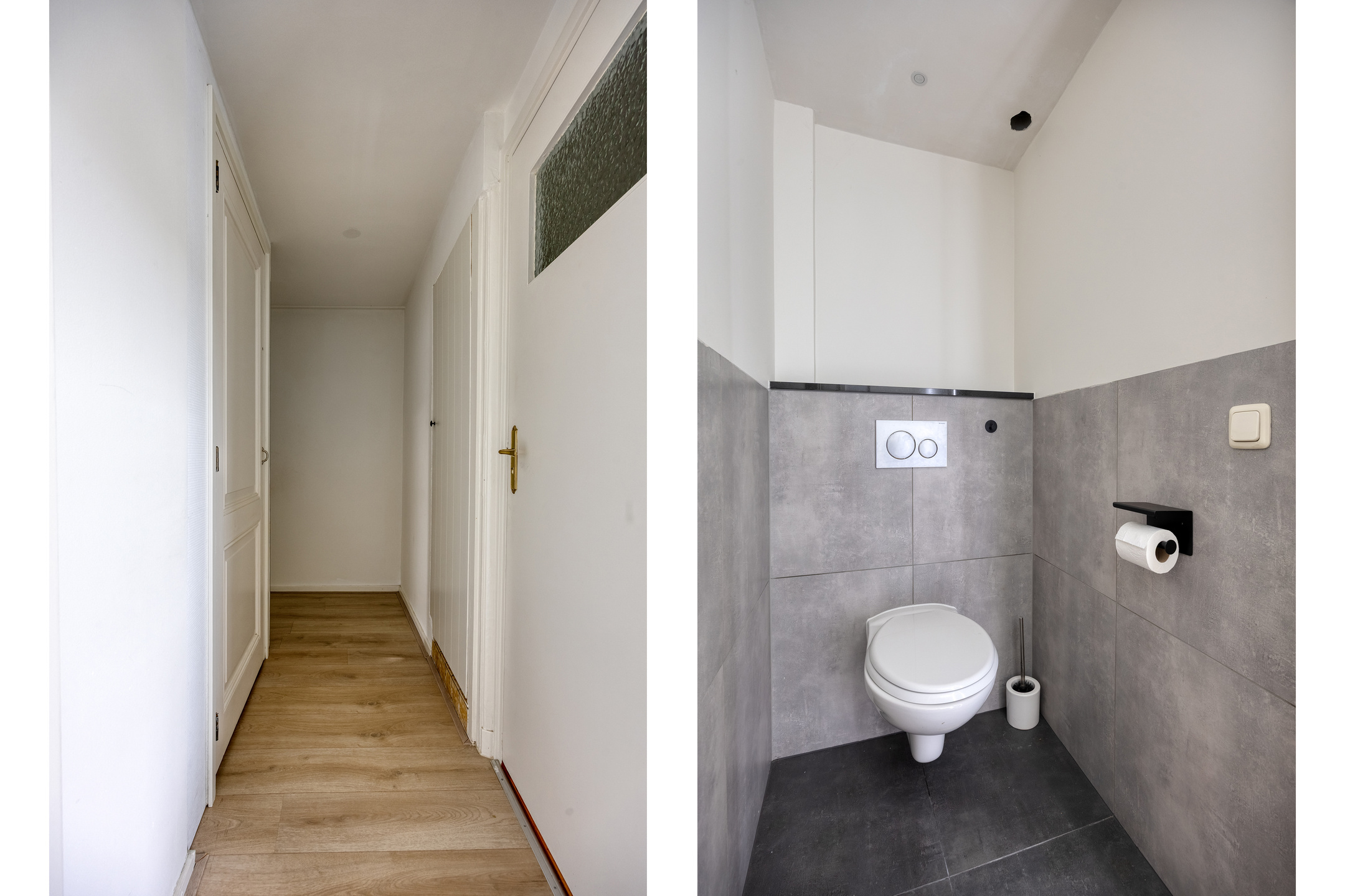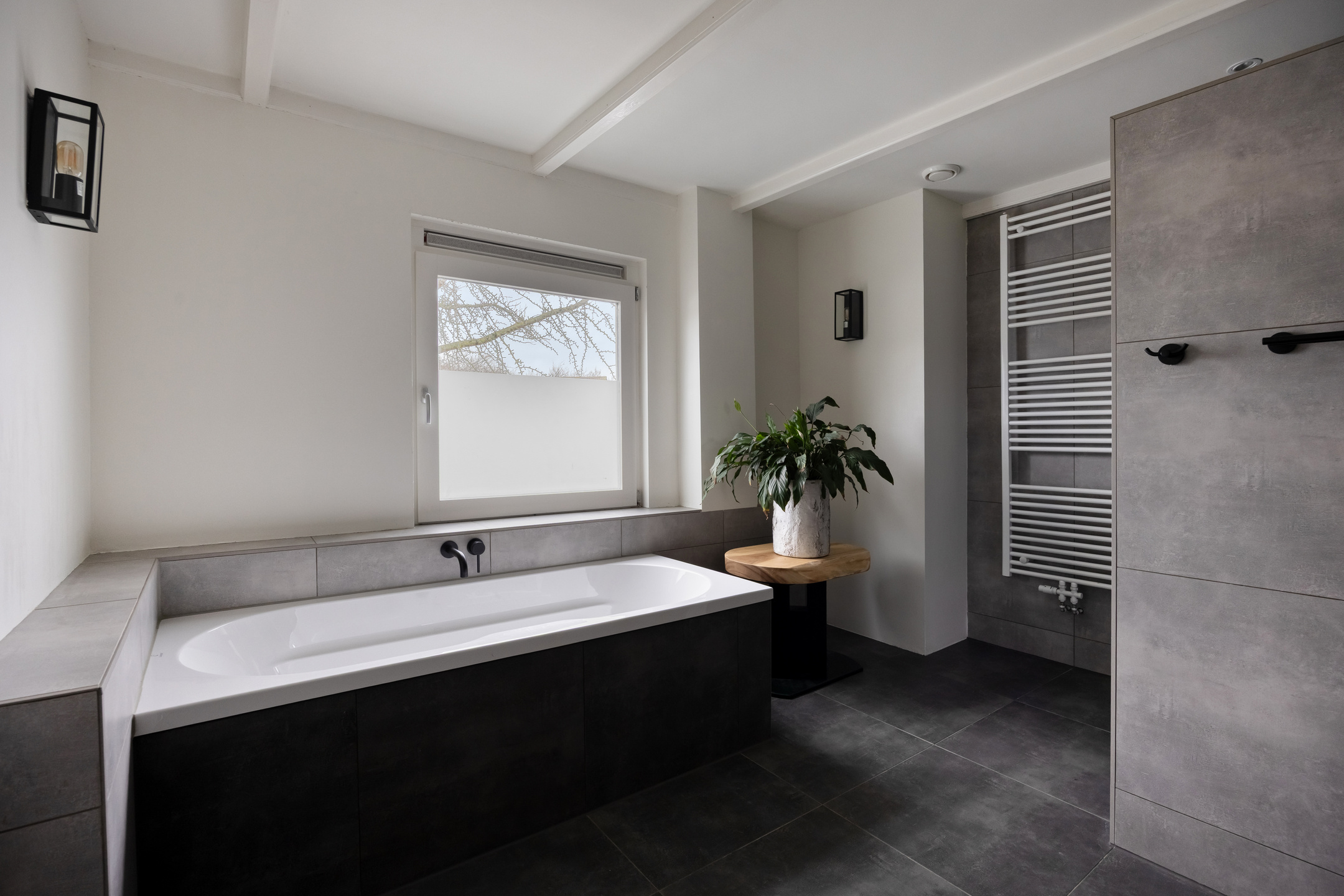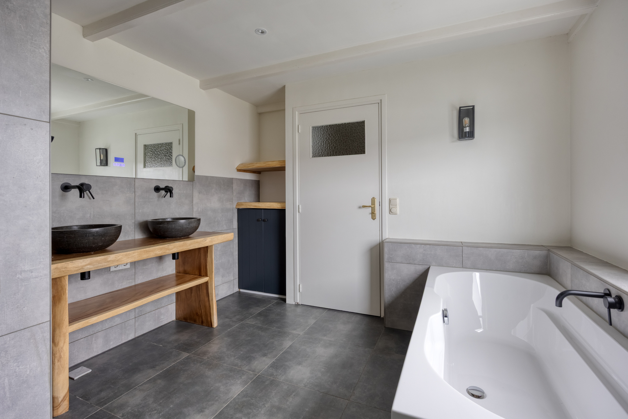 Op de eerste verdieping bevinden zich twee ruime slaapkamers van circa 23 m² en 10 m². De grootste kamer is afgewerkt met een laminaatvloer, terwijl de tweede kamer is voorzien van vloerbedekking. Op deze verdieping is de voormalige badkamer omgebouwd tot wasruimte en is er een separaat toilet aanwezig. Aan het einde van de gang bevindt zich de in 2022 volledig gemoderniseerde badkamer, die luxe is uitgevoerd met een dubbele wastafel met meubel, een inloopdouche en een ligbad.