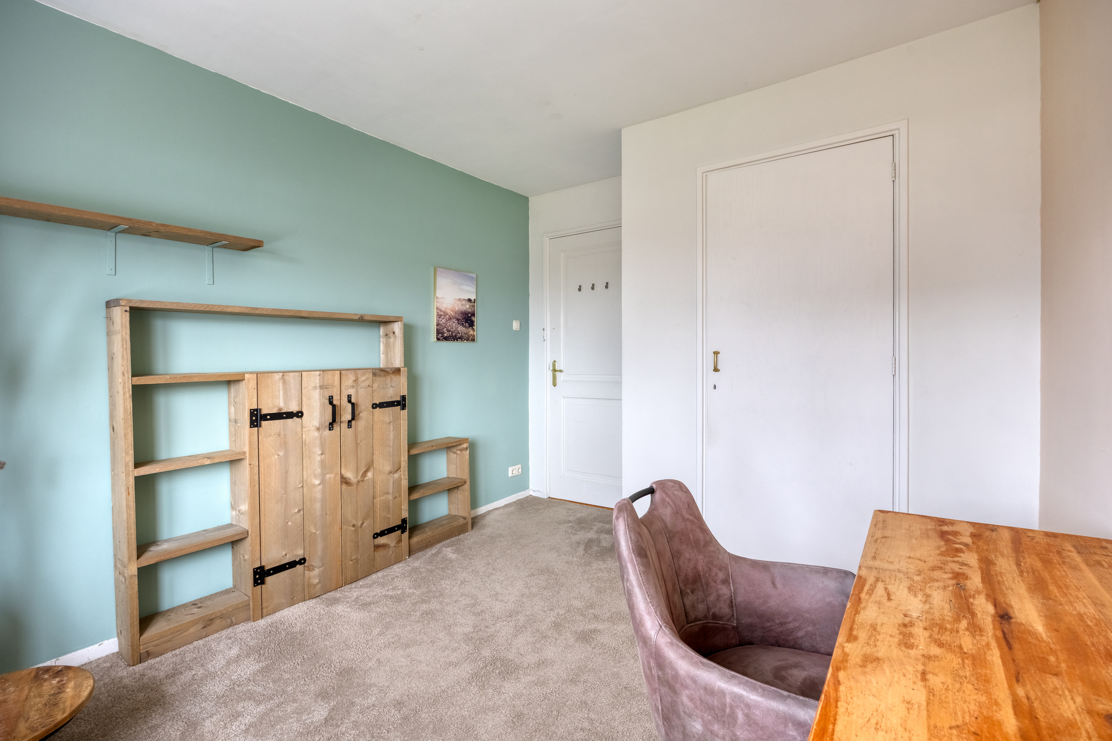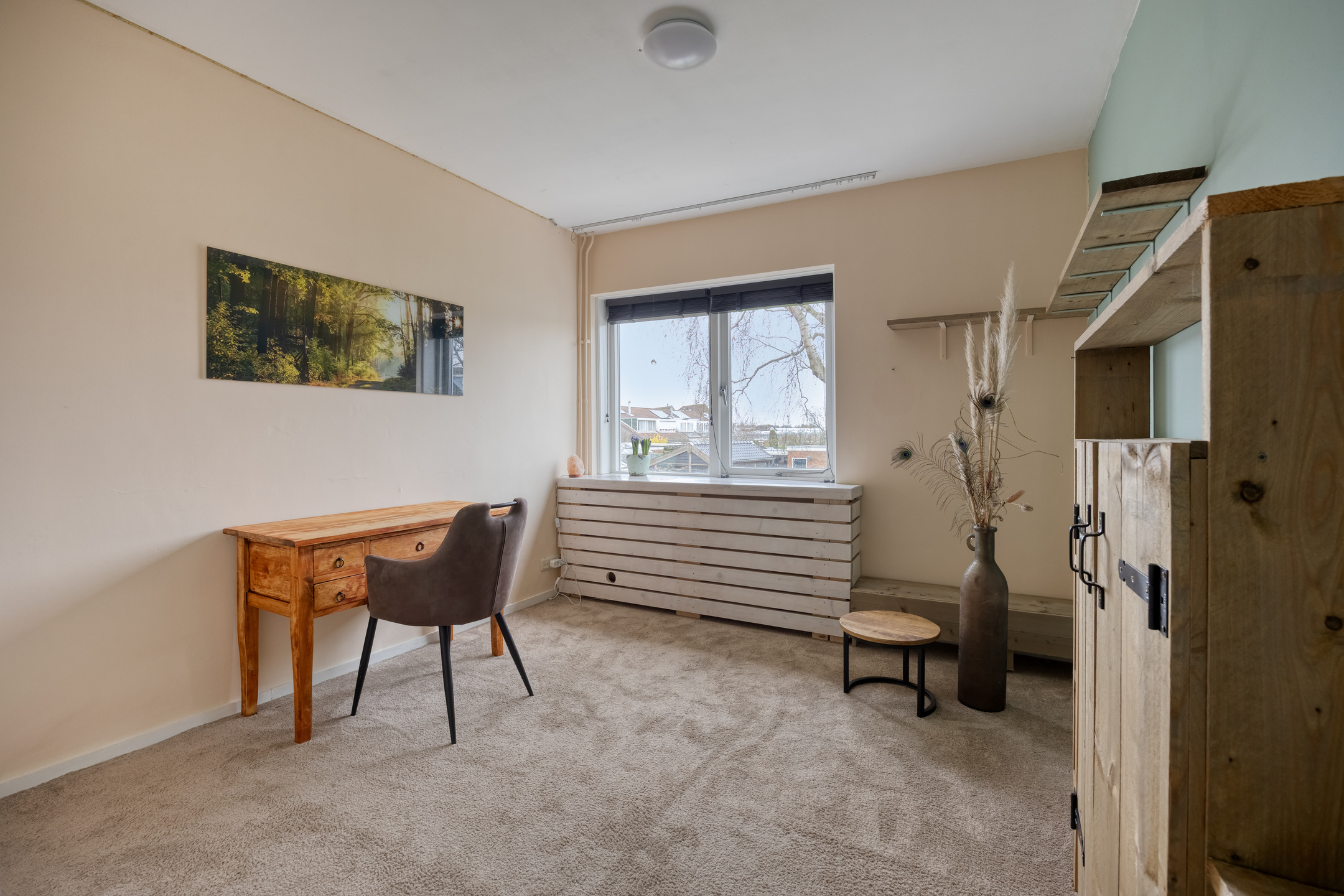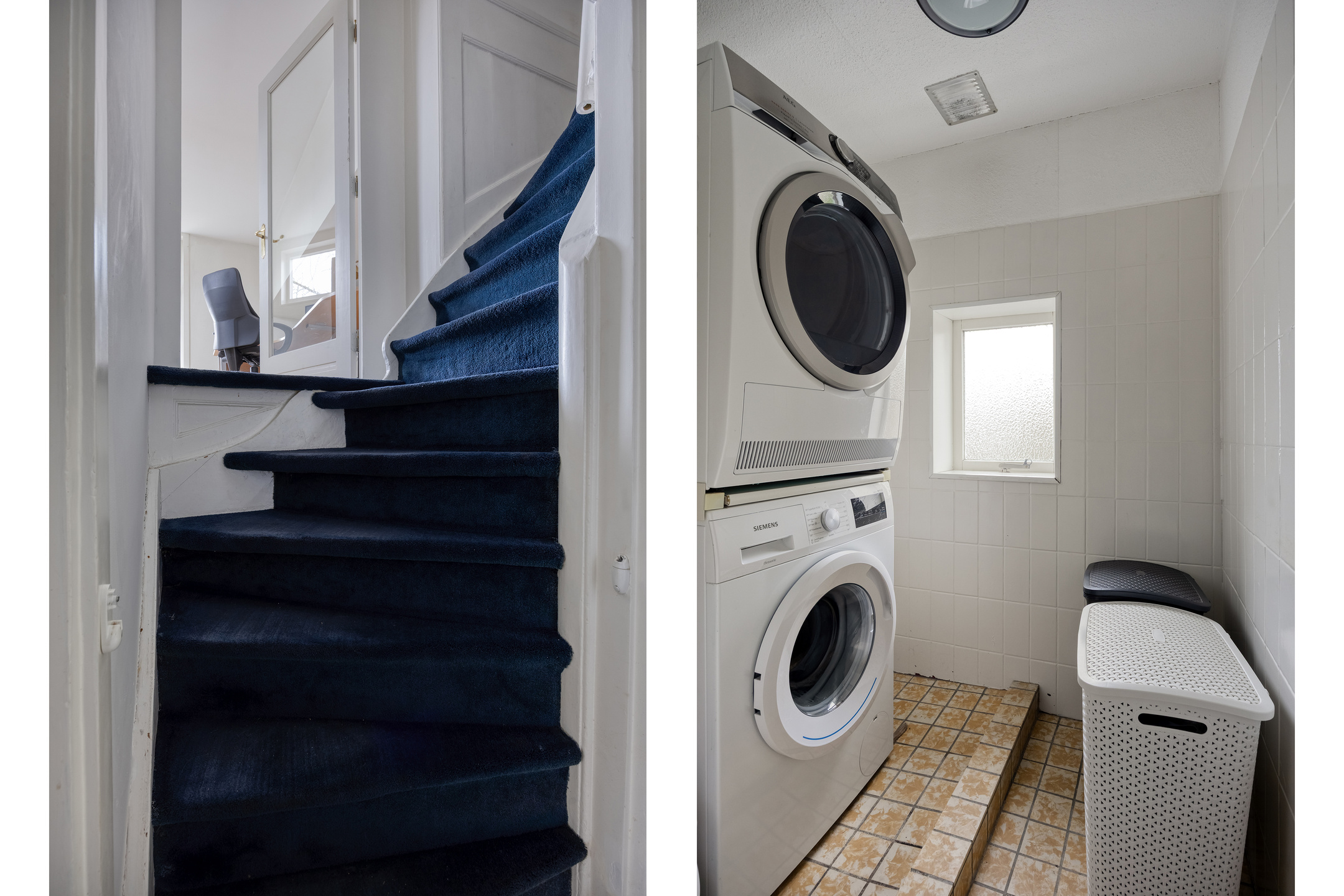 Op de eerste verdieping bevinden zich twee ruime slaapkamers van circa 23 m² en 10 m². De grootste kamer is afgewerkt met een laminaatvloer, terwijl de tweede kamer is voorzien van vloerbedekking. Op deze verdieping is de voormalige badkamer omgebouwd tot wasruimte en is er een separaat toilet aanwezig. Aan het einde van de gang bevindt zich de in 2022 volledig gemoderniseerde badkamer, die luxe is uitgevoerd met een dubbele wastafel met meubel, een inloopdouche en een ligbad.