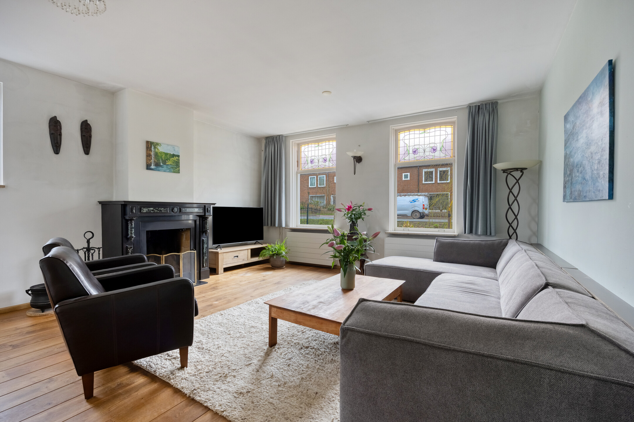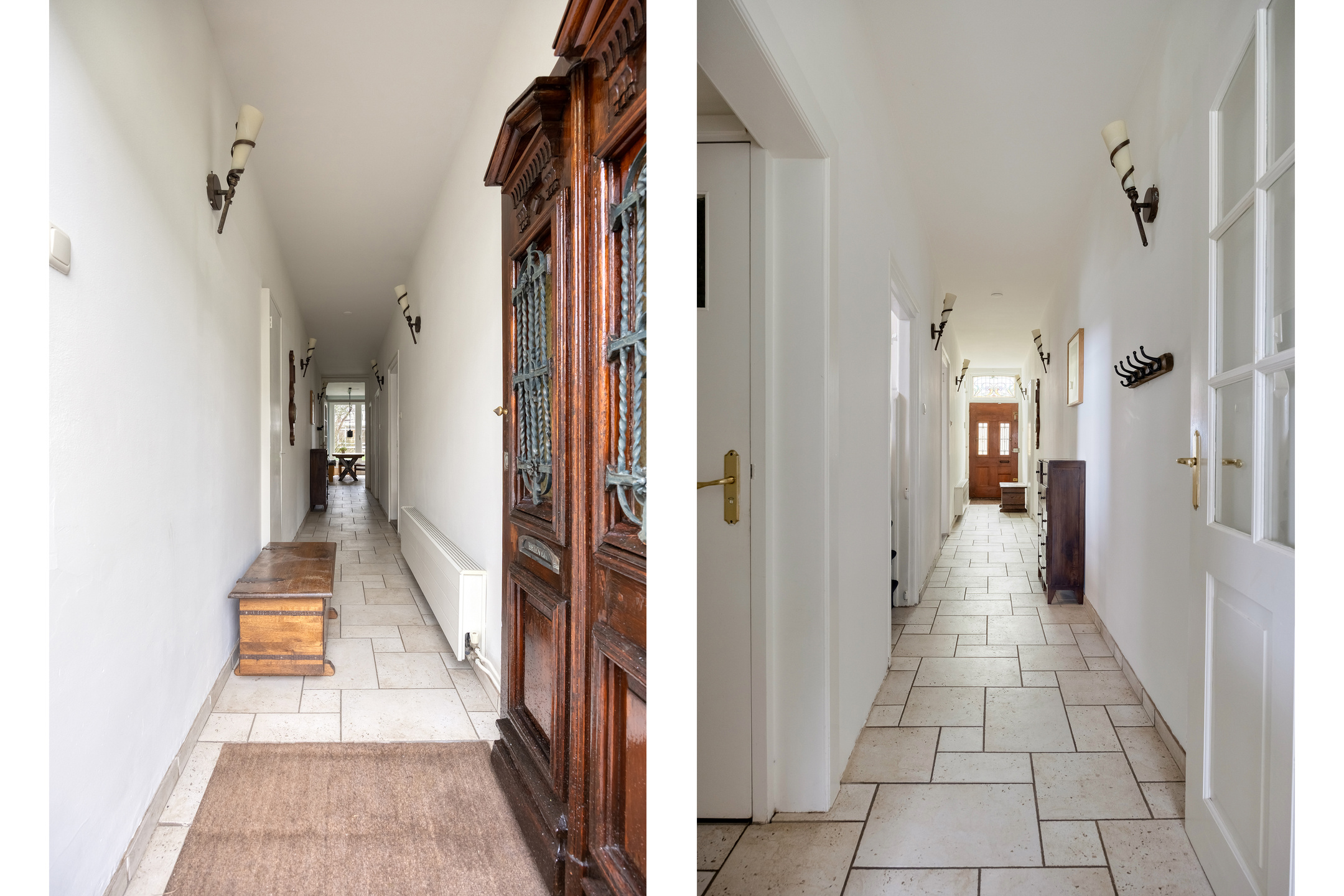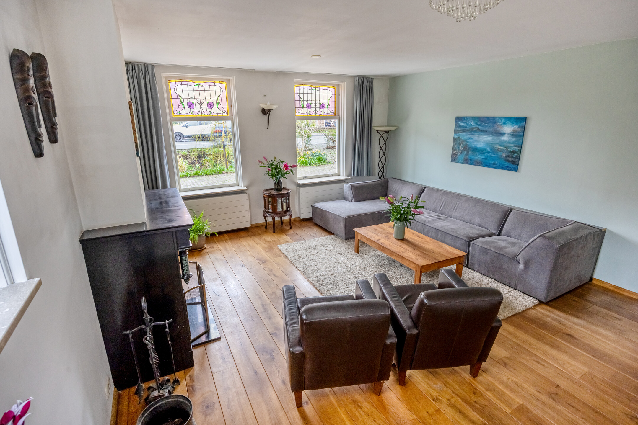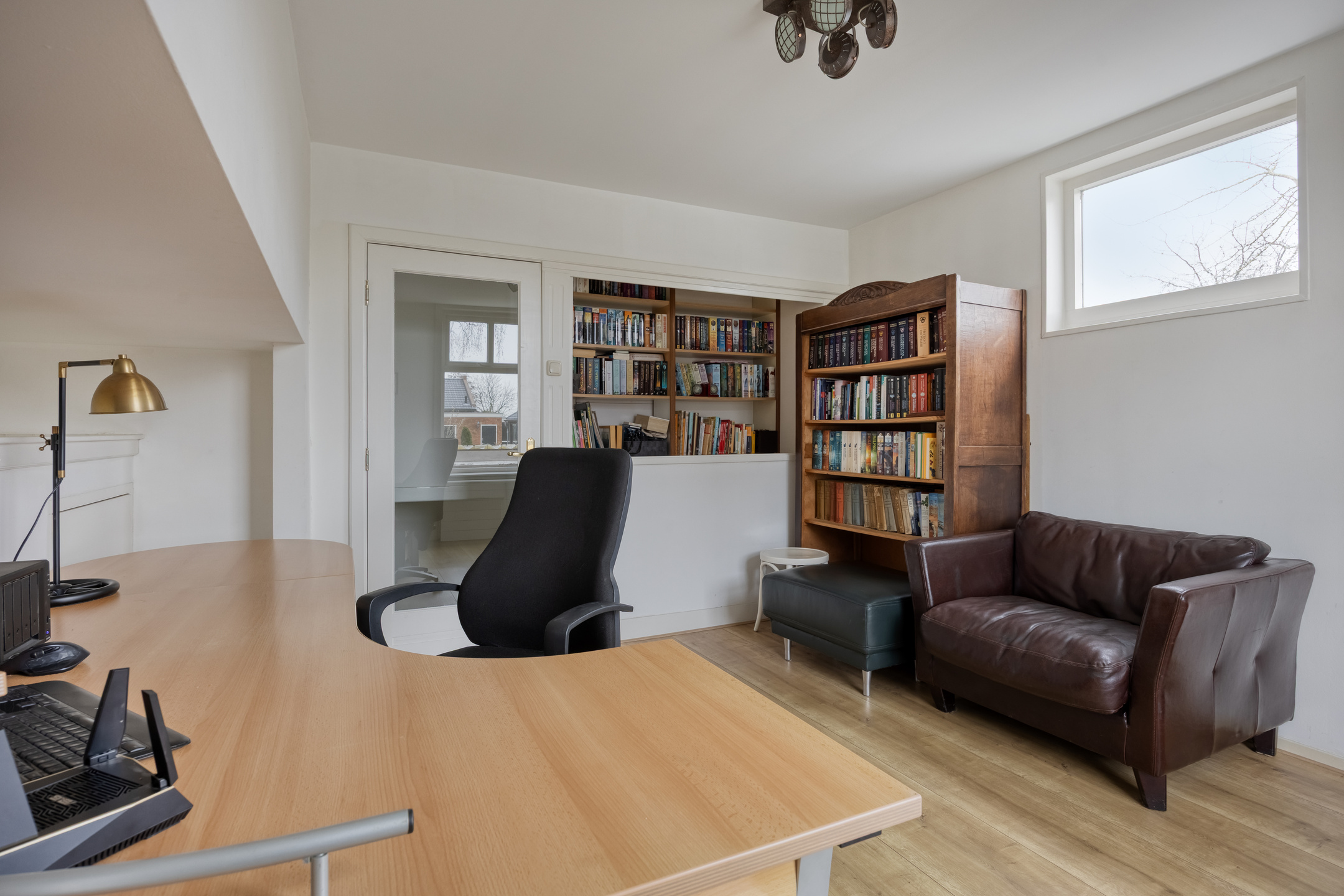 Via het recht van overpad over de oprit van de buren bereikt u de woning. Wanneer u binnenkomt betreedt u een opvallend lange hal die toegang geeft tot de verschillende vertrekken. Aan de voorzijde van de woning ligt de ruime woonkamer van circa 28 m², voorzien van authentieke elementen zoals een statige schouw en glas-in-loodramen. De houten vloer draagt bij aan de warme en karaktervolle uitstraling van de ruimte. Achter de woonkamer bevindt zich de voormalige opkamer, die momenteel dienst doet als werkkamer en eenvoudig kan worden ingericht als hobby- of slaapkamer. Tussen deze ruimtes bevindt zich een bijzondere kast die naar verluidt in het verleden als onderduikplaats heeft gefunctioneerd.