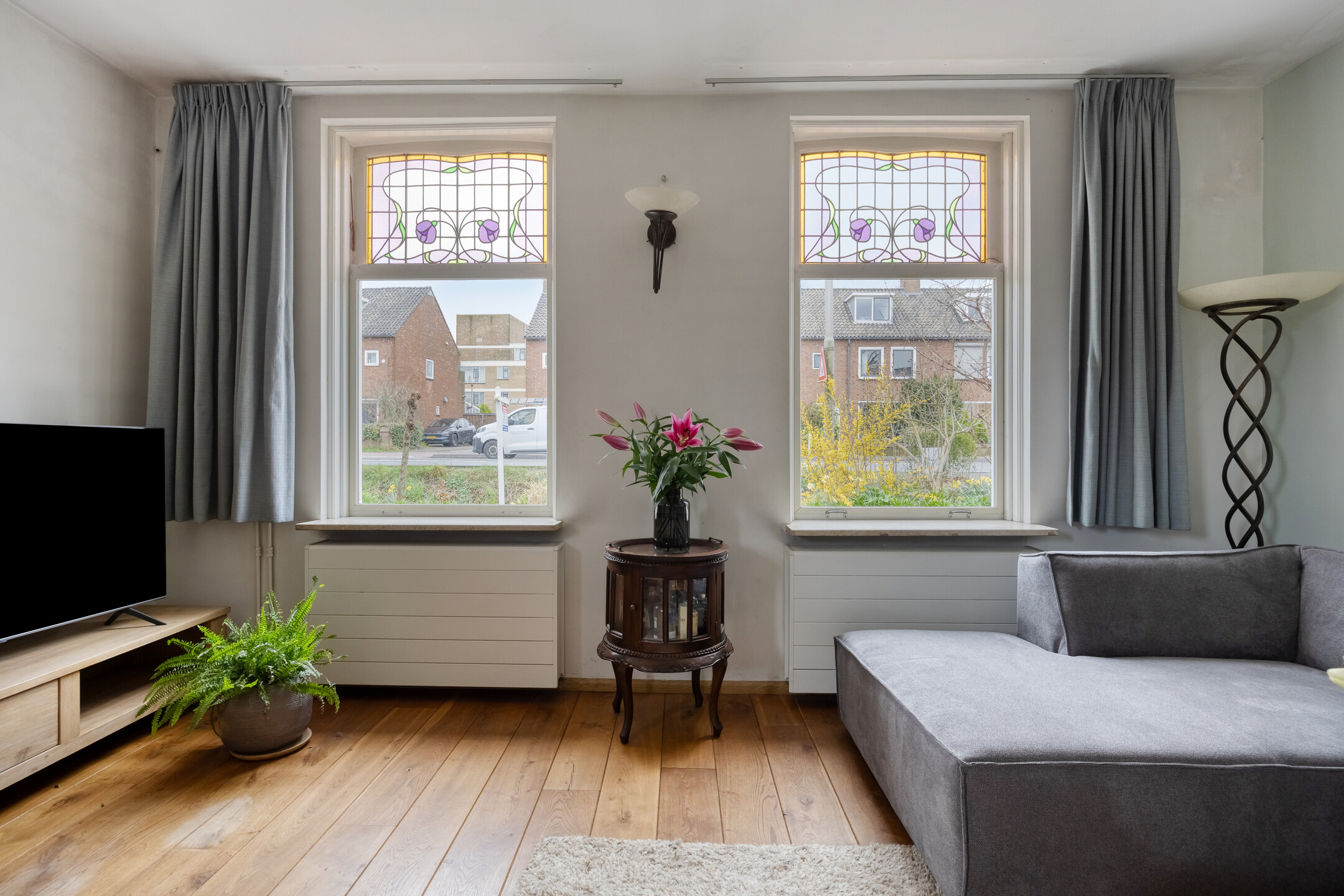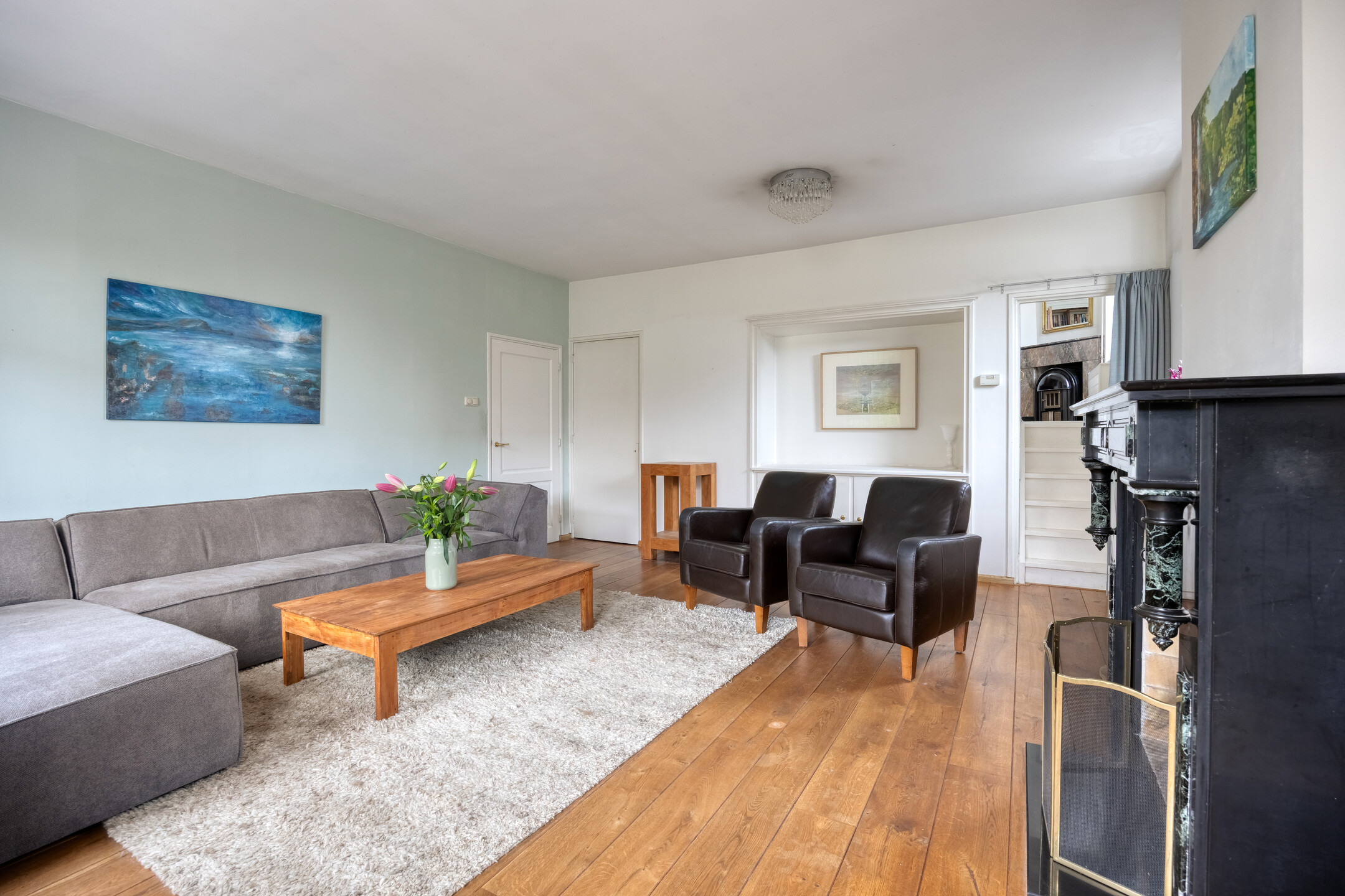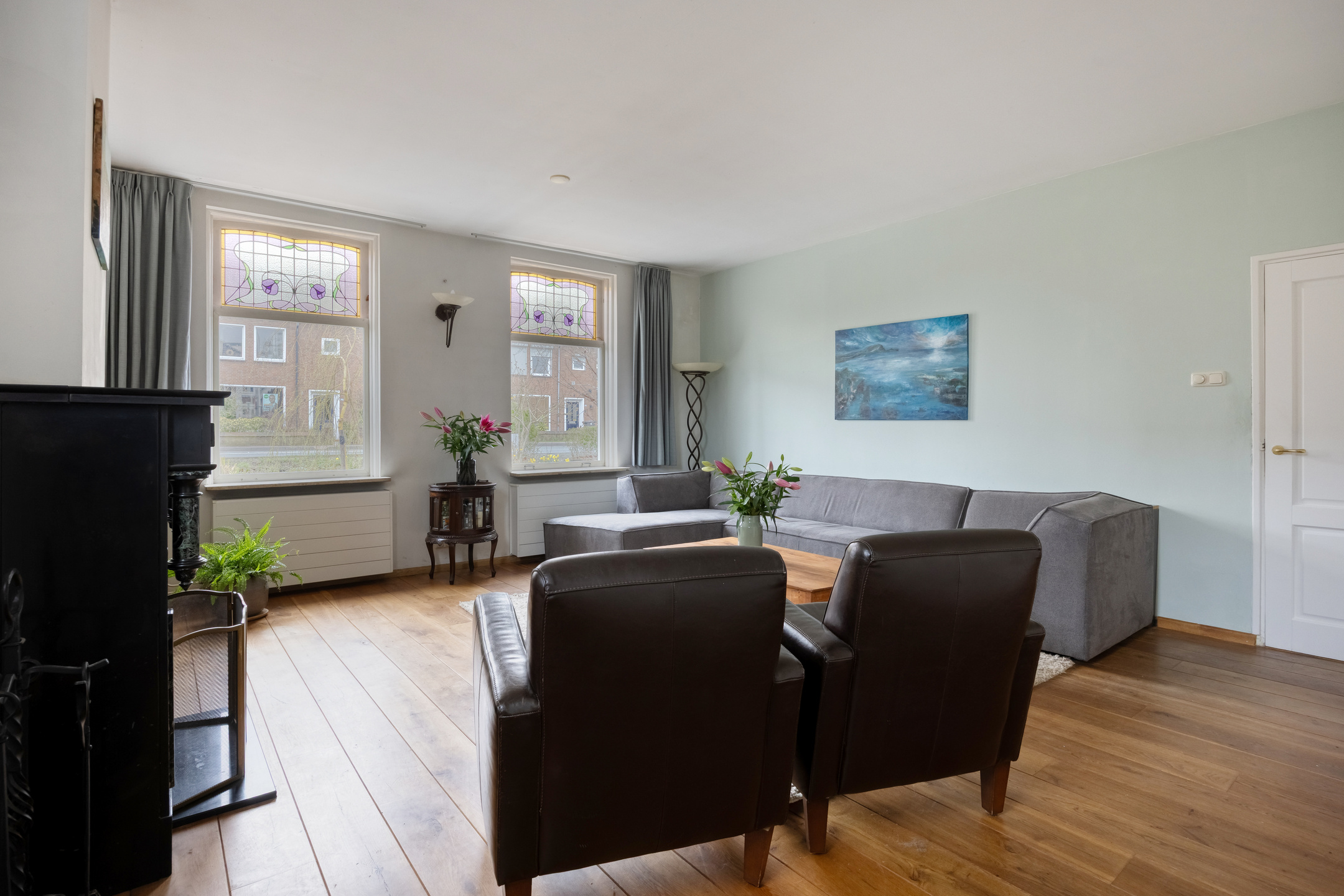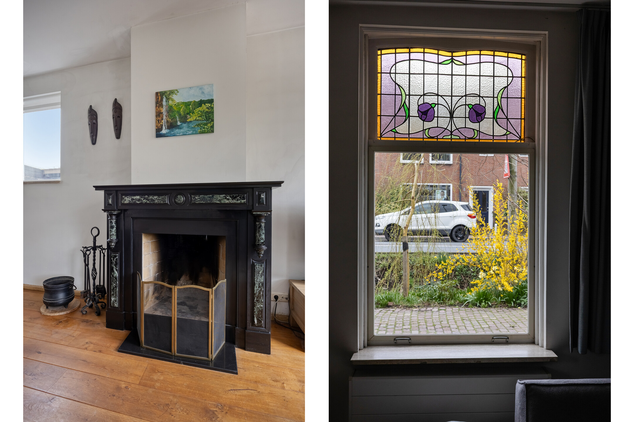 Via het recht van overpad over de oprit van de buren bereikt u de woning. Wanneer u binnenkomt betreedt u een opvallend lange hal die toegang geeft tot de verschillende vertrekken. Aan de voorzijde van de woning ligt de ruime woonkamer van circa 28 m², voorzien van authentieke elementen zoals een statige schouw en glas-in-loodramen. De houten vloer draagt bij aan de warme en karaktervolle uitstraling van de ruimte. Achter de woonkamer bevindt zich de voormalige opkamer, die momenteel dienst doet als werkkamer en eenvoudig kan worden ingericht als hobby- of slaapkamer. Tussen deze ruimtes bevindt zich een bijzondere kast die naar verluidt in het verleden als onderduikplaats heeft gefunctioneerd.