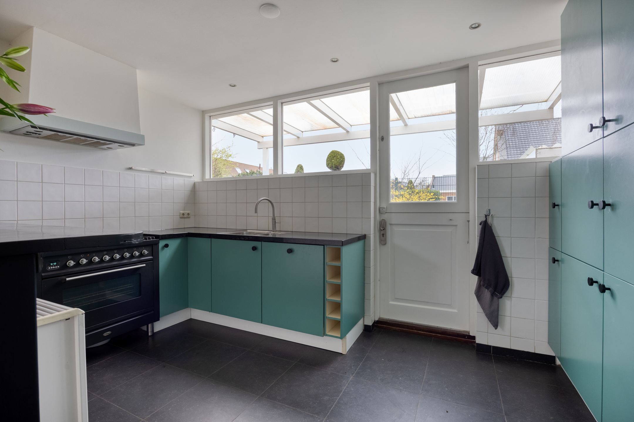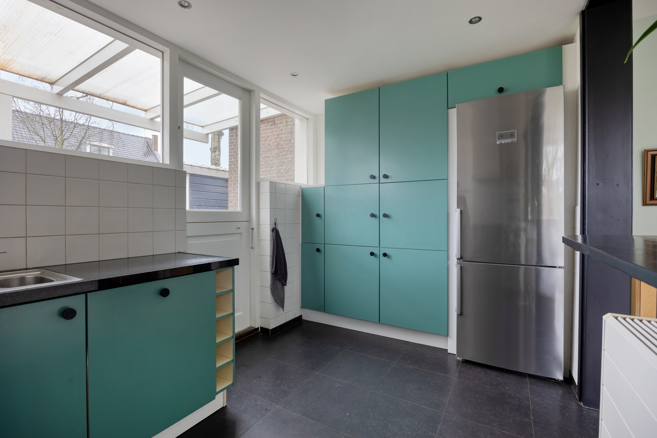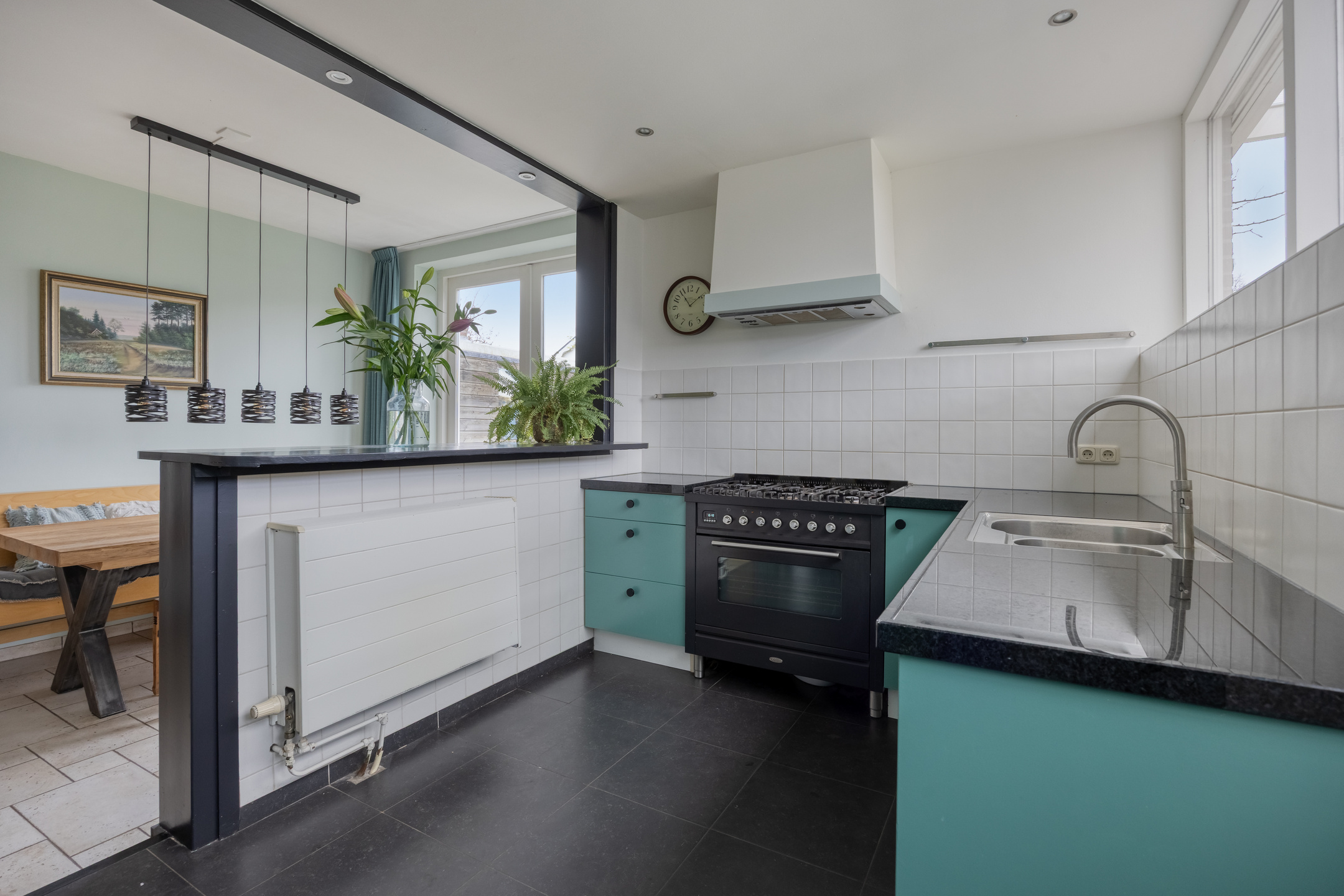 Verder naar achteren in de woning vindt u het gemoderniseerde, half betegelde toilet met fonteintje en de trapopgang naar de eerste verdieping. In de uitbouw aan de achterzijde bevindt zich de keuken, die in 2022 is vernieuwd. Deze is uitgevoerd met een stenen werkblad en voorzien van diverse inbouwapparatuur, waaronder een Quooker, koelkast, vriezer, afzuigkap en een zes-pits Boretti gasfornuis met oven.