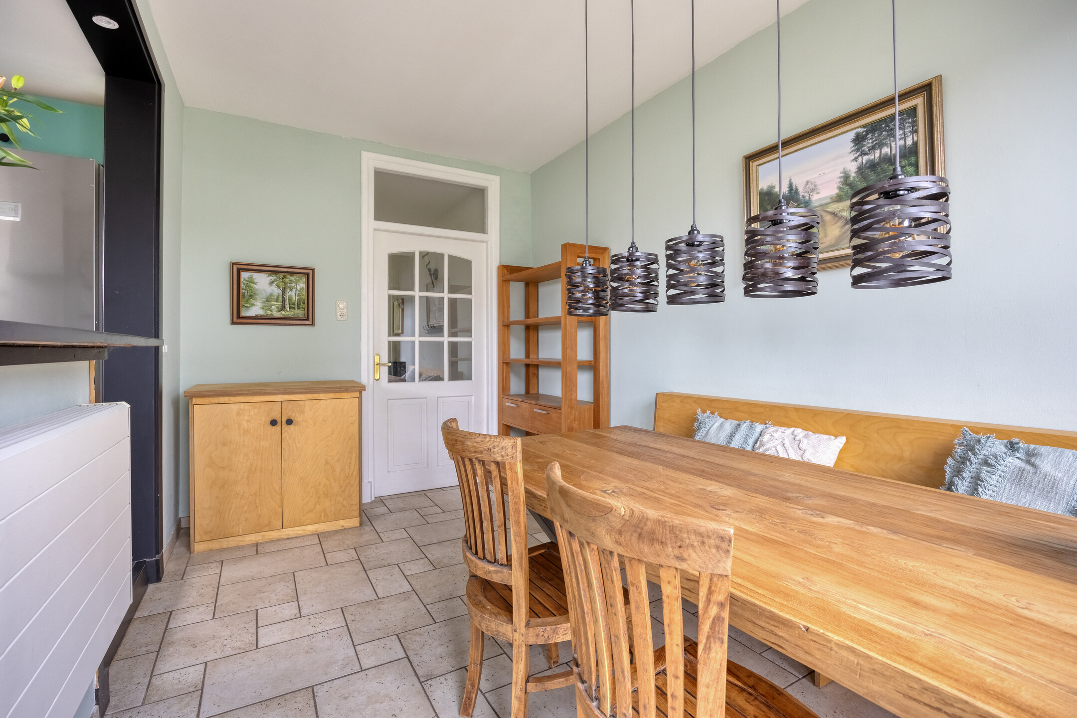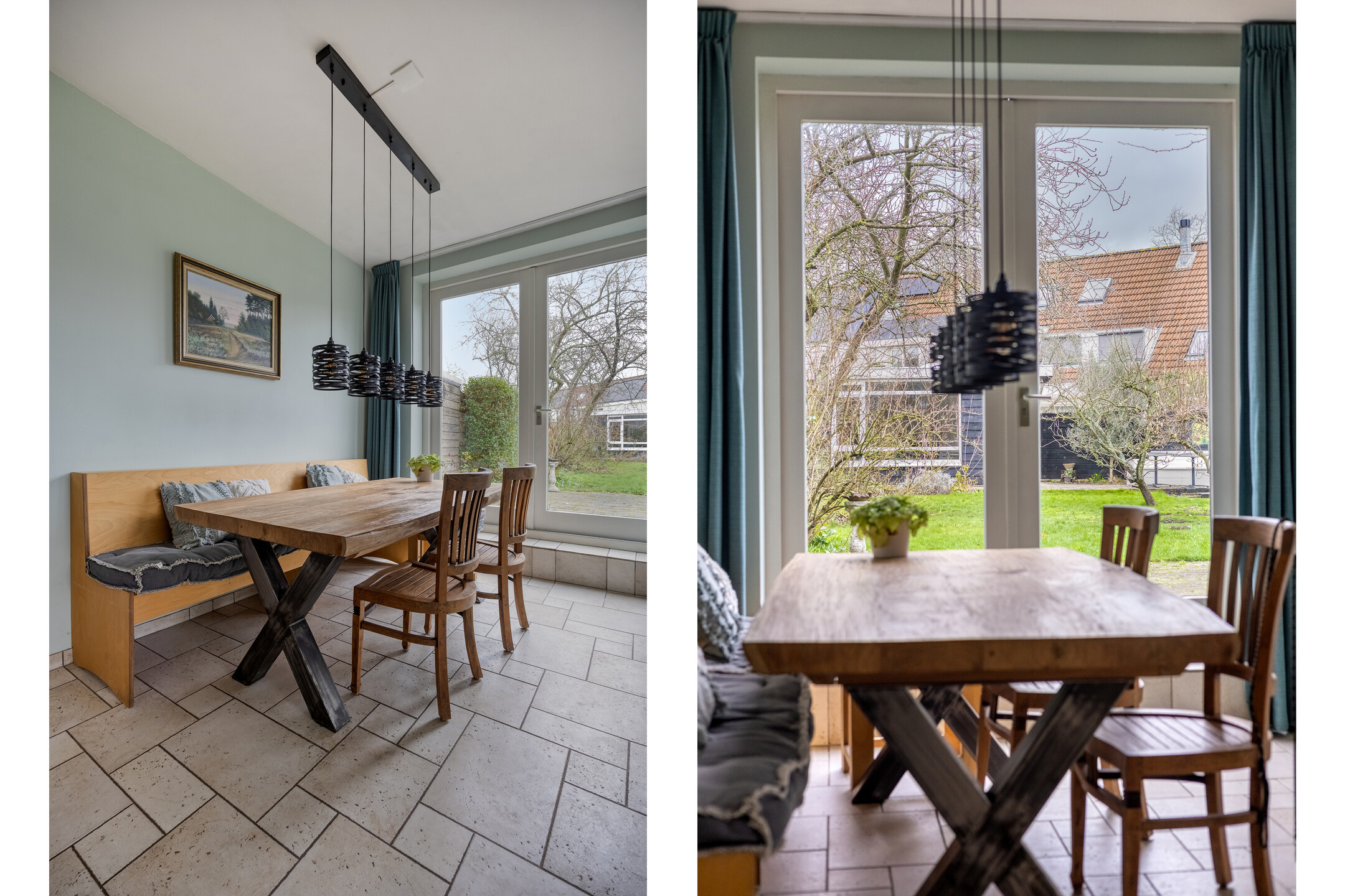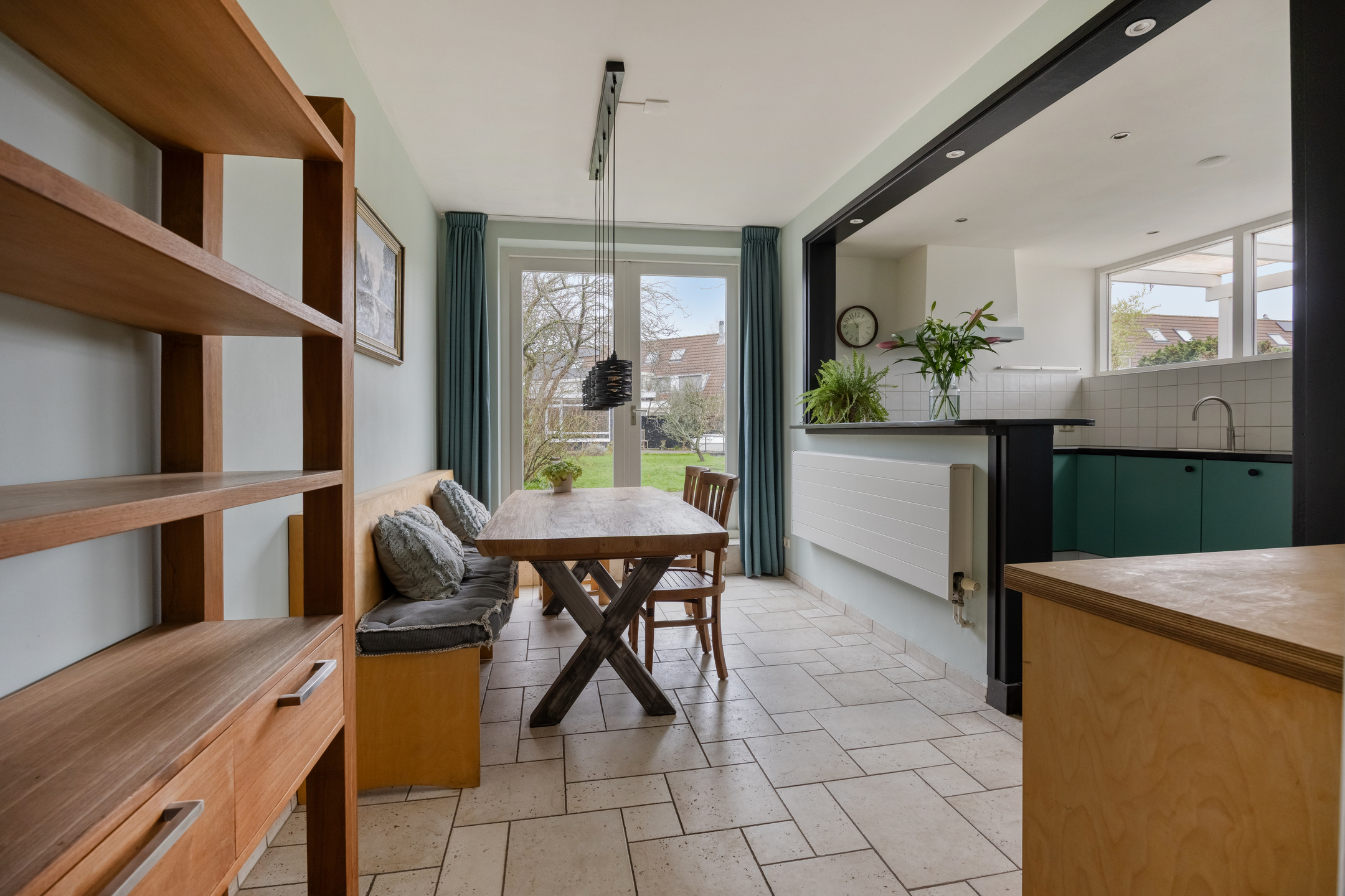 Verder naar achteren in de woning vindt u het gemoderniseerde, half betegelde toilet met fonteintje en de trapopgang naar de eerste verdieping. In de uitbouw aan de achterzijde bevindt zich de keuken, die in 2022 is vernieuwd. Deze is uitgevoerd met een stenen werkblad en voorzien van diverse inbouwapparatuur, waaronder een Quooker, koelkast, vriezer, afzuigkap en een zes-pits Boretti gasfornuis met oven.