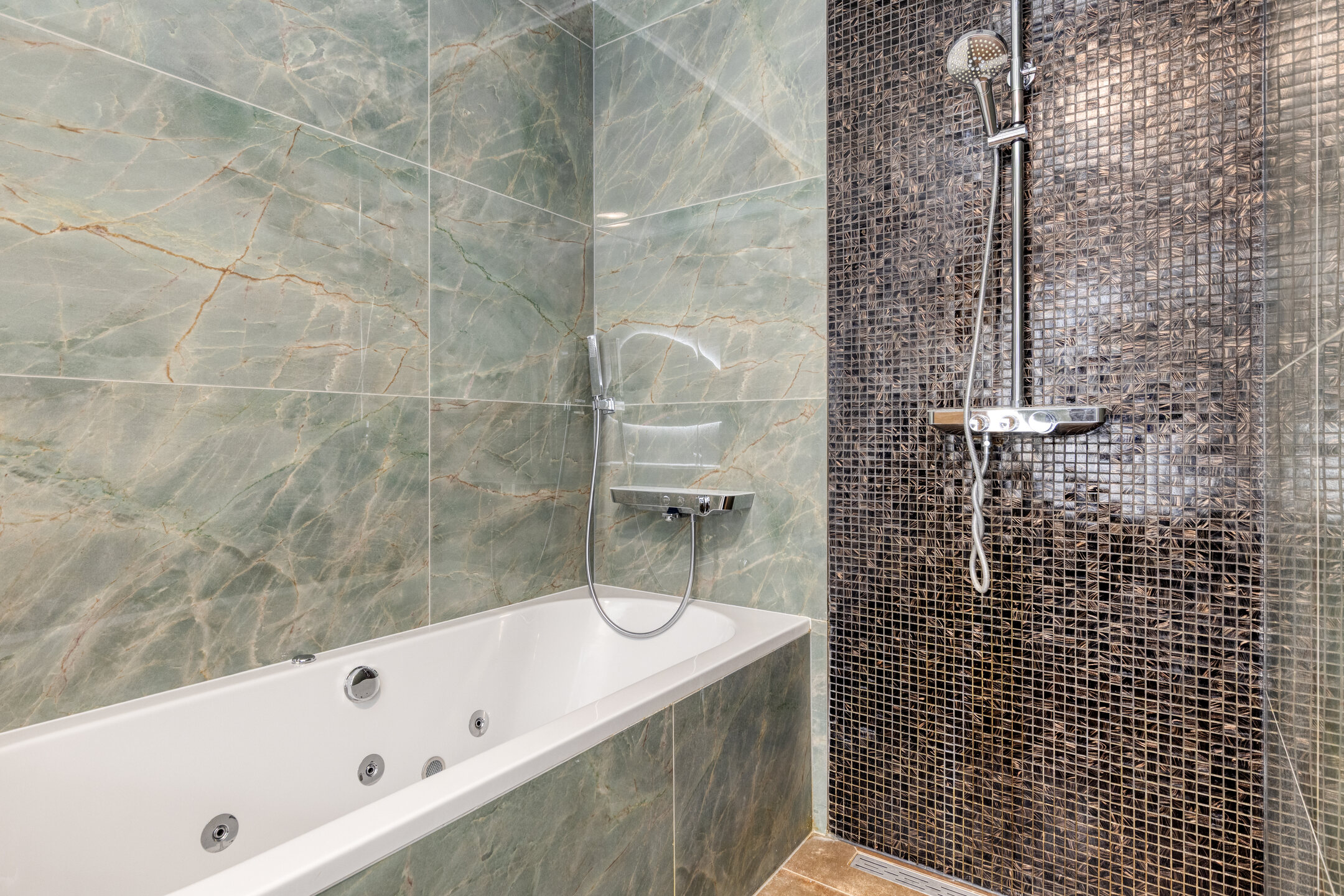 De moderne badkamer (vernieuwd in 2024) is luxe uitgevoerd en voorzien van een ligbad, separate douche en een dubbele wastafel. Ook het toilet is in 2024 vernieuwd en stijlvol afgewerkt.